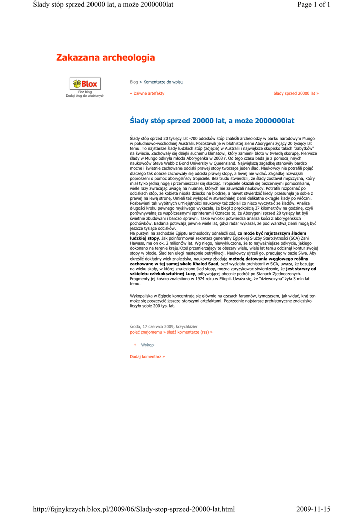 Ślady stóp sprzed 20000 lat, a moŜe 2000000lat Page 1 of 1 Zakazana archeologia Blog > Komentarze do wpisu Pisz blog Dodaj blog do ulubionych « Dziwne artefakty Ślady sprzed 20000 lat » Ślady stóp sprzed 20000 lat, a moŜe 2000000lat Ślady stóp sprzed 20 tysięcy lat -700 odcisków stóp znaleźli archeolodzy w parku narodowym Mungo w południowo-wschodniej Australii. Pozostawili je w błotnistej ziemi Aborygeni Ŝyjący 20 tysięcy lat temu. To najstarsze ślady ludzkich stóp (zdjęcie) w Australii i największe skupisko takich "zabytków" na świecie. Zachowały się dzięki suchemu klimatowi, który zamienił błoto w twardą skorupę. Pierwsze ślady w Mungo odkryła młoda Aborygenka w 2003 r. Od tego czasu bada je z pomocą innych naukowców Steve Webb z Bond University w Queensland. Największą zagadkę stanowiły bardzo mocne i świetnie zachowane odciski prawej stopy tworzące jeden ślad. Naukowcy nie potrafili pojąć dlaczego tak dobrze zachowały się odciski prawej stopy, a lewej nie widać. Zagadkę rozwiązali poproszeni o pomoc aborygeńscy tropiciele. Bez trudu stwierdzili, Ŝe ślady zostawił męŜczyzna, który miał tylko jedną nogę i przemieszczał się skacząc. Tropiciele okazali się bezcennymi pomocnikami, wiele razy zwracając uwagę na niuanse, których nie zauwaŜali naukowcy. Potrafili rozpoznać po odciskach stóp, Ŝe kobieta niosła dziecko na biodrze, a nawet stwierdzić kiedy przesunęła je sobie z prawej na lewą stronę. Umieli teŜ wyłapać w stwardniałej ziemi delikatne okrągłe ślady po włóczni. Pozbawieni tak wybitnych umiejętności naukowcy teŜ zdołali co nieco wyczytać ze śladów. Analiza długości kroku pewnego myśliwego wykazała, Ŝe biegł z prędkością 37 kilometrów na godzinę, czyli porównywalną ze współczesnymi sprinterami! Oznacza to, Ŝe Aborygeni sprzed 20 tysięcy lat byli świetnie zbudowani i bardzo sprawni. Takie wnioski potwierdza analiza kości z aborygeńskich pochówków. Badania potrwają pewnie wiele lat, gdyŜ radar wykazał, Ŝe pod warstwą ziemi mogą być jeszcze tysiące odcisków. Na pustyni na zachodzie Egiptu archeolodzy odnaleźli coś, co moŜe być najstarszym śladem ludzkiej stopy. Jak poinformował sekretarz generalny Egipskiej SłuŜby StaroŜytności (SCA) Zahi Hawass, ma on ok. 2 milionów lat. Wg niego, niewykluczone, Ŝe to najwaŜniejsze odkrycie, jakiego dokonano na terenie kraju.Ktoś przemierzający te obszary wiele, wiele lat temu odcisnął kontur swojej stopy w błocie. Ślad ten uległ następnie petryfikacji. Naukowcy ujrzeli go, pracując w oazie Siwa. Aby określić dokładny wiek znaleziska, naukowcy zbadają metodą datowania węglowego rośliny zachowane w tej samej skale.Khaled Saad, szef wydziału prehistorii w SCA, uwaŜa, Ŝe bazując na wieku skały, w której znaleziono ślad stopy, moŜna zaryzykować stwierdzenie, Ŝe jest starszy od szkieletu człekokształtnej Lucy, odbywającej obecnie podróŜ po Stanach Zjednoczonych. Fragmenty jej kośćca znaleziono w 1974 roku w Etiopii. UwaŜa się, Ŝe "dziewczyna" Ŝyła 3 mln lat temu. Wykopaliska w Egipcie koncentrują się głównie na czasach faraonów, tymczasem, jak widać, kraj ten moŜe się poszczycić jeszcze starszymi artefaktami. Poprzednie najstarsze prehistoryczne znalezisko liczyło sobie 200 tys. lat. środa, 17 czerwca 2009, krzychkizier poleć znajomemu » śledź komentarze (rss) » + Wykop Dodaj komentarz » http://fajnykrzych.blox.pl/2009/06/Slady-stop-sprzed-20000-lat.html 2009-11-15