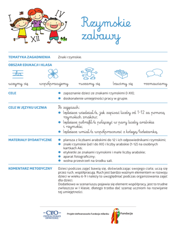 R £ zymskie zabawy TEMATYKA ZAGADNIENIA Znaki rzymskie. OBSZAR EDUKACJI I KLASA uczymy się współpracujemy ruszamy się bawimy się CELE zapoznanie dzieci ze znakami rzymskimi (I-XII); doskonalenie umiejętności pracy w grupie. rozmawiamy Po zajęciach: będziesz wiedział/a, jak zapisać liczby od 1-12 za pomocą rzymskich znaków; będziesz potrafił/a połączyć w pary liczby arabskie i rzymskie; będziesz umiał/a współpracować z kolegą/koleżanką. CELE W JĘZYKU UCZNIA MATERIAŁY DYDAKTYCZNE KOMENTARZ METODYCZNY plansza z liczbami arabskimi do 12 i ich odpowiednikami rzymskimi; znaki rzymskie (od I do XII) i liczby arabskie (1-12) na osobnych kartkach A6; etykietki ze znakami rzymskimi i małe liczby arabskie; aparat fotograficzny; wolna przestrzeń na środku sali. Dzieci podczas zajęć bawią się, doświadczając swojego ciała; uczą się przez ruch, współpracują. Ruch jest bardzo ważnym elementem w rozwoju dzieci w wieku 6-9 i należy to uwzględniać podczas organizowania zajęć dla dzieci. Dodatkowo w scenariuszu pojawia się element współpracy, jest to trudne zwłaszcza w I klasie, dlatego trzeba dać szansę uczniom na rozwijanie tej umiejętności. Projekt dofinansowała Fundacja mBanku MOŻLIWOŚCI KONTYNUACJI Możesz zaproponować dzieciom, by wykonały z plasteliny kolejne liczby I DALSZE INSPIRACJErzymskie. Jeśli macie kalendarz roczny w klasie, zdjęcia rzymskich liczb możecie wykorzystywać w każdym miesiącu, przyczepiając zdjęcie z odpowiednim numerem miesiąca na kalendarzu. ORGANIZACJA PRACY UCZNIÓW 1 Przygotuj przed lekcją klasę: do krzesełek podczepiaj etykietki ze znakami rzymskimi (na potrzeby ostatniego ćwiczenia możesz to przygotować w taki sposób, aby krzesełka były ustawione w 5 grupach po 5 krzesełek, najlepiej w kątach sali, tak by środek był wolny); w koszyczku przygotuj karteczki z liczbami arabskimi (tak, aby każda rzymska liczba miała swój arabski odpowiednik; jeśli np. będzie 5 krzesełek z liczbą V – to w koszyczku musi się znaleźć 5 karteczek z liczbą arabską – 5) . Na tablicy zawieś planszę. 2 Po wejściu dzieci do klasy zaproś je do kręgu i omów z nimi planszę, na której są przedstawione znaki rzymskie i ich odpowiedniki arabskie. Zapytaj, czy dostrzegają jakąś prawidłowość (1 – to 1 kreska, 2 – to dwie kreski; kreski powtarzają się także przy pozostałych). Zwróć uwagę dzieci na liczby IV, V i VI (podobieństwa i różnice). 3 Po tym wprowadzeniu dzieci (przy twojej pomocy oraz korzystając z zawieszonej planszy) na środku kręgu układają pary liczb arabskich z rzymskimi w dwóch kolumnach obok siebie (wykorzystujesz do tego kartki A6, wcześniej przygotowane). Po krótkim przyjrzeniu się układowi kart poproś ochotnika, który po wymieszaniu kart z liczbami ponownie je uporządkuje. Ćwiczenie to możesz poprowadzić 2-3-krotnie. 4 Rozdaj dzieciom małe karteczki z cyframi arabskimi. Ich zadaniem jest znalezienie krzesełka z odpowiadającym ich liczbie znakowi rzymskiemu. Jeśli przygotowałeś/aś salę w taki sposób, jak zasugerowaliśmy na początku, dzieci powinny skupić się w 5 grupach. Zadaniem grup będzie zbudowanie płaskorzeźby wskazanych przez nauczyciela znaków rzymskich z własnych ciał na podłodze. Pokazujesz jednej z grup (tak, by nie widziały tego pozostałe dzieci) liczbę arabską, którą mają przedstawić jako znak rzymski. Reszta dzieci jest ekspertami, odgaduje znak i ocenia wykonanie zadania, co dokumentowane jest zdjęciem. Kolejno pokazujesz różne cyfry poszczególnym grupom, tak by ze zdjęć powstała galeria 12 znaków rzymskich. Projekt dofinansowała Fundacja mBanku