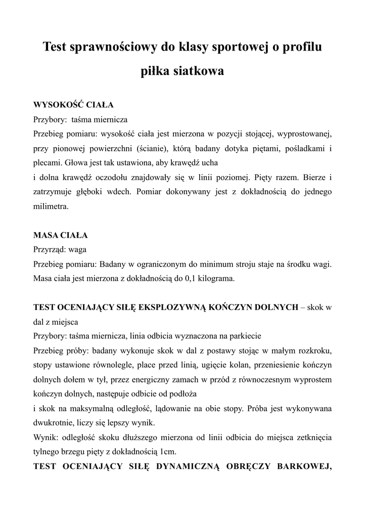Test sprawnościowy do klasy sportowej o profilu piłka siatkowa WYSOKOŚĆ CIAŁA Przybory: taśma miernicza Przebieg pomiaru: wysokość ciała jest mierzona w pozycji stojącej, wyprostowanej, przy pionowej powierzchni (ścianie), którą badany dotyka piętami, pośladkami i plecami. Głowa jest tak ustawiona, aby krawędź ucha i dolna krawędź oczodołu znajdowały się w linii poziomej. Pięty razem. Bierze i zatrzymuje głęboki wdech. Pomiar dokonywany jest z dokładnością do jednego milimetra. MASA CIAŁA Przyrząd: waga Przebieg pomiaru: Badany w ograniczonym do minimum stroju staje na środku wagi. Masa ciała jest mierzona z dokładnością do 0,1 kilograma. TEST OCENIAJĄCY SIŁĘ EKSPLOZYWNĄ KOŃCZYN DOLNYCH – skok w dal z miejsca Przybory: taśma miernicza, linia odbicia wyznaczona na parkiecie Przebieg próby: badany wykonuje skok w dal z postawy stojąc w małym rozkroku, stopy ustawione równolegle, place przed linią, ugięcie kolan, przeniesienie kończyn dolnych dołem w tył, przez energiczny zamach w przód z równoczesnym wyprostem kończyn dolnych, następuje odbicie od podłoża i skok na maksymalną odległość, lądowanie na obie stopy. Próba jest wykonywana dwukrotnie, liczy się lepszy wynik. Wynik: odległość skoku dłuższego mierzona od linii odbicia do miejsca zetknięcia tylnego brzegu pięty z dokładnością 1cm. TEST OCENIAJĄCY SIŁĘ DYNAMICZNĄ OBRĘCZY BARKOWEJ, GRZBIETU I BRZUCHA – rzut piłką lekarską oburącz z klęku prostego Przybory: piłka lekarska 1 kg, taśma miernicza, materac Przebieg próby: badany w klęku obunóż na środku materaca (środek zaznaczony linią), wykonuje rzut piłką lekarską oburącz zza głowy. Po rzucie może zostać wykonany pad w przód. Próba powtarzana jest trzykrotnie. Wynik: odległość uzyskana w najlepszym rzucie, mierzona od linii na materacu do miejsca pierwszego kontaktu piłki z podłożem. TEST OCENIAJĄCY KOORDYNACJĘ SZYBKĄ –step test Przybory: stoper, 3 linie równoległe wyznaczone na parkiecie w odległości 80cm Przebieg próby: badany ustawiony na linii środkowej, tak, aby linia znajdowała się między stopami. Na sygnał wykonywane są przeskoki obunóż z linii na linię. Kierunek pierwszego skoku (w prawo, w lewo) dowolny. Wynik: ilość skoków, w których po wylądowaniu linia była między stopami badanego, wykonanych w czasie 20 s. TEST OCENIAJĄCY SZYBKOŚĆ REAKCJI - Jest to próba, w której mierzy się szybkość reakcji – jak już napisano, niezwykle ważny aspekt koordynacji ruchowej w tenisie stołowym. Badany siedzi okrakiem na krześle twarzą do oparcia, na którym kładzie przedramię (opierając je w połowie długości), cztery palce ręki są wyprostowane i zwarte a kciuk odwiedziony. Testujący trzyma laskę o średnicy i długości 50 cm, na której zaznaczona jest podziałka centymetrowa na całej długości. Dolny koniec laski (0 cm) znajduje się na wysokości dolnej krawędzi dłoni badanego w odległości ok. 1 cm od jego ręki. Testujący puszcza laskę w dowolnym momencie. Zadaniem badanego jest, poprzez zaciśnięcie dłoni, chwycić laskę. Mierzona jest odległość od punktu 0 do miejsca chwytu (dolna krawędź). SKOCZNOŚĆ. Próba polega na pomiarze odległości pomiędzy zasięgiem wyciągniętej ręki w postawie stojącej a zasięgiem wyciągniętej ręki w wyskoku dosiężnym po odbiciu obunóż z miejsca. Uzyskaną różnicę przelicza się na wartości punktowe od 0- 10. TEST OCENIAJĄCY SZYBKOŚĆ I ZWINNOŚĆ Bieg wahadłowy 10x5m z maksymalną szybkością i zmianami kierunku. Sposób wykonania: badany na sygnał "start" biegnie jak najszybciej do drugiej linii odległej o 5m i wraca przekraczając obydwie linie stopami; odległość tą pokonuje 10 razy. Wynik testu: czas potrzebny do pokonania pełnych 10 odcinków z dokładnością do 0,1 sekundy.