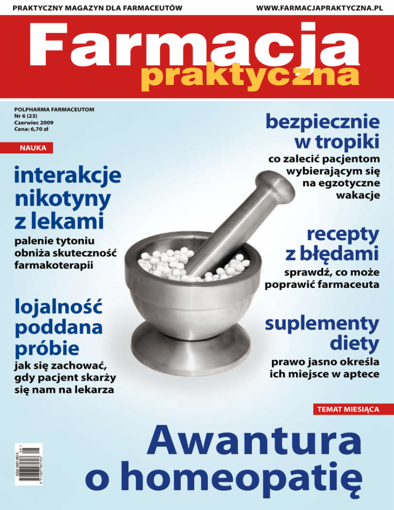 PRAKTYCZNY MAGAZYN DLA FARMACEUTÓW POLPHARMA FARMACEUTOM Nr 6 (23) Czerwiec 2009 Cena: 6,70 zł NAUKA interakcje nikotyny z lekami palenie tytoniu obniża skuteczność farmakoterapii lojalność poddana próbie jak się zachować, gdy pacjent skarży się nam na lekarza WWW.FARMACJAPRAKTYCZNA.PL bezpiecznie w tropiki co zalecić pacjentom wybierającym się na egzotyczne wakacje recepty z błędami sprawdź, co może poprawić farmaceuta suplementy diety prawo jasno określa ich miejsce w aptece TEMAT MIESIĄCA Awantura o homeopatię Nr 6(23) czerwiec 2009 18 20 Aktualności 5 Informacje 8 Ciekawostki 10 Raport: Awantura o homeopatię Spór między Naczelną Radą Lekarską a Ministerstwem Zdrowia o zasadność stosowania leków homeopatycznych przybiera na sile. 26Wpływ nikotyny na wchłanianie leków farmaceutyczna 15Perindopril w chorobach kardiologicznych Badania dowodzą jego wysokiej skuteczności w leczeniu nadciśnienia tętniczego i choroby wieńcowej. 18 Ruszyła kolejna edycja EPE – AFP Szkolenia Akademii Farmacji Praktycznej dają szansę na zdobycie tzw. „twardych punktów”. 20 B ezpiecznie w tropiki Co zalecić pacjentom wybierającym się na egzotyczne wakacje. 22 L ojalność poddana próbie Jak się zachować, gdy pacjent w naszej obecności zaczyna skarżyć się na lekarza? Prawo 14Suplementy diety w aptece Zasady prawidłowej, czyli zgodnej z prawem ekspozycji suplementów diety w aptece wyjaśnia mgr farm. Małgorzata Szelachowska, Mazowiecki Wojewódzki Inspektor Farmaceutyczny w Warszawie. „Farmacja Praktyczna” 22 Opieka 12 Sonda: Homeopatia – lek czy placebo? Konsekwencje awantury o homeopatię mogą mieć w przyszłości bezpośrednie przełożenie na praktykę farmaceutyczną – tym bardziej, że swoje stanowisko w tej sprawie zajęła już Naczelna Izba Aptekarska. Spis treści Prowadzenie apteki 24Błędy na receptach – co farmaceuta może poprawić Sprawdź, jakie recepty są kwestionowane przez NFZ i które z błędów pojawiających się na receptach może poprawić farmaceuta. Redaktor merytoryczna: Barbara Misiewicz-Jagielak Redaguje zespół: Dominika Bandurska, Lilianna Bartowska -Lewicka, Marta Gawrylik, Justyna Grudniak, Maciej Jarosz, Monika Jasłowska, Magdalena Mikulska, Barbara Misiewicz-Jagielak, Joanna Ordańska, Bożenna Płatos, Artur Schab, Izabela Sundmann. Nauka Palenie tytoniu obniża skuteczność farmakoterapii. 28Indapamid w walce z nadciśnieniem 60 proc. populacji powyżej 60. r.ż. ma nadciśnienie tętnicze. 31Metamizol zweryfikowany Wyniki najnowszych badań oceniających profil bezpieczeństwa metamizolu. Życie jest piękne 34 Metamorfozy 36 Parmigiano Reggiano – krucha muza poetów 37 Kuchnia farmaceutyczna 38 Pływaj zdrów! 39 Z życia farmaceuty Zabawne historie z codziennej praktyki. 40 Recenzje książek, filmów i płyt 42 Krzyżówka Na zlecenie: Polpharma Biuro Handlowe Sp. z o.o., ul. Bobrowiecka 6, 00-728 Warszawa Wydawca: Valkea Media S.A., ul. Elbląska 15/17, 01-747 Warszawa Redaktor naczelny: Łukasz Kuźmiński Dyrektor projektu: Tomasz Opiela Projekt graficzny: Wojciech Jastrzębski zdjęcia: istockphoto/stocxpert/dreamstime/123RF www.farmacjapraktyczna.pl 3 Edytorial Szanowni Państwo! Spór o homeopatię, jaki toczy się między Naczelną Radą Lekarską a Ministerstwem Zdrowia, przybiera na sile. Przedstawiciele Izby tłumaczą, że leki homeopatyczne to substancje o zerowej skuteczności i jako takie nie powinny być ordynowane pacjentom. Tu Izba podpiera się etyką zawodową, która zabrania lekarzom zalecania preparatów o niepotwierdzonym działaniu. Resort odpiera te zarzuty, mówiąc, że skoro leki homeopatyczne zostały dopuszczone na polski rynek, to lekarze mogą, a nawet powinni przepisywać je chorym. Głos w sprawie zabrała też Naczelna Izba Aptekarska, opowiadając się po stronie Ministerstwa. Strony zaciekle bronią swoich stanowisk, co oddala możliwość osiągnięcia porozumienia. Konflikt trwa i warto mu się bacznie przyglądać – co niniejszym czynimy na łamach czerwcowej „Farmacji Praktycznej”, bo jego konsekwencje będą miały w przyszłości bezpośrednie przełożenie na praktykę farmaceutyczną. W tym wydaniu naszego magazynu znajdą Państwo również artykuł dotyczący zasad prawidłowej, czyli zgodnej z prawem ekspozycji suplementów diety w aptece oraz tekst dotykający problemu lojalności zawodowej. Jego lektura dostarczy Państwu cennych porad, jak zachować się w sytuacji, kiedy pacjent w Waszej obecności narzeka na lekarza. Ponadto polecamy artykuł o tym, które z błędów na receptach ma prawo korygować farmaceuta oraz tekst poświęcony interakcjom nikotyny z lekami, z którego wynika, że palenie tytoniu może obniżać skuteczność prowadzonej farmakoterapii. Zachęcamy do odwiedzenia naszej strony www.farmacjapraktyczna.pl. Oprócz tekstów z drukowanej wersji naszego magazynu znajdą tam Państwo wiele ciekawych artykułów na temat diety, stylu życia i kultury. mgr farm. Barbara Misiewicz-Jagielak Serdecznie zapraszamy do lektury! Redaktor Merytoryczna „Farmacji Praktycznej” 4 Farmacja Praktyczna 6 / 2009 Informacje Fundusz ma coraz mniej pieniędzy Leczenie WZW B odbiega od wytycznych Narodowy Fundusz Zdrowia alarmuje, że nie zapłaci placówkom medycznym za leczenie pacjentów poza wyznaczonym limitem zabiegów. Pacjenci obawiają się, że kolejki do specjalistów będą coraz dłuższe – donosi serwis RynekZdrowia.pl. Z danych, jakie przedstawia Ministerstwo Pracy i Polityki Społecznej wynika, że coraz więcej Polaków jest bez pracy. Do końca kwietnia było ich już 1,7 mln. Wzrost liczby osób, które są bezrobotne powoduje wpływ mniejszych środków z tytułu składek zdrowotnych. Kryzys gospodarczy sprawił, że nawet ci, którzy pracują, zarabiają z reguły mniej i składki zdrowotne odprowadzane przez pracodawców są również mniejsze. Przez trzy pierwsze miesiące 2009 r. do budżetu NFZ wpłynęło ze