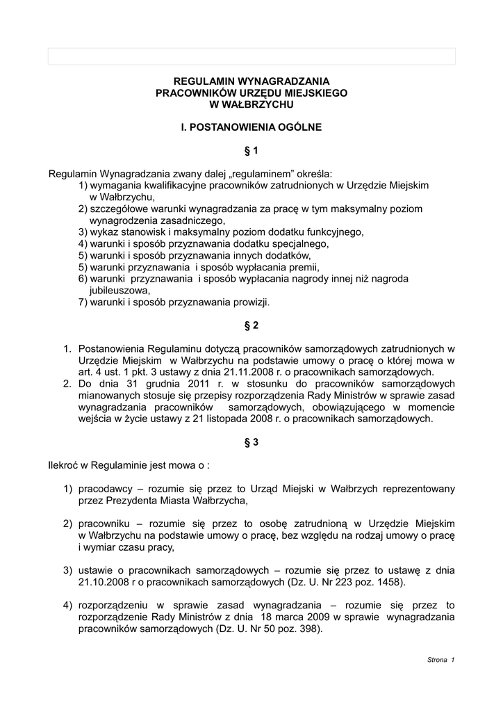 REGULAMIN WYNAGRADZANIA PRACOWNIKÓW URZĘDU MIEJSKIEGO W WAŁBRZYCHU I. POSTANOWIENIA OGÓLNE §1 Regulamin Wynagradzania zwany dalej „regulaminem” określa: 1) wymagania kwalifikacyjne pracowników zatrudnionych w Urzędzie Miejskim w Wałbrzychu, 2) szczegółowe warunki wynagradzania za pracę w tym maksymalny poziom wynagrodzenia zasadniczego, 3) wykaz stanowisk i maksymalny poziom dodatku funkcyjnego, 4) warunki i sposób przyznawania dodatku specjalnego, 5) warunki i sposób przyznawania innych dodatków, 5) warunki przyznawania i sposób wypłacania premii, 6) warunki przyznawania i sposób wypłacania nagrody innej niż nagroda jubileuszowa, 7) warunki i sposób przyznawania prowizji. §2 1. Postanowienia Regulaminu dotyczą pracowników samorządowych zatrudnionych w Urzędzie Miejskim w Wałbrzychu na podstawie umowy o pracę o której mowa w art. 4 ust. 1 pkt. 3 ustawy z dnia 21.11.2008 r. o pracownikach samorządowych. 2. Do dnia 31 grudnia 2011 r. w stosunku do pracowników samorządowych mianowanych stosuje się przepisy rozporządzenia Rady Ministrów w sprawie zasad wynagradzania pracowników samorządowych, obowiązującego w momencie wejścia w życie ustawy z 21 listopada 2008 r. o pracownikach samorządowych. §3 Ilekroć w Regulaminie jest mowa o : 1) pracodawcy – rozumie się przez to Urząd Miejski w Wałbrzych reprezentowany przez Prezydenta Miasta Wałbrzycha, 2) pracowniku – rozumie się przez to osobę zatrudnioną w Urzędzie Miejskim w Wałbrzychu na podstawie umowy o pracę, bez względu na rodzaj umowy o pracę i wymiar czasu pracy, 3) ustawie o pracownikach samorządowych – rozumie się przez to ustawę z dnia 21.10.2008 r o pracownikach samorządowych (Dz. U. Nr 223 poz. 1458). 4) rozporządzeniu w sprawie zasad wynagradzania – rozumie się przez to rozporządzenie Rady Ministrów z dnia 18 marca 2009 w sprawie wynagradzania pracowników samorządowych (Dz. U. Nr 50 poz. 398). Strona 1 II. WYNAGRODZENIE ZASADNICZE §4 1. U pracodawcy obowiązuje czasowy system wynagradzania. 2. Pracownikowi przysługuje wynagrodzenie stosowne do zajmowanego stanowiska oraz posiadanych kwalifikacji zawodowych określonych w załączniku nr 1. 3. Decyzję o zastosowaniu dla danego pracownika kategorii i stawki osobistego zaszeregowania podejmuje pracodawca na wniosek Naczelnika Wydziału/ Kierownika Biura, w granicach określonych w załączniku nr 2 III. DODATKI DO WYNAGRODZENIA ZA PRACĘ §5 Dodatek funkcyjny Pracownikom zatrudnionym na stanowiskach określonych w tabeli stanowiącej załącznik nr 3 do niniejszego regulaminu przysługuje dodatek funkcyjny w wysokości nie przekraczającej stawki przyporządkowanej dla danego stanowiska wg załącznika nr 4. §6 Dodatek specjalny 1. Z tytułu okresowego zwiększenia obowiązków służbowych lub powierzenia dodatkowych zadań o wysokim stopniu złożoności lub odpowiedzialności pracodawca może przyznać pracownikowi dodatek specjalny. 2. Dodatek specjalny może zostać przyznany na czas określony, również ze względu na zakres wykonywanych zadań i charakter pracy. 3. Dodatek specjalny jest ustalany i przyznawany w kwocie nie przekraczającej 40% łącznie wynagrodzenia zasadniczego i dodatku funkcyjnego pracownika. §7 Dodatek za prowadzenie projektów 1. Pracownikowi, który wykonuje zadania związane z kierowaniem realizacją projektu lub współuczestniczy w realizacji projektu, może zostać przyznany dodatek za pracę związane z projektem. 2. Dodatek o którym mowa w ust. 1 może zostać przyznany na czas określony wynikający z czasu trwania projektu bądź określonych projektem zadań. 3. Wysokość dodatku jest uzależniona od: - wysokości środków finansowych przewidzianych na realizację projektu, w tym na wynagrodzenia osób realizujących projekt, - nakładu pracy wnoszonego przez współuczestników projektu, - kwot wnioskowanych przez kierownika projektu lub Naczelnika Wydziału/ Kierownika Biura. 4. Zapisy pkt 1-3 nie dotyczą osób zatrudnionych na stanowisku kierownika projektu lub koordynatora projektu. Strona 2 §8 Dodatek opiekuna w służbie przygotowawczej 1. Opiekunowi pracownika skierowanego do służby przygotowawczej,może zostać przyznany jednorazowy dodatek za opiekę nad każdym pracownikiem w służbie przygotowawczej, który zda egzamin kończący służbę przygotowawczą w kwocie 300 zł jednak jednorazowo nie więcej niż 600 zł. 2. Dodatek wypłacany jest łącznie z wynagrodzeniem w miesiącu następującym po miesiącu w którym pracownik zdał egzamin kończący służbę przygotowawczą i została z nim zawarta umowa o pracę na czas nieokreślony. 3. Dokument potwierdzający przyznanie dodatku wystawa Biuro Spraw Pracowniczych i przekazuje Działowi Finansowemu w celu naliczenia i wypłaty. §9 Premia 1. Dla pracowników zatrudnionych na stanowiskach pomocniczych i obsługi, tworzy się, w ramach posiadanych środków na wynagrodzenia, fundusz premiowy w wysokości 15% wynagrodzenia zasadniczego pracowników na stanowiskach pomocniczych i obsługi. 2. Wysokość premii dla pracownika może wynieść do 15% miesięcznego wynagrodzenia zasadniczego i może być przyznana w szczególnie uzasadnionych przypadkach, związanych z: - dokonaniem usprawnień w organizacji pracy, - inicjowaniem zadań mających wpływ na polepszenie stanu technicznego lub wyglądu estetycznego pomieszczeń i wyposażenia, - zdobycia i udokumentowania przez pracownika dodatkowych kwalifikacji przydatnych do pracy na zajmowanym stanowisku, - wyjątkowo wysokiej wydajności indywidualnej pracy. 3. Premia ma charakter uznaniowy i nie może stanowić roszczenia pracownika o jej przyznanie i wypłatę. 4. Z wnioskiem o przyznanie i wypłatę premii występuje bezpośredni przełożony. § 10 Nagroda uznaniowa 1. Pracodawca tworzy fundusz nagród w wysokości do 5% z wydatków przewidzianych na wynagrodzenia z angaży, określonych na dany rok budżetowy. 2. Fundusz nagród może być zwi