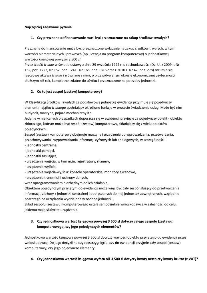 Najczęściej zadawane pytania 1. Czy przyznane dofinansowanie musi być przeznaczone na zakup środków trwałych? Przyznane dofinansowanie może być przeznaczone wyłącznie na zakup środków trwałych, w tym wartości niematerialnych i prawnych (np. licencja na program komputerowy) o jednostkowej wartości księgowej powyżej 3 500 zł. Przez środki trwałe w świetle ustawy z dnia 29 września 1994 r. o rachunkowości (Dz. U. z 2009 r. Nr 152, poz. 1223, Nr 157, poz. 1241 i Nr 165, poz. 1316 oraz z 2010 r. Nr 47, poz. 278) rozumie się rzeczowe aktywa trwałe i zrównane z nimi, o przewidywanym okresie ekonomicznej użyteczności dłuższym niż rok, kompletne, zdatne do użytku i przeznaczone na potrzeby jednostki. 2. Co to jest zespół (zestaw) komputerowy? W Klasyfikacji Środków Trwałych za podstawową jednostkę ewidencji przyjmuje się pojedynczy element majątku trwałego spełniający określone funkcje w procesie świadczenia usług. Może być nim budynek, maszyna, pojazd mechaniczny itp. Jedynie w nielicznych przypadkach dopuszcza się w ewidencji przyjęcie za pojedynczy obiekt - obiektu zbiorczego, którym może być zespół (zestaw) komputerowy, składający się z wielu obiektów pojedynczych. Zespół (zestaw) komputerowy obejmuje maszyny i urządzenia do wprowadzania, przetwarzania, przechowywania i wyprowadzania informacji cyfrowych lub analogowych, w szczególności: - jednostki centralne, - jednostki pamięci, - jednostki zasilające, - urządzenia wejścia, w tym m.in. rejestratory, skanery, - urządzenia wyjścia, - urządzenia wejścia-wyjścia: konsole operatorskie, monitory ekranowe, - urządzenia transmisji i ochrony danych, wraz oprogramowaniem niezbędnym do ich działania. Obiektem pojedynczym przyjętym do ewidencji może więc być cały zespół służący do przetwarzania informacji, złożony z jednostki centralnej i podłączonych do niej jednostek zewnętrznych, względnie poszczególne urządzenia wydzielone w osobne jednostki. Skład zespołu (zestawu) komputerowego ustala samodzielnie wnioskodawca w zależności od celu, jakiemu mają służyć te urządzenia. 3. Czy jednostkowa wartość księgowa powyżej 3 500 zł dotyczy całego zespołu (zestawu) komputerowego, czy jego pojedynczych elementów? Jednostkowa wartość księgowa powyżej 3 500 zł dotyczy wartości obiektu przyjętego do ewidencji przez wnioskodawcę. Do jego decyzji należy rozstrzygnięcie, czy do ewidencji przyjmie cały zespół (zestaw) komputerowy, czy jego pojedyncze elementy. 4. Czy jednostkowa wartość księgowa wyższa niż 3 500 zł dotyczy kwoty netto czy kwoty brutto (z VAT)? Jednostkową wartością księgową jest cena netto lub brutto (z VAT) zakupionego elementu, w zależności od czego, czy VAT od tego zakupu będzie odzyskany – wtedy jest to cena netto, czy też nie będzie odzyskany – wtedy jest to cena brutto. 5. Czy koszty kwalifikowane dotyczą również zakupów finansowanych z wkładu własnego? Koszty kwalifikowane dotyczą wyłącznie zakupów finansowanych z otrzymanego dofinansowania. W ramach finansowego wkładu własnego można kupić elementy nie znajdujące się w wykazie kosztów kwalifikowanych, będące częściami zespołu (zestawu) komputerowego, z wyłączeniem materiałów eksploatacyjnych. 6. Czy w ramach finansowego wkładu własnego należy wnieść wyłącznie środki na wydatki majątkowe (tzw. inwestycyjne), czy można też wnieść środki na wydatki bieżące? Celem programu jest wyposażenie wnioskodawcy w zespoły (zestawy) komputerowe o jednostkowej wartości księgowej powyżej 3 500 zł. Jeśli ten warunek zostanie spełniony, to wnioskodawca może w ramach finansowego wkładu własnego kupić dodatkowe elementy tych zespołów (zestawów) komputerowych ze środków bieżących, jeśli pozwalają na to obowiązujące go przepisy.