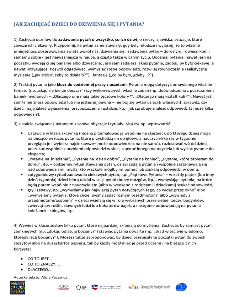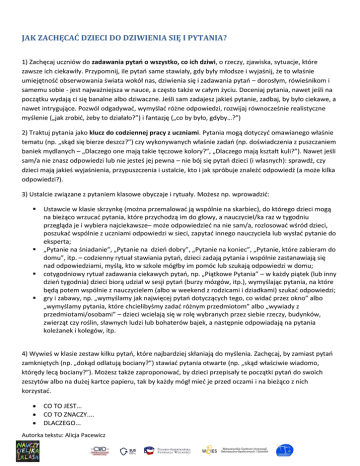 JAK ZACHĘCAĆ DZIECI DO DZIWIENIA SIĘ I PYTANIA? 1) Zachęcaj uczniów do zadawania pytań o wszystko, co ich dziwi, o rzeczy, zjawiska, sytuacje, które zawsze ich ciekawiły. Przypomnij, ile pytań same stawiały, gdy były młodsze i wyjaśnij, że to właśnie umiejętność obserwowania świata wokół nas, dziwienia się i zadawania pytań – dorosłym, rówieśnikom i samemu sobie - jest najważniejsza w nauce, a często także w całym życiu. Doceniaj pytania, nawet jeśli na początku wydają ci się banalne albo dziwaczne. Jeśli sam zadajesz jakieś pytanie, zadbaj, by było ciekawe, a nawet intrygujące. Pozwól odgadywać, wymyślać różne odpowiedzi, rozwijaj równocześnie realistyczne myślenie („jak zrobić, żeby to działało?”) i fantazję („co by było, gdyby…?”) 2) Traktuj pytania jako klucz do codziennej pracy z uczniami. Pytania mogą dotyczyć omawianego właśnie tematu (np. „skąd się bierze deszcz?”) czy wykonywanych właśnie zadań (np. doświadczenia z puszczaniem baniek mydlanych – „Dlaczego one mają takie tęczowe kolory?”, „Dlaczego mają kształt kuli?”). Nawet jeśli sam/a nie znasz odpowiedzi lub nie jesteś jej pewna – nie bój się pytań dzieci (i własnych): sprawdź, czy dzieci mają jakieś wyjaśnienia, przypuszczenia i ustalcie, kto i jak spróbuje znaleźć odpowiedź (a może kilka odpowiedzi?). 3) Ustalcie związane z pytaniem klasowe obyczaje i rytuały. Możesz np. wprowadzić: Ustawcie w klasie skrzynkę (można przemalować ją wspólnie na skarbiec), do którego dzieci mogą na bieżąco wrzucać pytania, które przychodzą im do głowy, a nauczyciel/ka raz w tygodniu przegląda je i wybiera najciekawsze– może odpowiedzieć na nie sam/a, rozlosować wśród dzieci, poszukać wspólnie z uczniami odpowiedzi w sieci, zapytać innego nauczyciela lub wysłać pytanie do eksperta; „Pytanie na śniadanie”, „Pytanie na dzień dobry”, „Pytanie na koniec”, „Pytanie, które zabieram do domu”, itp. – codzienny rytuał stawiania pytań, dzieci zadają pytania i wspólnie zastanawiają się nad odpowiedziami, myślą, kto w szkole mógłby im pomóc lub szukają odpowiedzi w domu; cotygodniowy rytuał zadawania ciekawych pytań, np. „Piątkowe Pytania” – w każdy piątek (lub inny dzień tygodnia) dzieci biorą udział w sesji pytań (burzy mózgów, itp.), wymyślając pytania, na które będą potem wspólnie z nauczycielem (albo w weekend z rodzicami i dziadkami) szukać odpowiedzi; gry i zabawy, np. „wymyślamy jak najwięcej pytań dotyczących tego, co widać przez okno” albo „wymyślamy pytania, które chcielibyśmy zadać różnym przedmiotom” albo „wywiady z przedmiotami/osobami” – dzieci wcielają się w rolę wybranych przez siebie rzeczy, budynków, zwierząt czy roślin, sławnych ludzi lub bohaterów bajek, a następnie odpowiadają na pytania koleżanek i kolegów, itp. 4) Wywieś w klasie zestaw kilku pytań, które najbardziej skłaniają do myślenia. Zachęcaj, by zamiast pytań zamkniętych (np. „dokąd odlatują bociany?”) stawiać pytania otwarte (np. „skąd właściwie wiadomo, którędy lecą bociany?”). Możesz także zaproponować, by dzieci przepisały te początki pytań do swoich zeszytów albo na dużej kartce papieru, tak by każdy mógł mieć je przed oczami i na bieżąco z nich korzystać. CO TO JEST... CO TO ZNACZY.... DLACZEGO... Autorka tekstu: Alicja Pacewicz PO CO... JAK TO SIĘ STAŁO/DZIEJE, ŻE… JAK DZIAŁA... W JAKI SPOSÓB… CO ZROBIĆ, ŻEBY... JAK SPRAWDZIĆ, CZY... SKĄD WIADOMO, ŻE... CO BY BYŁO, GDYBY... Autorka tekstu: Alicja Pacewicz