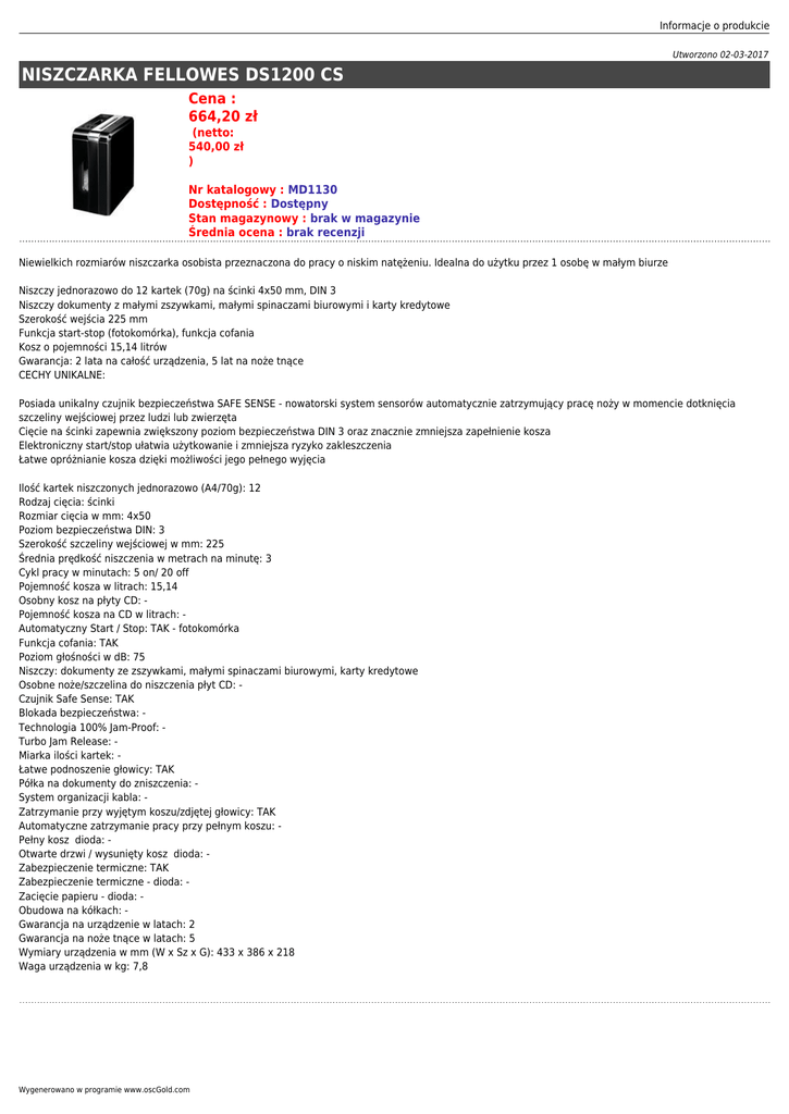 Informacje o produkcie Utworzono 02-03-2017 NISZCZARKA FELLOWES DS1200 CS Cena : 664,20 zł (netto: 540,00 zł ) Nr katalogowy : MD1130 Dostępność : Dostępny Stan magazynowy : brak w magazynie Średnia ocena : brak recenzji Niewielkich rozmiarów niszczarka osobista przeznaczona do pracy o niskim natężeniu. Idealna do użytku przez 1 osobę w małym biurze Niszczy jednorazowo do 12 kartek (70g) na ścinki 4x50 mm, DIN 3 Niszczy dokumenty z małymi zszywkami, małymi spinaczami biurowymi i karty kredytowe Szerokość wejścia 225 mm Funkcja start-stop (fotokomórka), funkcja cofania Kosz o pojemności 15,14 litrów Gwarancja: 2 lata na całość urządzenia, 5 lat na noże tnące CECHY UNIKALNE: Posiada unikalny czujnik bezpieczeństwa SAFE SENSE - nowatorski system sensorów automatycznie zatrzymujący pracę noży w momencie dotknięcia szczeliny wejściowej przez ludzi lub zwierzęta Cięcie na ścinki zapewnia zwiększony poziom bezpieczeństwa DIN 3 oraz znacznie zmniejsza zapełnienie kosza Elektroniczny start/stop ułatwia użytkowanie i zmniejsza ryzyko zakleszczenia Łatwe opróżnianie kosza dzięki możliwości jego pełnego wyjęcia Ilość kartek niszczonych jednorazowo (A4/70g): 12 Rodzaj cięcia: ścinki Rozmiar cięcia w mm: 4x50 Poziom bezpieczeństwa DIN: 3 Szerokość szczeliny wejściowej w mm: 225 Średnia prędkość niszczenia w metrach na minutę: 3 Cykl pracy w minutach: 5 on/ 20 off Pojemność kosza w litrach: 15,14 Osobny kosz na płyty CD: Pojemność kosza na CD w litrach: Automatyczny Start / Stop: TAK - fotokomórka Funkcja cofania: TAK Poziom głośności w dB: 75 Niszczy: dokumenty ze zszywkami, małymi spinaczami biurowymi, karty kredytowe Osobne noże/szczelina do niszczenia płyt CD: Czujnik Safe Sense: TAK Blokada bezpieczeństwa: Technologia 100% Jam-Proof: Turbo Jam Release: Miarka ilości kartek: Łatwe podnoszenie głowicy: TAK Półka na dokumenty do zniszczenia: System organizacji kabla: Zatrzymanie przy wyjętym koszu/zdjętej głowicy: TAK Automatyczne zatrzymanie pracy przy pełnym koszu: Pełny kosz dioda: Otwarte drzwi / wysunięty kosz dioda: Zabezpieczenie termiczne: TAK Zabezpieczenie termiczne - dioda: Zacięcie papieru - dioda: Obudowa na kółkach: Gwarancja na urządzenie w latach: 2 Gwarancja na noże tnące w latach: 5 Wymiary urządzenia w mm (W x Sz x G): 433 x 386 x 218 Waga urządzenia w kg: 7,8 Wygenerowano w programie www.oscGold.com