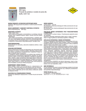GANADOL 600 mg/g Proszek do podania w wodzie do picia dla bydła, świń i kur NAZWA PRODUKTU LECZNICZEGO WETERYNARYJNEGO GANADOL 600 mg/g proszek do podania w wodzie do picia dla bydła, świń i kur SKŁAD JAKOŚCIOWY I ILOŚCIOWY SUBSTANCJI CZYNNYCH Kwas acetylosalicylowy 600 mg/g WSKAZANIA LECZNICZE Cielęta, świnie i kury: - jako środek przeciwzapalny i przeciwbólowy w przebiegu schorzeń narządu ruchu: zapalenia stawów, mięśni, nerwów oraz przy bólach mięśniowych - jako środek przeciwzapalny i przeciwgorączkowy o działaniu ogólnym oraz wspomagająco podczas stosowania chemioterapeutyków, w przebiegu ostrych chorób bakteryjnych z wysoką temperaturą ciała, a zwłaszcza w schorzeniach dróg oddechowych i narządu ruchu. PRZECIWWSKAZANIA Nadwrażliwość na salicylany, zaburzenia żołądkowo-jelitowe, skaza krwotoczna. DZIAŁANIA NIEPOŻĄDANE Wyższe dawkowanie lub dłuższy od zalecanego czas stosowania może prowadzić do choroby wrzodowej żołądka. Salicylany mogą wywoływać reakcje uczuleniowe. W sporadycznych wypadkach mogą wystąpić przypadki skazy krwotocznej. O wystąpieniu działań niepożądanych po podaniu tego produktu lub zaobserwowaniu jakichkolwiek niepokojących objawów nie wymienionych w ulotce ( w tym również objawów u człowieka na skutek kontaktu z lekiem), należy powiadomić właściwego lekarza weterynarii, podmiot odpowiedzialny lub Urząd Rejestracji Produktów Leczniczych, Wyrobów Medycznych i Produktów Biobójczych. Formularz zgłoszeniowy należy pobrać ze strony internetowej http://www.urpl.gov.pl (Pion Produktów Leczniczych Weterynaryjnych). DAWKOWANIE I DROGA PODANIA Bydło (cielęta) i świnie: 3,0-3,5 g/100 kg m.c. rozpuszczone w nie mniej niż 1 litrze wody pitnej lub karmie płynnej, dwa razy dziennie. Kury: 100 g/100 kg wody pitnej (co odpowiada 60 mg/kg m.c./dzień). Okres leczenia uzależniony jest od oceny lekarza weterynarii, jednak nie dłużej niż 10 dni. ZALECENIA DLA PRAWIDŁOWEGO PODANIA Podawać po dokładnym rozpuszczeniu w wodzie do picia lub karmie płynnej. OKRES KARENCJI Tkanki jadalne – zero dni. Nie stosować u zwierząt produkujących mleko przeznaczone do spożycia przez ludzi. Nie stosować u kur niosek produkujących jaja przeznaczone do spożycia przez ludzi. SPECJALNE ŚRODKI OSTROŻNOŚCI PRZY PRZECHOWYWANIU I TRANSPORCIE Przechowywać w suchym miejscu. Przechowywać pojemnik szczelnie zamknięty. Zawartość otwartego opakowania należy zużyć w ciągu 2 miesięcy. Zużyć w ciągu 8 godzin po rekonstytucji zgodnie z instrukcją. SPECJALNE OSTRZEŻENIA I ŚRODKI OSTROŻNOŚCI Osoby ze stwierdzoną nadwrażliwością na niesteroidowe leki przeciwzapalne (NSAID) powinny unikać kontaktu z lekiem. W przypadku kontaktu produktu ze skórą lub błonami śluzowymi należy przepłukać skażone miejsca dużą ilością wody z mydłem. Podczas stosowania kwasu acetylosalicylowego u zwierząt z dysfunkcją wątroby i nerek należy kontrolować aktywność tych narządów. Unikać podawania preparatu razem z innymi lekami z grupy niesteroidowych leków przeciwzapalnych oraz antybiotykami aminoglikozydowymi. Zachować ostrożność podczas stosowania preparatu u zwierząt, którym podaje się glikozydy nasercowe, silnie odwodnionych, osłabionych, z anemią, a także u osobników bardzo młodych – poniżej 30 dnia życia. Aby uniknąć problemów z krzepnięciem krwi nie należy stosować preparatu na 2 tygodnie przed operacjami chirurgicznymi. Produktu nie należy stosować u świń ciężarnych. Nie stosować u krów w okresie laktacji i kur w okresie nieśności. Kwas acetylosalicylowy nasila działanie niesteroidowych leków przeciwzapalnych. Produkt leczniczy GANADOL jest dobrze tolerowany, nawet w dawkach wyższych od zalecanych o połowę u cieląt, przekroczonych dwukrotnie u kur oraz trzykrotnie u świń. INNE INFORMACJE W celu uzyskania informacji na temat niniejszego produktu leczniczego weterynaryjnego, należy kontaktować się z lokalnymi przedstawicielami podmiotu odpowiedzialnego: FATRO POLSKA Sp. z o.o. ul. Bolońska 1, 55-040 Kobierzyce Tel.071/311 11 11, 311 10 53 Fax 071/311 11 82