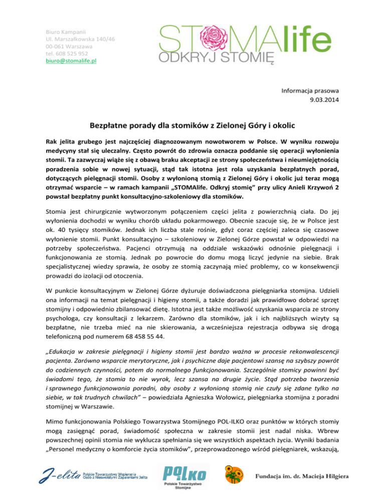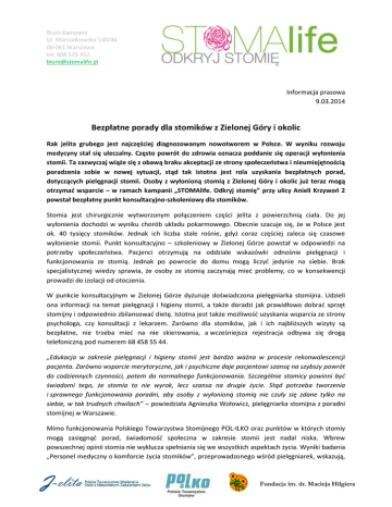 Biuro Kampanii Ul. Marszałkowska 140/46 00-061 Warszawa tel. 608 525 952 [email protected] Informacja prasowa 9.03.2014 Bezpłatne porady dla stomików z Zielonej Góry i okolic Rak jelita grubego jest najczęściej diagnozowanym nowotworem w Polsce. W wyniku rozwoju medycyny stał się uleczalny. Często powrót do zdrowia oznacza poddanie się operacji wyłonienia stomii. Ta zazwyczaj wiąże się z obawą braku akceptacji ze strony społeczeństwa i nieumiejętnością poradzenia sobie w nowej sytuacji, stąd tak istotna jest rola uzyskania bezpłatnych porad, dotyczących pielęgnacji stomii. Osoby z wyłonioną stomią z Zielonej Góry i okolic już teraz mogą otrzymać wsparcie – w ramach kampanii „STOMAlife. Odkryj stomię” przy ulicy Anieli Krzywoń 2 powstał bezpłatny punkt konsultacyjno-szkoleniowy dla stomików. Stomia jest chirurgicznie wytworzonym połączeniem części jelita z powierzchnią ciała. Do jej wyłonienia dochodzi w wyniku chorób układu pokarmowego. Obecnie szacuje się, że w Polsce jest ok. 40 tysięcy stomików. Jednak ich liczba stale rośnie, gdyż coraz częściej zaleca się czasowe wyłonienie stomii. Punkt konsultacyjno – szkoleniowy w Zielonej Górze powstał w odpowiedzi na potrzeby społeczeństwa. Pacjenci otrzymują na oddziale wskazówki odnośnie pielęgnacji i funkcjonowania ze stomią. Jednak po powrocie do domu mogą liczyć jedynie na siebie. Brak specjalistycznej wiedzy sprawia, że osoby ze stomią zaczynają mieć problemy, co w konsekwencji prowadzi do izolacji od otoczenia. W punkcie konsultacyjnym w Zielonej Górze dyżuruje doświadczona pielęgniarka stomijna. Udzieli ona informacji na temat pielęgnacji i higieny stomii, a także doradzi jak prawidłowo dobrać sprzęt stomijny i odpowiednio zbilansować dietę. Istotna jest także możliwość uzyskania wsparcia ze strony psychologa, czy konsultacji z lekarzem. Zarówno dla stomików, jak i ich najbliższych wizyty są bezpłatne, nie trzeba mieć na nie skierowania, a wcześniejsza rejestracja odbywa się drogą telefoniczną pod numerem 68 458 55 44. „Edukacja w zakresie pielęgnacji i higieny stomii jest bardzo ważna w procesie rekonwalescencji pacjenta. Zarówno wsparcie merytoryczne, jak i psychiczne daje pacjentowi szansę na szybszy powrót do codziennych czynności, potem do normalnego funkcjonowania. Szczególnie stomicy powinni być świadomi tego, że stomia to nie wyrok, lecz szansa na drugie życie. Stąd potrzeba tworzenia i sprawnego funkcjonowania poradni, aby osoby z wyłonioną stomią nie czuły się zdane tylko na siebie, w tak trudnych chwilach” ‒ powiedziała Agnieszka Wołowicz, pielęgniarka stomijna z poradni stomijnej w Warszawie. Mimo funkcjonowania Polskiego Towarzystwa Stomijnego POL-ILKO oraz punktów w których stomiy mogą zasięgnąć porad, świadomość społeczna w zakresie stomii jest nadal niska. Wbrew powszechnej opinii stomia nie wyklucza spełniania się we wszystkich aspektach życia. Wyniki badania „Personel medyczny o komforcie życia stomików”, przeprowadzonego wśród pielęgniarek, wskazują, że 87% stomików odczuwa lęk przed stomią, a ponad połowa zmienia swoje plany życiowe. Tylko 49% pacjentów jest zawsze edukowana przed operacją wyłonienia stomii na temat konsekwencji, z jakimi się ona wiąże. „Stomik po wyjściu ze szpitala, musi pokonać wiele trudności. Często z powodu wstydu i obawy przed brakiem akceptacji nie ma osoby, do której mógłby się zwrócić ze swoim problemem. Punkt konsultacyjny jest miejscem, gdzie stomik nie tylko spotka się ze zrozumieniem, ale także otrzyma specjalistyczne wsparcie ze strony psychologa. Placówki te pełnią kluczową rolę w procesie akceptacji nowej sytuacji życiowej” ‒ powiedział Andrzej Piwowarski, prezes Polskiego Towarzystwa Stomijnego POL-ILKO i współorganizator kampanii „STOMAlife. Odkryj stomię”. Poradnie stomijne oraz punkty konsultacyjno – szkoleniowe dla stomików powstają w ramach kampanii społecznej „STOMAlife. Odkryj stomię”. Jej celem jest walka z wykluczeniem społecznym dotykającym stomików, przełamanie tabu związanego ze stomią oraz edukacja pacjentów i społeczeństwa w zakresie faktów i mitów z nią związanych. Misją inicjatywy jest zbudowanie powszechnej akceptacji dla stomików, tak by bez obaw mogli powrócić do normalnej aktywności zawodowej i społecznej. W ramach kampanii na stronie www.stomalife.pl przedstawiane są historie pacjentów. Niektórym stomia znacząco poprawiła jakość życia, dzięki operacji wyłonienia stomii nie są przywiązani do ciągłego przebywania w domu, mogą realizować swoje pasje i marzenia. Poprzez odpowiednie działania edukacyjne, kampania ma zbudować zrozumienie i wsparcie społeczne dla stomików oraz pomóc w ich zaktywizowaniu. Adres punktu konsultacyjno-szkoleniowego dla stomików: Specjalistyczne Centrum Medyczne (pokój 24) ul. Anieli Krzywoń 2 65-001 Zielona Góra Tel: 68 458 55 44 Kontakt dla mediów: Aleksandra Sołtysiak, [email protected], tel: 883 226 220