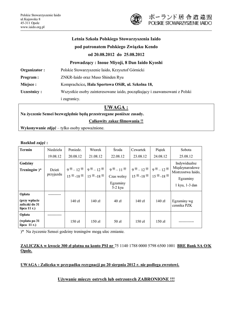 Polskie Stowarzyszenie Iaido ul.Kujawska 8 45-311 Opole www.iaido.org.pl ____________________________________________________________________________________ Letnia Szkoła Polskiego Stowarzyszenia Iaido pod patronatem Polskiego Związku Kendo od 20.08.2012 do 25.08.2012 Prowadzący : Inoue Miyoji, 8 Dan Iaido Kyoshi Organizator : Polskie Stowarzyszenie Iaido, Krzysztof Górnicki Program : ZNKR-Iaido oraz Muso Shinden Ryu Miejsce : Komprachcice, Hala Sportowa OSiR, ul. Szkolna 18, Uczestnicy : Wszystkie osoby zainteresowane iaido, początkujący i zaawansowani z Polski i zagranicy. UWAGA : Na życzenie Sensei bezwzględnie będą przestrzegane poniższe zasady. Całkowity zakaz filmowania !! Wykonywanie zdjęć – tylko osoby upoważnione. Rozkład zajęć : Termin Niedziela Poniedz. Wtorek Środa Czwartek 19.08.12 20.08.12 21.08.12 22.08.12 23.08.12 Piątek Sobota 24.08.12 25.08.12 Godziny Treningów )* Dzień przyjazdu 9 00 15 – 12 00 -18 00 00 9 00 15 – 12 00 -18 00 00 9 00 – 11 00 Czas wolny 9 00 15 – 12 00 -18 00 00 9 00 15 – 12 00 00 Indywidualne Międzynarodowe Mistrzostwa Iaido, -18 00 Egzaminy Egzaminy 5-2 kyu Opłata ---------- (przy wpłacie zaliczki do 31 lipca 11 r.) Opłata (wpłata po 31 lipca 11 r.) 1 kyu, 1-3 dan 140 zł 140 zł 40 zł 140 zł 140 zł Egzaminy wg cennika PZK 150 zł 150 zł 50 zł 150 zł 150 zł ------------ ----------- )* Na życzenie Sensei godziny treningów mogą ulec zmianie. ZALICZKA w kwocie 300 zł płatna na konto PSI nr 75 1140 1788 0000 5798 6500 1001 BRE Bank SA O/K Opole. UWAGA : Zaliczka w przypadku rezygnacji po 20 sierpnia 2012 r. nie podlega zwrotowi. Używanie mieczy ostrych lub ostrzonych ZABRONIONE !!! Polskie Stowarzyszenie Iaido ul.Kujawska 8 45-311 Opole www.iaido.org.pl ____________________________________________________________________________________ Noclegi : w szkole obok hali treningowej (proszę wziąć śpiwór i karimatę) – 10 zł za noc (bezwzględny zakaz przyrządzania posiłków i picia alkoholu na terenie szkoły !!!) Rezerwacja w hotelach indywidualna. Wyżywienie : indywidualne Zgłoszenie : na załączonym arkuszu - mailem [email protected] Zgłoszenie jest akceptowane po wpłynięciu zaliczki na konto. tylko dla uczestników całości Letniej Szkoły Iaido. Formularz w załączeniu. Egzaminy : Egzaminy 1 kyu oraz 1-3 dan, odbędą się po Mistrzostwach w sobotę 25 sierpnia 2012 r. Egzaminy 5-2 kyu odbędą się w środę pod wieczór. Zostanie to ustalone na miejscu. Wymagania egzaminacyjne wg regulaminu PZK. Koszt egzaminu wg cennika Polskiego Związku Kendo. Zgłoszenie do egzaminu na załączonym formularzu. Zgłoszenie należy przysłać w nieprzekraczalnym terminie do 30 lipca 2012 r. mailem [email protected] lub listownie - Polskie Stowarzyszenie Iaido, 45-311 Opole, ul.Kujawska 8. Zgłoszenia z niekompletnymi danymi lub przesłane po terminie zgłoszenia nie będą przyjmowane. Międzynarodowe Indywidualne MISTRZOSTWA Iaido (mudan, shodan, nidan, sandan) Zgłoszenie mogą przysyłać tylko członkowie klubów zrzeszonych w Polskim Związku Kendo lub osoby z zagranicy zrzeszone poprzez swój kraj w EKF. Mistrzostwa będą rozgrywane według regulaminu i przepisów ZNKR Seitei Iai. Udział w Mistrzostwach - 5 zł. Płatny bezpośrednio na miejscu. Zgłoszenie należy przysłać w nieprzekraczalnym terminie do 30 lipca 2012 r. mailem [email protected] lub listownie – Polskie Stowarzyszenie Iaido , 45-311 Opole, ul.Kujawska 8. Zgłoszenia z niekompletnymi danymi lub przesłane po terminie zgłoszenia nie będą przyjmowane. Zgłoszenie powinno zawierać dane wymienione w formularzu. Strój i sprzęt : Podczas mistrzostw obowiązuje strój do iaido z Polskim zekken klubowym na lewej stronie klatki piersiowej. Polskie Stowarzyszenie Iaido ul.Kujawska 8 45-311 Opole www.iaido.org.pl ____________________________________________________________________________________ Można używać wyłącznie iaito, obowiązkowo z sageo we wszystkich kategoriach (mudan, shodan, nidan, sandan). Mistrzostwa odbędą się w poszczególnych kategoriach w zależności od ilości zgłoszonych osób. Eliminacje (system pucharowy) Podczas eliminacji będą wykonywane 3 formy ustalone przed zawodami przez Komisję Sędziowską w czasie 4 minut. W zależności od ilości uczestników zostaną utworzone grupy 3-4 osobowe, z których do Finałów przejdą jedna lub dwie osoby z każdej grupy z najwyższą liczbą flag. Finały (system KO) W walkach finałowych będzie obowiązywać 5 form ustalonych przez Komisję Sędziowską (czas 6 minut). W walkach tych zostaną nagrodzone 1,2 oraz dwa 3 miejsca. W przypadku małej ilości zgłoszonych osób w kategorii uniemożliwiającej utworzenie grup eliminacyjnych, zasady wyłonienia zwycięzców zostaną ustalone po ostatecznym terminie zgłoszenia do zawodów. UWAGA : W Mistrzostwach mogą wziąć udział tylko osoby z aktualną książeczką zdrowia sportowca.