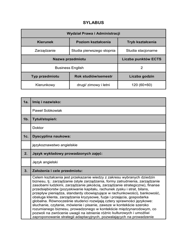 SYLABUS Wydział Prawa i Administracji 1a. Kierunek Poziom kształcenia Tryb kształcenia Zarządzanie Studia pierwszego stopnia Studia stacjonarne Nazwa przedmiotu Liczba punktów ECTS Business English 2 Typ przedmiotu Rok studiów/semestr Liczba godzin Kierunkowy drugi/ zimowy i letni 120 (60+60) Imię i nazwisko: Paweł Sobkowiak 1b. Tytuł/stopień: Doktor 1c. Dyscyplina naukowa: językoznawstwo angielskie 2. Język wykładowy prowadzonych zajęć: Język angielski 3. ZałoŜenia i cele przedmiotu: Celem kształcenia jest przekazanie wiedzy z zakresu wybranych dziedzin biznesu, tj.: zarządzanie (style zarządzania, formy zatrudnienia, zarządzanie zasobami ludzkimi, zarządzanie jakością, zarządzanie strategiczne), finanse przedsiębiorstw (pozyskiwanie kapitału, rachunek zysku i strat, bilans, przepływ pieniądza, standardy obowiązujące w rachunkowości), bankowość, obsługa klienta, zarządzania kryzysowe, fuzje i przejęcia, gospodarka globalna. Równocześnie studenci rozwijają cztery sprawności językowe: słuchanie, czytanie, mówienie i pisanie, zawsze w kontekście szeroko rozumianego biznesu, prowadzonego w kontekście międzynarodowym, co pozwoli na zwrócenie uwagii na istnienie róŜnic kulturowych i umoŜliwi zaproponowanie strategii adaptacyjnych, pozwalających na prowadzenie interesów z powodzeniem w globalnym, wielokulturowym świecie. Kształcenie zmierza do wykształcenia u studnetów umiejętności negocjowania róŜnych kwestii typowych dla świata biznesu i przedstawiania prezentacji na tematy biznesowe. Studenci nabywają umiejętności skutecznej komunikacji, poprzez dostosowywanie uŜywanych środków, czy, w przypadku negocjowania, metod i technik negocjacji i mediacji stosowanie do sytuacji. Ćwiczy się teŜ elementy pisania: notatki, maile, listy i raporty biznesowe. 4. Wymagania wstępne: Znajomość języka angielskiego na poziomie B2 w mowie i piśmie. 5. Metody dydaktyczne: wykład interaktywny, praca z podręcznikiem, uczenie się poprzez działanie rozwiązywanie studium przypadków: rozwiązywanie problemów biznesowych, prezentowanie argumentów i negocjowanie (case studies), ćwiczenia rozwijające umiejetności komunikacji w języku angielskim, . 6. Forma i warunki zaliczania przedmiotu: aktywne uczestnictwo w zajęciach, przygotowanie prac pisemnych (notatki, listy, raporty), przygotowanie i prezentowanie w klasie przygotowanego artykułu z prasy specjalistycznej (co dwa tygodnie jeden artykuł), przygotowanie i przedstawienie wobec grupy prezentacji na uzgodniony z wykładowcą temat z zakresu biznesu, test/y pisemne w trakcie i/ lub pod koniec semestru. 7. Treści kształcenia (programowe): 1. Team building (successful teams, recipes for team building - new ways for team building, motivating the sales team (case study), sports coaching and corporate team building, the ideal number in a team). 2. Raising finance (financial terms, ways to raise money, finding money, negotiating finance for a new film (case study), willing and less willing lenders, crowdfunding). 3. Customer service (complaints, characteristics of good customer service, changing customer service in the global world, Hurrah Airlines (case study), outlet villages - shopping centers selling branded goods at a discount, social media as a tool to establish relationship with a clientele). 4. Crisis management (handling crises, good and bad examples of , dealing with crises, In Range - a video company faces a crisis on the eve of a major product launch (case study), crisis public relations, assessing risk). 5. Mergers and acquistions (describing mergers and acquisitons, making acquisitions, acquiring a green business, Rinnovar International - a major cosmetics group is looking to acquire new businesses as part of its growth strategy (case study), expanding abroad, successful acquisitons). 6. Personal development (behavioural competencies, setting goals, the Johari window, job desriptions). 7. Corporate image and corporate social responsibility (CSR). 8. Supply chain (outsourcing, logistics, corporate guidelines). 9. Managing conflict. 8. Wykaz literatury podstawowej: Podręczniki: 1. Cotton, D., Falvey, D. i Kent, S. 2011. Market Leader. UpperIntermediate. London: Longman. 2. Rogers, J. 2011. Market Leader. Practice File. Upper-Intermediate. London: Longman. 3. Allison, J., Appleby R. i Chazal, E. 2009. The Business. Advanced. London: MacMillan. Programy wideo z zakresu przerabianej tematyki. 9. Wykaz literatury uzupełniającej: 1. Adair, J. 2009. Effective Team-building: How to make a winning team? London: Pan Macmillan. 2. Blayney, M. 2006. Raising Finance for Your Business. Oxford: How to books, Ltd. 3. Buttle, F. 2008. Customer Relationship in Management. Oxford: Butterworth Heinemann. 4. Child, J. i Faulkner, D. 2005. Strategies of Co-operation: Managing Alliances, Networks and Joint Ventures. Oxford: Oxford University Press. 5. Comfort, J. 1998. Effective negotiating. Oxford: Oxford University Press. 6. Comfort, J. 1998. Effective presentations. Oxford: Oxford University Press. 7.Heath, R. i O'Hair, H. 2008. Handbook of Risk and Crisis Communiaction. New York: Routledge. 8. Mascull, B. 2010. Business Vocabulary in Use. Advanced. Cambridge: Cambridge University Press. 9. Mead, R. i Andrews, T. 2008. International Management: Culture and Beyond. New York: Wiley Blackwell. 10. Stahl, G. i Mendenhall, M. 2005. Mergers and Acquisitions: Managing Culture and Human Resources. Stanford: Stanford University Press. oraz samodzielnie wybrane przez studenta teksty o problematyce biznesowej z bieŜących numerów prasy specjalistycznej (Newsweek, The Economist, The Finanical Times)