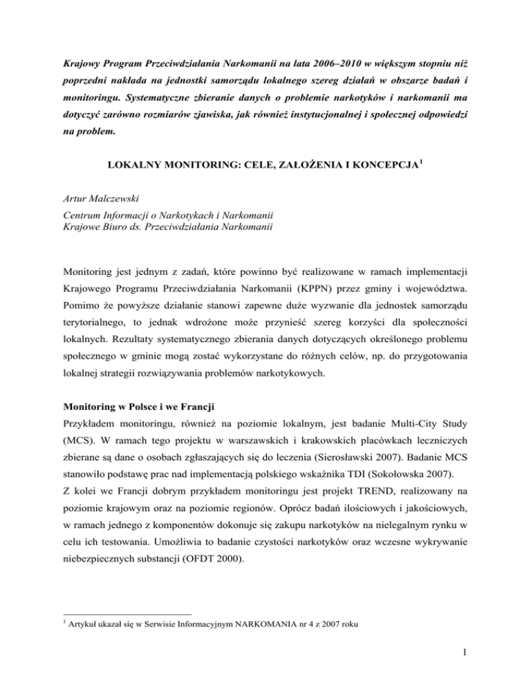 Krajowy Program Przeciwdziałania Narkomanii na lata 2006–2010 w większym stopniu niż poprzedni nakłada na jednostki samorządu lokalnego szereg działań w obszarze badań i monitoringu. Systematyczne zbieranie danych o problemie narkotyków i narkomanii ma dotyczyć zarówno rozmiarów zjawiska, jak również instytucjonalnej i społecznej odpowiedzi na problem. LOKALNY MONITORING: CELE, ZAŁOŻENIA I KONCEPCJA 1 Artur Malczewski Centrum Informacji o Narkotykach i Narkomanii Krajowe Biuro ds. Przeciwdziałania Narkomanii Monitoring jest jednym z zadań, które powinno być realizowane w ramach implementacji Krajowego Programu Przeciwdziałania Narkomanii (KPPN) przez gminy i województwa. Pomimo że powyższe działanie stanowi zapewne duże wyzwanie dla jednostek samorządu terytorialnego, to jednak wdrożone może przynieść szereg korzyści dla społeczności lokalnych. Rezultaty systematycznego zbierania danych dotyczących określonego problemu społecznego w gminie mogą zostać wykorzystane do różnych celów, np. do przygotowania lokalnej strategii rozwiązywania problemów narkotykowych. Monitoring w Polsce i we Francji Przykładem monitoringu, również na poziomie lokalnym, jest badanie Multi-City Study (MCS). W ramach tego projektu w warszawskich i krakowskich placówkach leczniczych zbierane są dane o osobach zgłaszających się do leczenia (Sierosławski 2007). Badanie MCS stanowiło podstawę prac nad implementacją polskiego wskaźnika TDI (Sokołowska 2007). Z kolei we Francji dobrym przykładem monitoringu jest projekt TREND, realizowany na poziomie krajowym oraz na poziomie regionów. Oprócz badań ilościowych i jakościowych, w ramach jednego z komponentów dokonuje się zakupu narkotyków na nielegalnym rynku w celu ich testowania. Umożliwia to badanie czystości narkotyków oraz wczesne wykrywanie niebezpiecznych substancji (OFDT 2000). 1 Artykuł ukazał się w Serwisie Informacyjnym NARKOMANIA nr 4 z 2007 roku 1 Współpraca polsko-niemiecka W ramach programu twinningowego z Niemcami pracownicy Centrum Informacji o Narkotykach i Narkomanii (CINN) mieli możliwość zapoznania się z niemieckimi przykładami monitorowania w dwóch niemieckich miastach. Jednym z rezultatów powyższego programu będzie wydanie podręcznika dotyczącego prowadzenia lokalnego monitoringu. W 2007 roku odbyły się dwie wizyty studyjne przedstawicieli CINN w Hamburgu i Frankfurcie. W tych miastach systematycznie zbierane są informacje dotyczące problemów związanych z alkoholem, narkotykami i tytoniem. Niemieccy eksperci przedstawili swoje rozwiązania również na spotkaniach w Polsce. Jedno z nich miało na celu zapoznanie przedstawicieli samorządów lokalnych, przede wszystkim z dużych miast, ze sposobami prowadzenia lokalnego monitoringu. W poniższym artykule chciałbym omówić założenia lokalnego monitoringu, jego metodologię, cele i koncepcję. W następnym numerze przedstawię konkretne działania wdrożone i realizowane w Niemczech. Zaprezentuję też polskie rozwiązania, które stosowane są m.in. w Gdańsku, Szczecinie i we Wrocławiu. Mam nadzieję, że poniższy artykuł stanie się początkiem serii publikacji z obszaru tej tematyki na łamach Serwisu. Po co wdrażać monitoring na poziomie lokalnym? Sukces działań podejmowanych na poziomie lokalnym zależy od wiedzy, jaką mamy o problemach, z którymi boryka się społeczność. Im więcej wiemy o sytuacji w gminie, zarówno na poziomie diagnozy sytuacji, jak również oceny zasobów, tym lepiej możemy planować i wdrażać działania mające na celu ograniczenie rozmiarów zjawiska (np. narkomanii). Przy tworzeniu lokalnej strategii czy dystrybucji często niewystarczających środków ważna jest wiedza o rozmiarze problemu, na który chcemy odpowiedzieć. Diagnoza pozwala na lepsze dostosowanie działań do potrzeb oraz na bardziej efektywną alokację środków, jakimi dysponujemy. Monitoring może być jej podstawowym elementem. Ponadto monitoring pozwala na elastyczne reagowanie na rozwijającą się sytuację. Stale prowadzona obserwacja jest swoistego rodzaju systemem wczesnego ostrzegania o nowych zjawiskach, na które lokalna społeczność może w miarę szybko zareagować. Corocznie powtarzana, dostarcza informacji o trendach, czyli kierunku, w jakim rozwija się zjawisko, oraz o działaniach podejmowanych w celu jego ograniczenia. Często brakuje istniejących już badań, które mogłyby zostać wykorzystane na poziomie lokalnym. W przypadku badań naukowych długi okres pomiędzy przeprowadzeniem badania 2 a opublikowaniem raportu opóźnia, a czasami wręcz uniemożliwia podjęcie działań profilaktycznych. Większość dostępnych wyników nie ma odniesienia do poziomu lokalnego, ponieważ dotyczą one całego kraju. Co więcej, dane ogólnokrajowe nie muszą być, a często nie są, reprezentatywne dla opisu sytuacji w społeczności lokalnej. Zahamowanie trendu wzrostowego w używaniu narkotyków, który obserwujemy na podstawie najnowszych badań, nie musi dotyczyć społeczności lokalnej, gdzie sytuacja potrafi rozwijać się w zupełnie innym kierunku. Lokalna specyfika komplikuje możliwość wykorzystania badań prowadzonych na poziomie ogólnopolskim czy w innych regionach lub gminach. Scena narkotykowa często się zmienia, pojawiają się nowe substancje, wzory używania oraz nowe grupy użytkowników. Wymaga to narzędzi, które dadzą praktykom szanse na wdrożenie szybkich i skutecznych działań. Podjęcie wczesnej interwencji pozwala na ograniczenie szkód zdrowotnych i społecznych, jakie pojawiają się w przypadku zjawisk rozwijających się bez reakcji odpowiednich służb. Warto podkreślić, że monitoring jest tańszy od badań realizowanych co pewien czas, ponieważ za każdym razem wykorzystuje się tę samą, przygotowaną na początku metodologię. Cechy lokalnego monitoringu Tak naprawdę monitoring to nowa nazwa na dobrze znane systematyczne obserw