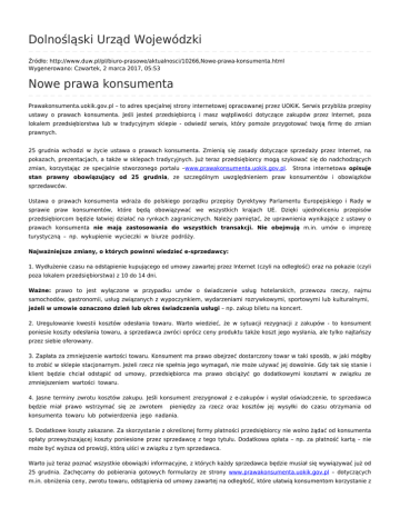 Dolnośląski Urząd Wojewódzki Źródło: http://www.duw.pl/pl/biuro-prasowe/aktualnosci/10266,Nowe-prawa-konsumenta.html Wygenerowano: Czwartek, 2 marca 2017, 05:53 Nowe prawa konsumenta Prawakonsumenta.uokik.gov.pl – to adres specjalnej strony internetowej opracowanej przez UOKiK. Serwis przybliża przepisy ustawy o prawach konsumenta. Jeśli jesteś przedsiębiorcą i masz wątpliwości dotyczące zakupów przez Internet, poza lokalem przedsiębiorstwa lub w tradycyjnym sklepie - odwiedź serwis, który pomoże przygotować twoją firmę do zmian prawnych. 25 grudnia wchodzi w życie ustawa o prawach konsumenta. Zmienią się zasady dotyczące sprzedaży przez Internet, na pokazach, prezentacjach, a także w sklepach tradycyjnych. Już teraz przedsiębiorcy mogą szykować się do nadchodzących zmian, korzystając ze specjalnie stworzonego portalu –www.prawakonsumenta.uokik.gov.pl. Strona internetowa opisuje stan prawny obowiązujący od 25 grudnia, ze szczególnym uwzględnieniem praw konsumentów i obowiązków sprzedawców. Ustawa o prawach konsumenta wdraża do polskiego porządku przepisy Dyrektywy Parlamentu Europejskiego i Rady w sprawie praw konsumentów, które będą obowiązywać we wszystkich krajach UE. Dzięki ujednoliceniu przepisów przedsiębiorcom będzie łatwiej działać na rynkach zagranicznych. Należy pamiętać, że uprawnienia wynikające z ustawy o prawach konsumenta nie mają zastosowania do wszystkich transakcji. Nie obejmują m.in. umów o imprezę turystyczną – np. wykupienie wycieczki w biurze podróży. Najważniejsze zmiany, o których powinni wiedzieć e-sprzedawcy: 1. Wydłużenie czasu na odstąpienie kupującego od umowy zawartej przez Internet (czyli na odległość) oraz na pokazie (czyli poza lokalem przedsiębiorstwa) z 10 do 14 dni. Ważne: prawo to jest wyłączone w przypadku umów o świadczenie usług hotelarskich, przewozu rzeczy, najmu samochodów, gastronomii, usług związanych z wypoczynkiem, wydarzeniami rozrywkowymi, sportowymi lub kulturalnymi, jeżeli w umowie oznaczono dzień lub okres świadczenia usługi – np. zakup biletu na koncert. 2. Uregulowanie kwestii kosztów odesłania towaru. Warto wiedzieć, że w sytuacji rezygnacji z zakupów - to konsument poniesie koszty odesłania towaru, a sprzedawca zwróci oprócz ceny produktu także koszt jego wysłania, ale tylko najtańszy przez siebie oferowany. 3. Zapłata za zmniejszenie wartości towaru. Konsument ma prawo obejrzeć dostarczony towar w taki sposób, w jaki mógłby to zrobić w sklepie stacjonarnym. Jeżeli rzecz nie spełnia jego wymagań, nie może używać jej dowolnie. Gdy tak się stanie i klient będzie chciał odstąpić od umowy, przedsiębiorca ma prawo obciążyć go dodatkowymi kosztami w związku ze zmniejszeniem wartości towaru. 4. Jasne terminy zwrotu kosztów zakupu. Jeśli konsument zrezygnował z e-zakupów i wysłał oświadczenie, to sprzedawca będzie miał prawo wstrzymać się ze zwrotem pieniędzy za rzecz oraz kosztów jej wysyłki do czasu otrzymania od konsumenta towaru lub potwierdzenia jego nadania. 5. Dodatkowe koszty zakazane. Za skorzystanie z określonej formy płatności przedsiębiorcy nie wolno żądać od konsumenta opłaty przewyższającej koszty poniesione przez sprzedawcę z tego tytułu. Dodatkowa opłata – np. za płatność kartą – nie może być wyższa od prowizji, którą uiści w związku z tym sprzedawca. Warto już teraz poznać wszystkie obowiązki informacyjne, z których każdy sprzedawca będzie musiał się wywiązywać już od 25 grudnia. Zachęcamy do pobierania gotowych formularzy ze strony www.prawakonsumenta.uokik.gov.pl – dotyczących m.in. obniżenia ceny, zwrotu towaru, odstąpienia od umowy zawartej na odległość, które ułatwią konsumentom korzystanie z ich praw, a przedsiębiorcom – wywiązanie się z obowiązków. Źródło: www.msport.gov.pl/ Drukuj Generuj PDF Powiadom znajomego Wstecz liczba wejść: 814