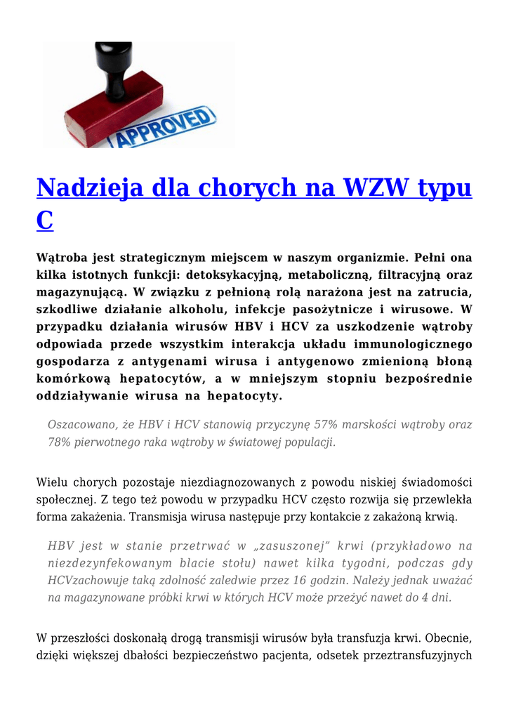 Nadzieja dla chorych na WZW typu C Wątroba jest strategicznym miejscem w naszym organizmie. Pełni ona kilka istotnych funkcji: detoksykacyjną, metaboliczną, filtracyjną oraz magazynującą. W związku z pełnioną rolą narażona jest na zatrucia, szkodliwe działanie alkoholu, infekcje pasożytnicze i wirusowe. W przypadku działania wirusów HBV i HCV za uszkodzenie wątroby odpowiada przede wszystkim interakcja układu immunologicznego gospodarza z antygenami wirusa i antygenowo zmienioną błoną komórkową hepatocytów, a w mniejszym stopniu bezpośrednie oddziaływanie wirusa na hepatocyty. Oszacowano, że HBV i HCV stanowią przyczynę 57% marskości wątroby oraz 78% pierwotnego raka wątroby w światowej populacji. Wielu chorych pozostaje niezdiagnozowanych z powodu niskiej świadomości społecznej. Z tego też powodu w przypadku HCV często rozwija się przewlekła forma zakażenia. Transmisja wirusa następuje przy kontakcie z zakażoną krwią. HBV jest w stanie przetrwać w „zasuszonej” krwi (przykładowo na niezdezynfekowanym blacie stołu) nawet kilka tygodni, podczas gdy HCVzachowuje taką zdolność zaledwie przez 16 godzin. Należy jednak uważać na magazynowane próbki krwi w których HCV może przeżyć nawet do 4 dni. W przeszłości doskonałą drogą transmisji wirusów była transfuzja krwi. Obecnie, dzięki większej dbałości bezpieczeństwo pacjenta, odsetek przeztransfuzyjnych zakażeń jest minimalny. Wciąż istnieje jednak ryzyko zakażenia związane z wykonywaniem tatuażu i zabiegów kosmetycznych. Dzisiaj ludzkość dysponuje już skuteczną bronią prewencyjną przeciwko HBV jaką jest szczepienie ochronne. Szczepienia przeciw HCV nie istnieją. Efektywna kontrola i prewencja WZW jest często złożona. Może ona obejmować programy szczepień ochronnych, badania krwi, używanie jednorazowego sprzętu medycznego, programy edukacyjne i wiele innych. Globalny nacisk na te ostatnie jest jednak niewielki. W projekcie WHO z 2009 roku tylko 41% okręgów w 54 państwach przeprowadziło kampanie uświadamiające w ww. zakresie w ciągu ostatnich pięciu lat.[1] W Polsce zapadalność na WZW typu C wykazywała trend wzrostowy: od wartości 2,58 na 100 000 ludności w 1997 roku do 7,85 w 2005 roku. W 2007 roku odnotowano nieznaczny spadek zachorowalności (7,22). Dane te mogą ulec zmianie ze względu na przewlekły charakter choroby. Zapadalność roczna może kumulować się latami prowadząc do wysokiej chorobowości (1% ogólnej populacji). W 2007 roku najwyższy współczynnik zapadalności odnotowano w grupie wiekowej 50-54 lata (11,63). W podziale na województwa zdecydowanie najwieksza liczba zachorowań wystapiła w województwie świętokrzyskim (13,62). [2] Szacunkowe dane epidemiologiczne Państwowej Inspekcji Sanitarnej (PIS) z 2009 roku pozwalają sądzić, że liczba osób zakażonych HCV w Polsce sięga 730 tysięcy.[3] Wychodząc naprzeciw oczekiwaniom i potrzebom współczesnych społeczeństw Food and Drug Administration (FDA) zaakceptowało nowy lek, Victrelis (boceprevir), adresowany do chorych na WZW typu C. FDA zaakceptowało nowy lek na WZW typu C Lek jest skierowany do pacjentów z zachowaną przynajmniej częściowo funkcją wątroby, którzy nie otrzymali wcześniejszego leczenia lub też okazało się ono nieskuteczne. Można stosować go razem z peginterferonem alfa i ribavirinem. Bezpieczeństwo i skuteczność nowego terapeutyku zostały potwierdzone w trzech fazach badań klinicznych, przeprowadzonych z udziałem 1500 dorosłych pacjentów. Działanie nowego leku różni się zasadniczo od dotychczas stosowanych środków farmakologicznych (wzmagały odpowiedź układu immunologicznego chorego) i opiera się na hamowaniu proteazy, która wspomaga namnażanie się wirusa[4]. Wirusowe zapalenie wątroby typu C stanowi poważny i narastający problem epidemiologiczny. Wczesne wykrycie zakażenia HCV zwiększa szanse na skuteczne leczenie przeciwwirusowe. Rozpoznanie zakażenia w ciągu roku od chwili zakażenia daje 90-100% szanse wyleczenia. Szansa wyleczenia w przypadku stanu przewlekłego nie przekracza 40%. Tak obiecujące wyniki skłaniają do dążenia w kierunku zwiększenia dostępności konsultacji specjalistycznych oraz podkreślenia wagi roli diagnostyki laboratoryjnej zakażeń wirusami hepatotropowymi. Biodrukarka 3D — technologia przyszłości w teraźniejszości W filmie „Piąty element” z fragmentu DNA znajdującego się w rękawicy odtwarzana jest, warstwa po warstwie, piękna kobieta. Ta futurystyczna scena już niedługo może się powtórzyć w rzeczywistości dzięki doskonałemu połączeniu dorobku techniki z naukami biomedycznymi w postaci biodrukarki 3D. Pierwszą biodrukarkę stworzyła firma Invetech, od dziesięcioleci zajmująca się produkcją sprzętu biomedycznego, na zlecenie firmy Organovo, pioniera w dziedzinie technologii biodruku. Organovo koncentruje się na metodzie używanej od prawie dwóch dekad przez jubilerów czy mechaników, w tym przypadku wykorzystując drukarkę 3D do druku ludzkich tkanek na żądanie, zarówno do badań laboratoryjnych jak i do celów medycznych. Biodrukarka może stać się spełnieniem snów o prostej i szybkiej medycynie regeneracyjnej, w której tempo otrzymania narządu warunkuje jedynie szybkość namnażania się komórek własnych chorego, nie zmuszając pacjentów potrzebujących na przykład serca do snucia marzeń o cudzej śmierci. FDA zaakceptowało nowy lek na WZW typu C Drukarka wyposażona jest w dwie głowice. Zadaniem pierwszej jest umieszczanie docelowych komórek, a druga wprowadza materiały wspomagające jak hydrożel, kolagen czy czynniki wzrostu, konstruując linia po linii i warstwa po warstwie trójwymiarowe struktury. Do druku służy specjalnie zmodyfikowany hydrożel alginianowy, który w temperaturach poniżej 20oC jest płynem, a powyżej 32oC ciałem stałym. Jest on wystarczająco sztywny by utrzymać zaprogramowany