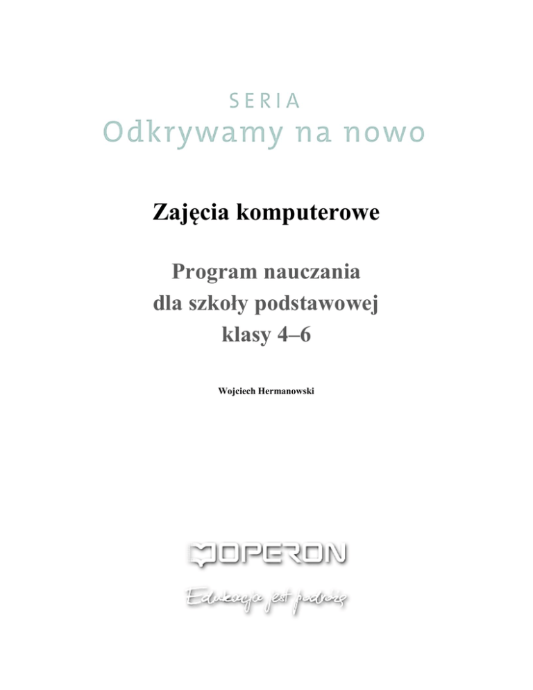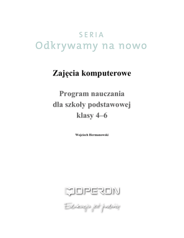 Zajęcia komputerowe Program nauczania dla szkoły podstawowej klasy 4–6 Wojciech Hermanowski Spis treści 1. Wstęp 3 2. Szczegółowe cele kształcenia i wychowania 4 3. Treści edukacyjne 13 4. Sposoby osiągania celów kształcenia i wychowania 20 5. Opis założonych osiągnięć ucznia 24 6. Propozycje kryteriów oceny i metod sprawdzania osiągnięć ucznia 26 2 1. Wstęp Zajęcia komputerowe wymagają od nauczyciela nie tylko dużej wiedzy merytorycznej, ale także podjęcia trudu indywidualizacji pracy z uczniami w większym wymiarze niż w przypadku innych przedmiotów. Przyczyniają się do tego potrzeby uczniów ze specjalnymi potrzebami edukacyjnymi i ich zróżnicowane możliwości intelektualne, a także poziom umiejętności oraz wiedza zdobyte podczas samodzielnego korzystania z komputera. Te umiejętności są często bardzo wysokie, ale wymagają uporządkowania i uzupełnienia. Jednocześnie zdarzają się uczniowie, których kontakty z komputerem były do tej pory z różnych przyczyn sporadyczne. Sporym wyzwaniem dla nauczyciela jest więc prawidłowe zdiagnozowanie stanu wiedzy i umiejętności już na początku roku szkolnego. Wykorzystanie testów zawartych w programie nauczania lub opracowanie własnych narzędzi diagnostycznych staje się niezbędne. Treści nauczania podstawy programowej zawierają głównie zagadnienia związane z praktycznym wykorzystaniem komputera, np. w uczeniu się, oraz ze znaczeniem informatyki w życiu współczesnego człowieka. Programy komputerowe używane na zajęciach dzięki różnorodności narzędzi i opcji ułatwiają przystosowanie zadań do indywidualnych możliwości uczniów. Dzięki temu nie ma problemu ze spełnieniem wymagań podstawy programowej przy jednoczesnym zróżnicowaniu poziomów trudności ćwiczeń. Należy jednak pamiętać by każde ćwiczenie miało swój, zrozumiały dla ucznia cel. Przykładem może być korekta podstawowych parametrów zdjęć cyfrowych, tak by powstał z nich elektroniczny album fotograficzny, np. ze szkolnej uroczystości. 3 2. Szczegółowe cele kształcenia i wychowania Przedmioty informatyczne we współczesnej szkole to nie tylko nauka posługiwania się komputerem i jego programowania. Coraz więcej aspektów życia codziennego łączy się z siecią, która odzwierciedla zachowania użytkowników czy zjawiska socjologiczne przenoszone z realnego świata. W większości przypadków jedynym miejscem kształtującym postawy wobec technologii informacyjnej i jej usług jest szkoła. W czasie zajęć w pracowni informatycznej cele wychowawcze muszą być realizowane równolegle z celami dotyczącymi podstawy programowej. Część z nich jest także w niej uwzględniona. Sposób osiągania opisanych celów zależy od etapu kształcenia. Cel ogólny Świadome stosowanie przepisów i zasad bezpiecznego eksploatowania urządzeń elektrycznych oraz zachowania przy stanowisku pracy Przestrzeganie zasad netykiety i współużytkowania sieci komputerowej Cele szczegółowe Uczeń: – zna i umie zinterpretować poszczególne punkty regulaminu pracowni, – potrafi ocenić wzrokowo stan urządzenia elektrycznego (komputera) i przewodów doprowadzających zasilanie i na tej podstawie ocenia bezpieczeństwo pracy z tym urządzeniem, – zna podstawowe zasady bezpiecznego użytkowania i podłączania urządzeń peryferyjnych, – nie stwarza zagrożeń: odpowiednio eksploatuje urządzenia w pracowni, zachowuje ostrożność podczas poruszania się po pracowni, np. w czasie pracy w zespole. Uczeń: – zna i stosuje podstawowe zasady obowiązujące podczas korzystania z usług sieciowych, w tym: komunikatorów, forów, poczty itp., – zachowuje ostrożność: ustala i chroni bezpieczne hasła, nie udostępnia informacji Uwagi Regulamin i wynikające z niego zasady powinny być omówione na pierwszych zajęciach w pracowni i stosowane w czasie wszystkich następnych lekcji. Konieczne jest wpisanie odpowiedniego tematu do dziennika i złożenie podpisu. Jest to ślad po przeprowadzeniu lekcji na temat zachowania w pracowni. Oprócz zajęć poświęconych tej tematyce należy zwrócić uwagę na zachowanie uczniów w czasie zajęć i dyskretnie kontrolować ich działania w sieci. W przypadku naruszenia zasad należy oddziaływać wychowawczo – nie 4 Wzrost świadomości na temat przestępczości w sieci Umiejętność pracy w zespole osobistych, chroni swoje zasoby, – szanuje współuczestników usług sieciowych, – dba o swój wizerunek w sieci, – unika agresji w sieci, – zna podstawowe prawa dotyczące ochrony wizerunku i prywatnych danych. Uczeń: – wie, jak unikać zagrożeń przestępczą działalnością w sieci, – wie, które działania w sieci noszą znamiona przestępstwa lub wykroczenia, – zgłasza osobie starszej (rodzicom, nauczycielowi itp.) niepokojące go wydarzenia w sieci, np. molestowanie, próby wyłudzeń, ośmieszanie, oczernianie i ataki na siebie lub bliskich. Uczeń: – umie współpracować z innymi członkami grupy, szanuje hierarchię zespołu, – prowadzi dyskusje, broni swoich racji, umie zawierać kompromisy, – nie wyręcza się pracą innych. Poszanowanie dla własności intelektualnej Uczeń: – wie, czym są prawa autorskie i majątkowe, a zwłaszcza prawa do dzieł rozpowszechnianych na nośnikach cyfrowych, – szanuje prawa autorskie twórców i kolegów oraz dba o przestrzeganie własnych, do zdjęć, tekstów, zadań domowych itp. Szanowanie stanowiska pracy Uczeń: lekceważyć. Na zajęciach poświęconych tej tematyce należy również zwrócić uwagę na zachowanie uczniów w czasie zajęć i dyskretnie kontrolować ich działania w sieci. W przypadku zauważenia niepokojących objawów należy interweniować. Nie wolno lekceważyć takich sytuacji. Cel powinien być realizowany podczas pracy nad wspólnymi projektami. Należy zwrócić uwagę na dobór członków zespołu. Nie wolno ingerować w pracę zespołu, ale czuwać nad od