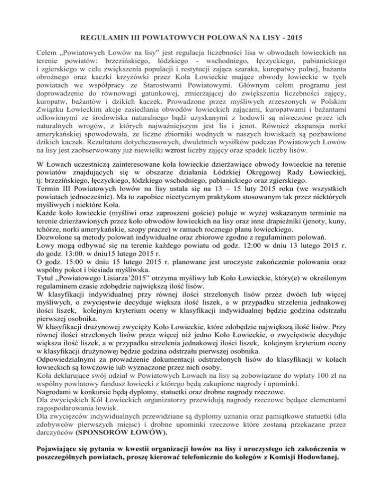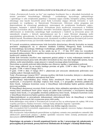 REGULAMIN III POWIATOWYCH POLOWAŃ NA LISY - 2015 Celem „Powiatowych Łowów na lisy” jest regulacja liczebności lisa w obwodach łowieckich na terenie powiatów: brzezińskiego, łódzkiego - wschodniego, łęczyckiego, pabianickiego i zgierskiego w celu zwiększenia populacji i restytucji zająca szaraka, kuropatwy polnej, bażanta obrożnego oraz kaczki krzyżówki przez Koła Łowieckie mające obwody łowieckie w tych powiatach we współpracy ze Starostwami Powiatowymi. Głównym celem programu jest doprowadzenie do równowagi gatunkowej, zmierzającej do zwiększenia liczebności zajęcy, kuropatw, bażantów i dzikich kaczek. Prowadzone przez myśliwych zrzeszonych w Polskim Związku Łowieckim akcje zasiedlania obwodów łowieckich zającami, kuropatwami i bażantami odłowionymi ze środowiska naturalnego bądź uzyskanymi z hodowli są niweczone przez ich naturalnych wrogów, z których najważniejszym jest lis i jenot. Również ekspansja norki amerykańskiej spowodowała, że liczne zbiorniki wodnych w naszych łowiskach są pozbawione dzikich kaczek. Rezultatem dotychczasowych, dwuletnich wysiłków podczas Powiatowych Łowów na lisy jest zaobserwowany już niewielki wzrost liczby zajęcy oraz spadek liczby lisów. W Łowach uczestniczą zainteresowane koła łowieckie dzierżawiące obwody łowieckie na terenie powiatów znajdujących się w obszarze działania Łódzkiej Okręgowej Rady Łowieckiej, tj: brzezińskiego, łęczyckiego, łódzkiego wschodniego, pabianickiego oraz zgierskiego. Termin III Powiatowych łowów na lisy ustala się na 13 – 15 luty 2015 roku (we wszystkich powiatach jednocześnie). Ma to zapobiec nieetycznym praktykom stosowanym tak przez niektórych myśliwych i niektóre Koła. Każde koło łowieckie (myśliwi oraz zaproszeni goście) poluje w wyżej wskazanym terminie na terenie dzierżawionych przez koło obwodów łowieckich na lisy oraz inne drapieżniki (jenoty, kuny, tchórze, norki amerykańskie, szopy pracze) w ramach rocznego planu łowieckiego. Dozwolone są metody polowań indywidualne oraz zbiorowe zgodne z regulaminem polowań. Łowy mogą odbywać się na terenie każdego powiatu od godz. 12:00 w dniu 13 lutego 2015 r. do godz. 13:00. w dniu15 lutego 2015 r. O godz. 15:00 w dniu 15 lutego 2015 r. planowane jest uroczyste zakończenie polowania oraz wspólny pokot i biesiada myśliwska. Tytuł „Powiatowego Lisiarza’2015” otrzyma myśliwy lub Koło Łowieckie, który(e) w określonym regulaminem czasie zdobędzie największą ilość lisów. W klasyfikacji indywidualnej przy równej ilości strzelonych lisów przez dwóch lub więcej myśliwych, o zwycięstwie decyduje większa ilość liszek, a w przypadku strzelenia jednakowej ilości liszek, kolejnym kryterium oceny w klasyfikacji indywidualnej będzie godzina odstrzału pierwszej osobnika. W klasyfikacji drużynowej zwycięży Koło Łowieckie, które zdobędzie największą ilość lisów. Przy równej ilości strzelonych lisów przez więcej niż jedno Koło Łowieckie, o zwycięstwie decyduje większa ilość liszek, a w przypadku strzelenia jednakowej ilości liszek, kolejnym kryterium oceny w klasyfikacji drużynowej będzie godzina odstrzału pierwszej osobnika. Odpowiedzialnymi za prowadzenie dokumentacji odstrzelonych lisów do klasyfikacji w kołach łowieckich są łowczowie lub wyznaczone przez nich osoby. Koła deklarujące swój udział w Powiatowych Łowach na lisy są zobowiązane do wpłaty 100 zł na wspólny powiatowy fundusz łowiecki z którego będą zakupione nagrody i upominki. Nagrodami w konkursie będą dyplomy, statuetki oraz drobne nagrody rzeczowe. Dla zwycięskich Kół Łowieckich organizatorzy przewidują nagrody rzeczowe będące elementami zagospodarowania łowisk. Dla zwycięzców indywidualnych przewidziane są dyplomy uznania oraz pamiątkowe statuetki (dla zdobywców pierwszych miejsc) i drobne upominki rzeczowe które zostaną przekazane przez darczyńców (SPONSORÓW ŁOWÓW). Pojawiające się pytania w kwestii organizacji łowów na lisy i uroczystego ich zakończenia w poszczególnych powiatach, proszę kierować telefonicznie do kolegów z Komisji Hodowlanej. ZAKOŃCZENIE POLOWAŃ W POWIATACH I UROCZYSTY POKOT 1. Powiat ŁĘCZYCA Gospodarz uroczystości - Koło Łowieckie nr 31 „BAŻANT” w ŚWINICACH WARCKICH. Miejsce uroczystości: Strażnica O S P w Świnicach Warckich, ul. Szkolna 4. Odpowiedzialny: Kol. Sławomir Włoszkiewicz – 606 719 209 2. Powiat ŁÓDZKI - WSCHODNI Gospodarz uroczystości - Koło Łowieckie „TUR” w TUSZYNIE Miejsce uroczystości: Garbów, ul Garbówek nr 30 (gmina Tuszyn) Odpowiedzialny: Kol. Włodzimierz Ptasznik – 502 431 773 3. Powiat PABIANICE Gospodarz uroczystości - Koło Łowieckie nr 19 „ORZEŁ” w LUTOMIERSKU Miejsce uroczystości: Wodzierady. Domek myśliwski Koła Łowieckiego nr 19 „ORZEŁ” Odpowiedzialny: Kol. Krzysztof Nowak – 604 791 385 4. Powiat: ZGIERZ Gospodarz uroczystości - Koło Łowieckie nr 12 „ORZEŁ” Miejsce uroczystości: osada leśna KALINÓW (gmina Stryków) w pow. zgierskim Odpowiedzialny: Kol. Tadeusz Smejda – 607 677 707 5. Powiat: BRZEZINY Gospodarz uroczystości - Koło Łowieckie nr 12 „ORZEŁ” Miejsce uroczystości: osada leśna KALINÓW (gmina Stryków) w pow. zgierskim Odpowiedzialny: Kol. Robert Puławski – 500 007 883 Komisja Hodowlana