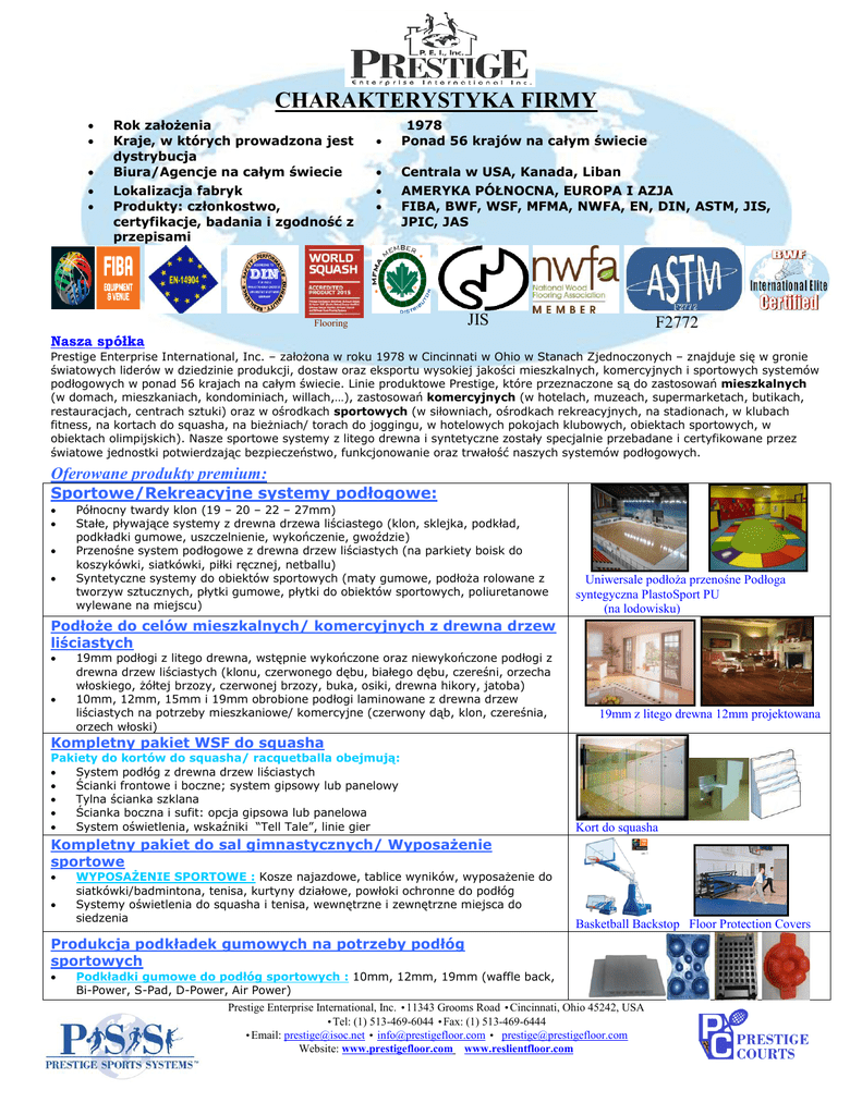 CHARAKTERYSTYKA FIRMY Rok założenia Kraje, w których prowadzona jest dystrybucja Biura/Agencje na całym świecie Lokalizacja fabryk Produkty: członkostwo, certyfikacje, badania i zgodność z przepisami 1978 Ponad 56 krajów na całym świecie Centrala w USA, Kanada, Liban AMERYKA PÓŁNOCNA, EUROPA I AZJA FIBA, BWF, WSF, MFMA, NWFA, EN, DIN, ASTM, JIS, JPIC, JAS Flooring JIS F2772 Nasza spółka Prestige Enterprise International, Inc. – założona w roku 1978 w Cincinnati w Ohio w Stanach Zjednoczonych – znajduje się w gronie światowych liderów w dziedzinie produkcji, dostaw oraz eksportu wysokiej jakości mieszkalnych, komercyjnych i sportowych systemów podłogowych w ponad 56 krajach na całym świecie. Linie produktowe Prestige, które przeznaczone są do zastosowań mieszkalnych (w domach, mieszkaniach, kondominiach, willach,…), zastosowań komercyjnych (w hotelach, muzeach, supermarketach, butikach, restauracjach, centrach sztuki) oraz w ośrodkach sportowych (w siłowniach, ośrodkach rekreacyjnych, na stadionach, w klubach fitness, na kortach do squasha, na bieżniach/ torach do joggingu, w hotelowych pokojach klubowych, obiektach sportowych, w obiektach olimpijskich). Nasze sportowe systemy z litego drewna i syntetyczne zostały specjalnie przebadane i certyfikowane przez światowe jednostki potwierdzając bezpieczeństwo, funkcjonowanie oraz trwałość naszych systemów podłogowych. Oferowane produkty premium: Sportowe/Rekreacyjne systemy podłogowe: Północny twardy klon (19 – 20 – 22 – 27mm) Stałe, pływające systemy z drewna drzewa liściastego (klon, sklejka, podkład, podkładki gumowe, uszczelnienie, wykończenie, gwoździe) Przenośne system podłogowe z drewna drzew liściastych (na parkiety boisk do koszykówki, siatkówki, piłki ręcznej, netballu) Syntetyczne systemy do obiektów sportowych (maty gumowe, podłoża rolowane z tworzyw sztucznych, płytki gumowe, płytki do obiektów sportowych, poliuretanowe wylewane na miejscu) Uniwersale podłoża przenośne Podłoga syntegyczna PlastoSport PU (na lodowisku) Podłoże do celów mieszkalnych/ komercyjnych z drewna drzew liściastych 19mm podłogi z litego drewna, wstępnie wykończone oraz niewykończone podłogi z drewna drzew liściastych (klonu, czerwonego dębu, białego dębu, czereśni, orzecha włoskiego, żółtej brzozy, czerwonej brzozy, buka, osiki, drewna hikory, jatoba) 10mm, 12mm, 15mm i 19mm obrobione podłogi laminowane z drewna drzew liściastych na potrzeby mieszkaniowe/ komercyjne (czerwony dąb, klon, czereśnia, orzech włoski) 19mm z litego drewna 12mm projektowana Kompletny pakiet WSF do squasha Pakiety do kortów do squasha/ racquetballa obejmują: System podłóg z drewna drzew liściastych Ścianki frontowe i boczne; system gipsowy lub panelowy Tylna ścianka szklana Ścianka boczna i sufit: opcja gipsowa lub panelowa System oświetlenia, wskaźniki “Tell Tale”, linie gier Kort do squasha Kompletny pakiet do sal gimnastycznych/ Wyposażenie sportowe WYPOSAŻENIE SPORTOWE : Kosze najazdowe, tablice wyników, wyposażenie do siatkówki/badmintona, tenisa, kurtyny działowe, powłoki ochronne do podłóg Systemy oświetlenia do squasha i tenisa, wewnętrzne i zewnętrzne miejsca do siedzenia Basketball Backstop Floor Protection Covers Produkcja podkładek gumowych na potrzeby podłóg sportowych Podkładki gumowe do podłóg sportowych : 10mm, 12mm, 19mm (waffle back, Bi-Power, S-Pad, D-Power, Air Power) Prestige Enterprise International, Inc. •11343 Grooms Road •Cincinnati, Ohio 45242, USA •Tel: (1) 513-469-6044 •Fax: (1) 513-469-6444 •Email: [email protected] • [email protected] • [email protected] Website: www.prestigefloor.com www.reslientfloor.com