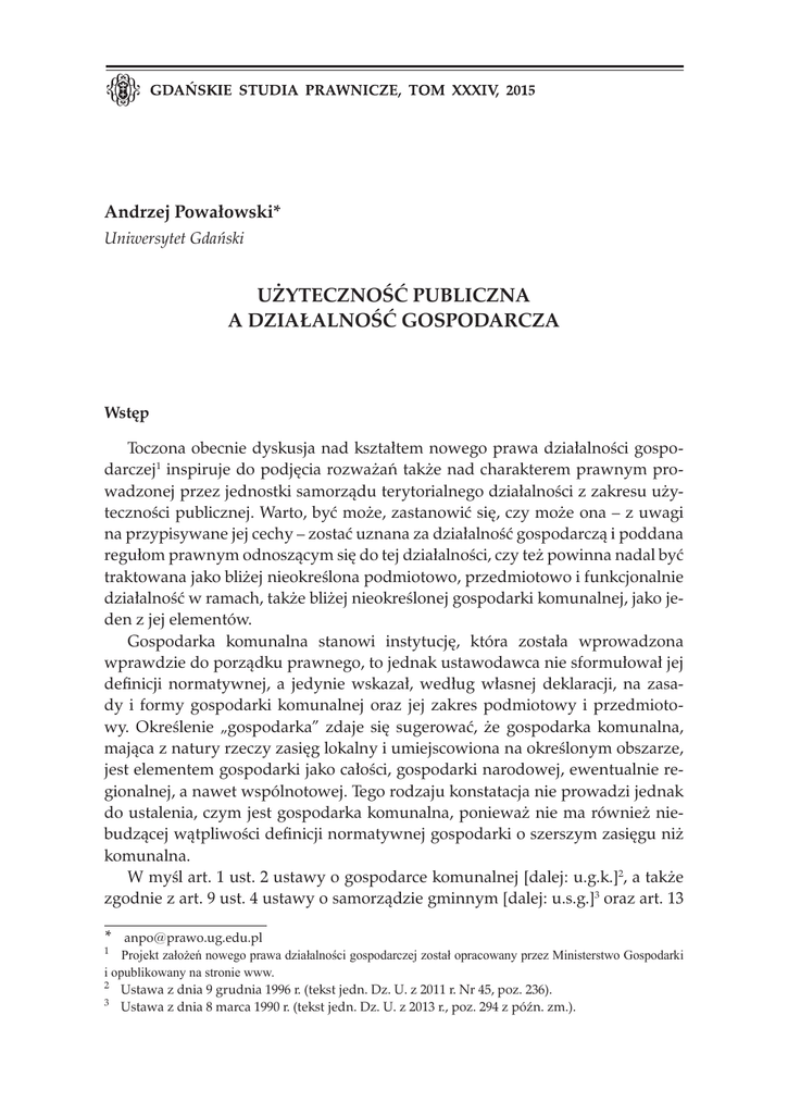 Andrzej Powałowski* Uniwersytet Gdański Użyteczność publiczna a działalność gospodarcza Wstęp Toczona obecnie dyskusja nad kształtem nowego prawa działalności gospodarczej1 inspiruje do podjęcia rozważań także nad charakterem prawnym prowadzonej przez jednostki samorządu terytorialnego działalności z zakresu użyteczności publicznej. Warto, być może, zastanowić się, czy może ona – z uwagi na przypisywane jej cechy – zostać uznana za działalność gospodarczą i poddana regułom prawnym odnoszącym się do tej działalności, czy też powinna nadal być traktowana jako bliżej nieokreślona podmiotowo, przedmiotowo i funkcjonalnie działalność w ramach, także bliżej nieokreślonej gospodarki komunalnej, jako jeden z jej elementów. Gospodarka komunalna stanowi instytucję, która została wprowadzona wprawdzie do porządku prawnego, to jednak ustawodawca nie sformułował jej definicji normatywnej, a jedynie wskazał, według własnej deklaracji, na zasady i formy gospodarki komunalnej oraz jej zakres podmiotowy i przedmiotowy. Określenie „gospodarka” zdaje się sugerować, że gospodarka komunalna, mająca z natury rzeczy zasięg lokalny i umiejscowiona na określonym obszarze, jest elementem gospodarki jako całości, gospodarki narodowej, ewentualnie regionalnej, a nawet wspólnotowej. Tego rodzaju konstatacja nie prowadzi jednak do ustalenia, czym jest gospodarka komunalna, ponieważ nie ma również niebudzącej wątpliwości definicji normatywnej gospodarki o szerszym zasięgu niż komunalna. W myśl art. 1 ust. 2 ustawy o gospodarce komunalnej [dalej: u.g.k.]2, a także zgodnie z art. 9 ust. 4 ustawy o samorządzie gminnym [dalej: u.s.g.]3 oraz art. 13 * [email protected] 1 Projekt założeń nowego prawa działalności gospodarczej został opracowany przez Ministerstwo Gospodarki i opublikowany na stronie www. 2 Ustawa z dnia 9 grudnia 1996 r. (tekst jedn. Dz. U. z 2011 r. Nr 45, poz. 236). 3 Ustawa z dnia 8 marca 1990 r. (tekst jedn. Dz. U. z 2013 r., poz. 294 z późn. zm.). 220 Andrzej Powałowski ust. 1 ustawy o samorządzie województwa [dalej: u.s.w.]4, tylko część gospodarki komunalnej to zadania użyteczności publicznej, tj. zadania nakierowane na bezpośrednie (bieżące i nieprzerwane) zaspokajanie zbiorowych potrzeb ludności w drodze świadczenia usług powszechnie dostępnych. Jeżeli chodzi o gospodarkę powiatu, to z mocy przepisu art. 6 ust. 2 ustawy o samorządzie powiatowym [dalej: u.s.p.]5. powiaty nie mogą prowadzić działalności gospodarczej wykraczającej poza zadania o charakterze użyteczności publicznej. Zarazem poza sferą użyteczności publicznej gmina i województwo mogą prowadzić działalność gospodarczą w sytuacjach, o których mowa w art. 10 u.g.k. Z powyższego wynika, że ustawodawca akceptuje okoliczność umiejscowienia działalności gospodarczej zarówno w obszarze użyteczności publicznej, jak i poza nią, nie oznaczając zarazem granicy pomiędzy obiema kategoriami aktywności. Stanowisko to powiela przepis art. 4 pkt 1a ustawy o ochronie konkurencji i konsumentów6, zgodnie z którym wyróżnić należy działalność (usługi) z zakresu użyteczności publicznej będące działalnością gospodarczą i analogiczne usługi niebędące działalnością gospodarczą. Poniżej podjęta zostanie próba charakterystyki użyteczności publicznej jako działalności polegającej na świadczeniu szczególnego rodzaju usług na tle cech działalności gospodarczej. Jej celem jest ustalenie podobieństw i odmienności w zakresie normatywnego postrzegania obydwu rodzajów aktywności określanych porządkiem prawnym wyznaczonym obecnie przez ustawę o swobodzie działalności gospodarczej i ustawę o gospodarce komunalnej. 1. Aspekt podmiotowy użyteczności publicznej i działalności gospodarczej Do organów stanowiących samorządu terytorialnego należy ustalenie, jakie podmioty wykonywać będą poszczególne zadania i czynności ze sfery gospodarki komunalnej. Możliwe jest przyjęcie – stosownie do przepisów u.g.k. – że zadania te i czynności: a) wykonywane będą bezpośrednio przez jednostki samorządu – podmioty mające osobowość prawną – lub zostaną one przypisane wyspecjalizowanym jednostkom organizacyjnym samorządu terytorialnego, podporządkowanym temu samorządowi, w szczególności samorządowym zakładom budżetowym; b) powierzone zostaną spółkom prawa handlowego utworzonym przez dany samorząd terytorialny lub spółkom, do których samorząd ten przystąpi (art. 9 u.g.k.); c) będą realizowane przez osoby fizyczne, osoby prawne lub jednostki organizacyjne niebędące osobami prawnymi na podstawie umowy zawartej bądź na zasadach ogólnych, bądź z uwzględnieniem odpowiednio przepisów o finansach publicznych, o partnerstwie publiczno-prywatnym, o koncesji na roboty budowlane lub usługi, o zamówieniach publicznych, o działalności po4 5 6 Ustawa z dnia 5 czerwca 1998 r. (tekst jedn. Dz. U. z 2013 r., poz. 596 z późn. zm.). Ustawa z dnia 5 czerwca 1998 r. (tekst jedn. Dz. U. z 2013 r., poz. 595 z późn. zm.). Ustawa z dnia 16 lutego 2007 r. (tekst jedn. Dz. U. z 2015 r., poz. 184). Użyteczność publiczna a działalność gospodarcza 221 żytku publicznego i o wolontariacie oraz o publicznym transporcie zbiorowym (art. 3 ust. 1 u.g.k.). Oczywiste jest to, iż wszystkie jednostki samorządu terytorialnego są podmiotami gospodarki komunalnej. Trzeba przy tym zauważyć, że podmiotowość ta wyznaczona jest rodzajem zadań wykonywanych przez jednostki samorządu terytorialnego. Mogą one bowiem – jak to wynika z Konstytucji RP (art. 166 ust. 1 i 2) – realizować zarówno zadania własne, jak i te, które określone są mianem „zleconych”. Jednak zgodnie z treścią art. 1 u.g.k., jedynie wtedy, kiedy jednostki samorządu terytorialnego wykonują zadania własne, to prowadzą gospodarkę komunalną, a więc są jej podmiotami, jeśli zaś realizu