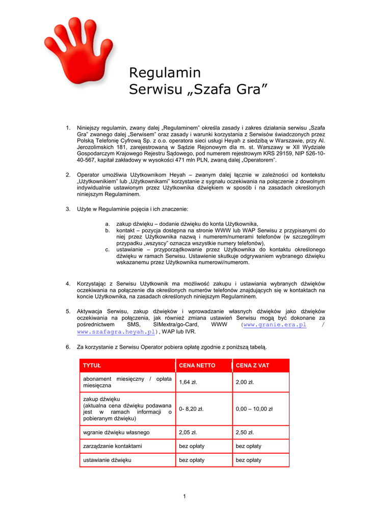 Regulamin Serwisu „Szafa Gra” 1. Niniejszy regulamin, zwany dalej „Regulaminem” określa zasady i zakres działania serwisu „Szafa Gra” zwanego dalej „Serwisem” oraz zasady i warunki korzystania z Serwisów świadczonych przez Polską Telefonię Cyfrową Sp. z o.o. operatora sieci usługi Heyah z siedzibą w Warszawie, przy Al. Jerozolimskich 181, zarejestrowaną w Sądzie Rejonowym dla m. st. Warszawy w XII Wydziale Gospodarczym Krajowego Rejestru Sądowego, pod numerem rejestrowym KRS 29159, NIP 526-1040-567, kapitał zakładowy w wysokości 471 mln PLN, zwaną dalej „Operatorem”. 2. Operator umożliwia Użytkownikom Heyah – zwanym dalej łącznie w zależności od kontekstu „Użytkownikiem” lub „Użytkownikami” korzystanie z sygnału oczekiwania na połączenie z dowolnym indywidualnie ustawionym przez Użytkownika dźwiękiem w sposób i na zasadach określonych niniejszym Regulaminem. 3. Użyte w Regulaminie pojęcia i ich znaczenie: a. b. c. zakup dźwięku – dodanie dźwięku do konta Użytkownika, kontakt – pozycja dostępna na stronie WWW lub WAP Serwisu z przypisanymi do niej przez Użytkownika nazwą i numerem/numerami telefonów (w szczególnym przypadku „wszyscy” oznacza wszystkie numery telefonów), ustawianie – przyporządkowanie przez Użytkownika do kontaktu określonego dźwięku w ramach Serwisu. Ustawienie skutkuje odgrywaniem wybranego dźwięku wskazanemu przez Użytkownika numerowi/numerom. 4. Korzystając z Serwisu Użytkownik ma możliwość zakupu i ustawiania wybranych dźwięków oczekiwania na połączenie dla określonych numerów telefonów znajdujących się w kontaktach na koncie Użytkownika, na zasadach określonych niniejszym Regulaminem. 5. Aktywacja Serwisu, zakup dźwięków i wprowadzanie własnych dźwięków jako dźwięków oczekiwania na połączenia, jak również zmiana ustawień Serwisu mogą być dokonane za (www.granie.era.pl / pośrednictwem SMS, SIMextra/go-Card, WWW www.szafagra.heyah.pl), WAP lub IVR. 6. Za korzystanie z Serwisu Operator pobiera opłatę zgodnie z poniższą tabelą. TYTUŁ CENA NETTO CENA Z VAT abonament miesięczny / opłata miesięczna 1,64 zł. 2,00 zł. zakup dźwięku (aktualna cena dźwięku podawana jest w ramach informacji o pobieranym dźwięku) 0- 8,20 zł. 0,00 – 10,00 zł wgranie dźwięku własnego 2,05 zł. 2,50 zł. zarządzanie kontaktami bez opłaty bez opłaty ustawianie dźwięku bez opłaty bez opłaty 1 próbne odsłuchanie utworu na stronie internetowej Serwisu ( www.szafagra.heyah.pl/ lub www.granie.era.pll) bez opłaty bez opłaty aktywacja, dezaktywacja, zawieszenie, odwieszenie Serwisu bez opłaty bez opłaty 7. Nowy Użytkownik, który aktywował Serwis po raz pierwszy, nie ponosi opłaty abonamentowej do końca cyklu rozliczeniowego, w którym nastąpiła aktywacja Serwisu oraz w okresie kolejnego, pełnego cyklu rozliczeniowego. O zbliżającym się zakończeniu bezpłatnego okresu Użytkownik zostanie poinformowany przez Operatora poprzez wiadomość SMS. Po tym okresie rozpocznie się naliczanie miesięcznej opłaty abonamentowej. Opłaty za dźwięki naliczane są niezależnie. 8. Niezależnie od wskazanej powyżej opłaty za korzystanie z Serwisu, pobierana jest opłata za wykorzystanie kanału dostępu do Serwisu zgodnie z poniższą tabelą. OPŁATA SMS pod 333 go-Card w Usłudze Heyah/ Sim Extra w sieci Era jak za SMS wewnątrzsieciowy w taryfie Użytkownika jak za korzystanie Użytkownika z SIMextra/go-Card w WWW wg. cennika dostawcy Internetu dla Użytkownika WAP opłata za połączenie WAP w taryfie Użytkownika IVR pod numerem 888925333 dla Heyah oraz 608925333 dla Ery połączenie bezpłatne taryfie Serwisy Partnerskie: jak za SMS wewnątrzsieciowy w taryfie Użytkownika SMS pod 33xx 9. Obsługa Serwisu przez SMS, SIMextra/go-Card, WWW (www.granie.era.pl / www.szafagra.heyah.pl), WAP, oraz IVR przebiega zgodnie z instrukcjami podanymi w tych kanałach dostępu lub informacją FAQ umieszczoną na stronie internetowej Serwisu. 10. Aktywacja Serwisu przez Operatora następuje przy pierwszym zakupie dźwięku lub wgraniu własnego dźwięku przez Użytkownika. Serwis jest aktywny do momentu ręcznej dezaktywacji przez Użytkownika. W momencie dezaktywacji wszystkie dźwięki oraz ustawienia Użytkownika związane z Serwisem zostają bezpowrotnie usunięte. 11. W ramach Serwisu Użytkownik będzie otrzymywał komunikaty SMS, informujące o aktualnych ustawieniach na koncie Użytkownika i zawierające informację o możliwości zakupu nowego utworu z Serwisu. Komunikaty będą wysyłane do Użytkownika nie częściej niż raz w tygodniu. 12. Zawieszenie Serwisu bądź poszczególnych jego ustawień przez Użytkownika powoduje okresową przerwę w korzystaniu z Serwisu w pełnym bądź częściowym zakresie. Zawieszenie trwa od momentu ręcznego zawieszenia Serwisu przez Użytkownika do momentu ręcznego odwieszenia Serwisu przez Użytkownika. Zawieszenie nie powoduje utraty pobrań dźwięków ani definicji ustawień. W okresie zawieszenia jest naliczany abonament miesięczny/opłata miesięczna. 13. Operator zastrzega sobie prawo do usunięcia zakupionego dźwięku z konta Użytkownika w przypadku zakończenia okresu posiadania przez Operatora licencji na wykorzystywanie przez Operatora utworu w Serwisie. Użytkownik zostanie poinformowany poprzez wiadomość SMS o usunięciu dźwięku oraz otrzyma od Operatora bezpłatnie inny dźwięk. 2 14. Nagrania własne wprowadzone do Serwisu nie mogą naruszać praw osób trzecich oraz dobrych obyczajów. Konsekwencją wprowadzenia przez Użytkownika do Serwisu nagrania własnego, które narusza prawa osób trzecich bądź dobre obyczaje, może być usunięcie przez Operatora nagrania z Serwisu oraz żądanie pokrycia przez Użytkownika wszelkich strat Operatora związanych z żądaniami osób, których prawa zostały naruszone. Użytkownik zrzeka się roszczeń z tytułu autorskich praw majątkowych