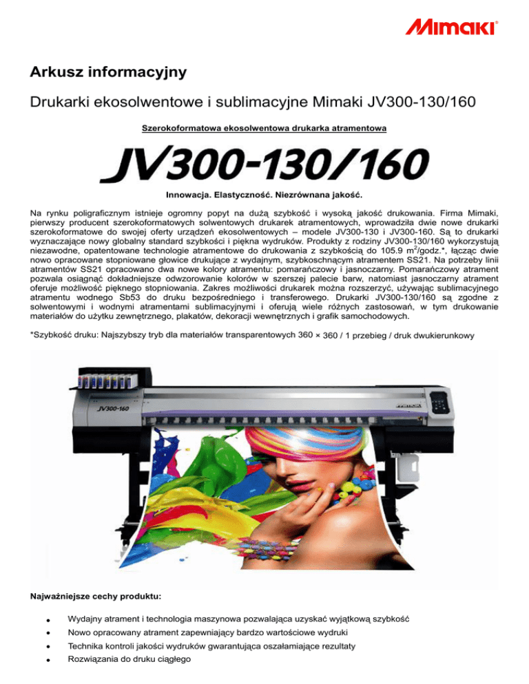 Arkusz informacyjny Drukarki ekosolwentowe i sublimacyjne Mimaki JV300-130/160 Szerokoformatowa ekosolwentowa drukarka atramentowa Innowacja. Elastyczność. Niezrównana jakość. Na rynku poligraficznym istnieje ogromny popyt na dużą szybkość i wysoką jakość drukowania. Firma Mimaki, pierwszy producent szerokoformatowych solwentowych drukarek atramentowych, wprowadziła dwie nowe drukarki szerokoformatowe do swojej oferty urządzeń ekosolwentowych – modele JV300-130 i JV300-160. Są to drukarki wyznaczające nowy globalny standard szybkości i piękna wydruków. Produkty z rodziny JV300-130/160 wykorzystują niezawodne, opatentowane technologie atramentowe do drukowania z szybkością do 105.9 m2/godz.*, łącząc dwie nowo opracowane stopniowane głowice drukujące z wydajnym, szybkoschnącym atramentem SS21. Na potrzeby linii atramentów SS21 opracowano dwa nowe kolory atramentu: pomarańczowy i jasnoczarny. Pomarańczowy atrament pozwala osiągnąć dokładniejsze odwzorowanie kolorów w szerszej palecie barw, natomiast jasnoczarny atrament oferuje możliwość pięknego stopniowania. Zakres możliwości drukarek można rozszerzyć, używając sublimacyjnego atramentu wodnego Sb53 do druku bezpośredniego i transferowego. Drukarki JV300-130/160 są zgodne z solwentowymi i wodnymi atramentami sublimacyjnymi i oferują wiele różnych zastosowań, w tym drukowanie materiałów do użytku zewnętrznego, plakatów, dekoracji wewnętrznych i grafik samochodowych. *Szybkość druku: Najszybszy tryb dla materiałów transparentowych 360 × 360 / 1 przebieg / druk dwukierunkowy Najważniejsze cechy produktu: Wydajny atrament i technologia maszynowa pozwalająca uzyskać wyjątkową szybkość Nowo opracowany atrament zapewniający bardzo wartościowe wydruki Technika kontroli jakości wydruków gwarantująca oszałamiające rezultaty Rozwiązania do druku ciągłego Wyjątkowa wydajność 1. Zaawansowane technologie wydajnych atramentów i ekosolwentowych drukarek atramentowych pozwalają osiągnąć niezrównaną szybkość. 1)Nowo opracowana głowica i technologia atramentowa Dwie nowe stopniowane głowice drukujące pokrywają większy obszar podłoża. Każdy z kolorów atramentu charakteryzuje się własnym ciężarem i lepkością. Aby zapewnić precyzyjne rozmieszczenie kropelek atramentu na podłożu, firma Mimaki zaprojektowała optymalną falowaną konstrukcję, która umożliwia głowicy nakładanie każdego z kolorów pod odpowiednim kątem bez zaburzania doskonałego okrągłego kształtu kropelek atramentu (Rysunek 1). Technologia zapewnia ponadto precyzyjne nakładanie kropelek atramentu o różnych rozmiarach – od wielkości minimalnej 4 pl po maksymalną 35 pl. Małe kropelki zapewniają wysoką rozdzielczość i piękne rezultaty, natomiast duże są bardzo przydatne podczas drukowania w trybie szybkim. Drukarki Mimaki JV300-130/160 stanowią odpowiedź na wiele wymagań klientów, oferując piękne, wysokiej jakości wydruki z szybkością zapewniającą wydajność. Rysunek 1: Ilustracja rozmieszczenia kropelek t t ■ Kropelki atramentu w kształcie niemal doskonałych okręgów Kropelki atramentu są nakładane precyzyjnie bez deformacji, zachowując w locie okrągły kształt. ■ Kropelki atramentu w kształcie zdeformowanych okręgów Jeśli kropelki atramentu ulegają w locie deformacji, nie są dokładnie nakładane z powodu nieprawidłowego kąta nakładania lub rozbicia w powietrzu. 2)Szybkoschnący atrament SS21 zapewniający wyjątkową szybkość Atrament SS21 został opracowany w oparciu o rozległą wiedzę i technologie firmy Mimaki w zakresie druku atramentowego. Atrament SS21 szybko wysycha dzięki odpowiedniej równowadze pomiędzy penetracją podłoża i odparowywaniem rozpuszczalnika. Drukowanie z dużą szybkością i gęstością bez ryzyka zapchania lub rozmazywania atramentu pozwala osiągnąć wysoką wydajność. ■JV300-160, PVC (atrament SS21)4C ■JV300-160, transparent (atrament SS21) 4C ㎡/godz. ㎡/godz. ■JV300-160, PVC (atrament SS21) 8C ■JV300-160, transparent (atrament SS21)8C ㎡/godz. ㎡/godz. 2. Atrament SS21 zapewnia wartościowe wydruki. 1) Szeroka gama kolorów atramentu, w tym nowo opracowane kolory. Atrament SS21 jest dostępny w dziewięciu kolorach, w tym w nowo opracowanym pomarańczowym i jasnoczarnym. Optymalny zestaw atramentów jest dobierany w zależności od zastosowania. ■ Kolory atramentu Błękitny (C), purpurowy (M), żółty (Y), czarny (K), jasnobłękitny (Lc), jasnopurpurowy (Lm), biały (W), pomarańczowy (Or) i jasnoczarny (Lk) ■ Zestaw atramentów 1) Cztery kolory do szybkiego drukowania 2) Osiem kolorów do gładkich i żywych wydruków 3) Sześć kolorów plus dwa białe do szybkiego drukowania w bieli Rysunek 2: Wpływ pomarańczowego atramentu. 2) Pomarańczowy atrament poszerza gamę odwzorowanych kolorów. Bez pomarańczowego atramentu Z pomarańczowym atramentem Wykorzystanie nowo opracowanego pomarańczowego atramentu SS21 jako koloru procesowego pozwala dokładnie odzwierciedlić 92% barw na skali PANTONE. Zapewniana przez pomarańczowy atrament szersza gama kolorów pozwala symulować świeżość jedzenia i wiernie przedstawić barwy firmowe (Rysunek 2). 3) Jasnoczarny atrament ułatwia drukowanie pięknych obrazów w czerni. Nowy jasnoczarny atrament SS21 z doskonałą kontrolą skali szarości zapewnia dokładne wydruki bez nieoczekiwanych zmian kolorystycznych, tworząc gładkie, idealne odcienie skóry i gradację skali szarości (Rysunek 3). Nieoczekiwana zmiana koloru; wydruk wydaje się czerwonawy. Płynna gradacja bez zmiany koloru. Bez jasnoczarnego atramentu Z jasnoczarnym atramentem Bez jasnoczarnego atramentu Rysunek 3: Porównanie obrazów z i bez jasnoczarnego atramentu. Z jasnoczarnym atramentem 4) Biały atrament podkreśla barwy atramentu. Dzięki większym rozmiarom kropelek atramentu drukarki JV300-130/160 mogą drukować w bieli z większą gęstością ni