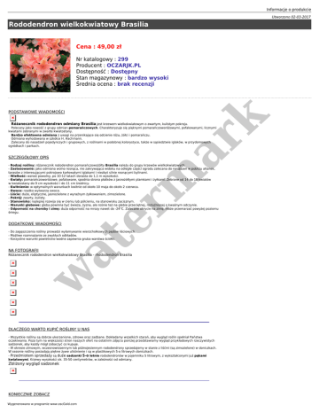 Informacje o produkcie Utworzono 02-03-2017 Rododendron wielkokwiatowy Brasilia Cena : 49,00 zł Nr katalogowy : 299 Producent : OCZARJK.PL Dostępność : Dostępny Stan magazynowy : bardzo wysoki Średnia ocena : brak recenzji er m ar k PODSTAWOWE WIADOMOŚCI Różanecznik rododendron odmiany Brasilia jest krzewem wielkokwiatowym o zwartym, kulistym pokroju. Polecany jako nowość z grupy odmian pomarańczowych. Charakteryzuje się pięknymi pomarańczoworóżowymi, pofalowanymi, licznymi kwiatami zebranymi w zwarte kwiatostany. Bardzo efektowna odmiana z uwagi na przenikające się odcienie różu, żółci i pomarańczu. Odmiana wyhodowana w szkółce H. Hachmann. Zalecany do nasadzeń pojedynczych i grupowych, z roślinami w podobnej kolorystyce, także w sąsiedztwie iglaków, w przydomowych ogródkach i parkach. SZCZEGÓŁOWY OPIS - Rodzaj rośliny: różanecznik rododendron pomarańczowożółty Brasilia należy do grupy krzewów wielkokwiatowych. - Zastosowanie: jako odmiana wolno rosnąca, nie zakrywająca widoku na odległe części ogrodu zalecana do nasadzeń w pobliżu altanek, tarasów z interesującymi pokrojowo karłowatymi iglakami i niezbyt silnie rosnącymi bylinami. - Wielkość: wzrost powolny, po 10-12 latach dorasta do 1,1 m wysokości. - Kwiaty: pomarańczoworóżowe, pofalowane, spodnia strona płatków z jasnożółtymi plamkami i żyłkami. Zebrane od 14 do 18 kwiatów w kwiatostany do 9 cm wysokości i do 11 cm średnicy. - Kwitnienie: w optymalnych warunkach kwitnie od około 10 maja do około 2 czerwca. - Owoce: rzadko wytwarza owoce. - Liście: duże, eliptyczne, jasnozielone z wyraźnym żyłkowaniem, zimozielone. - Pokrój: zwarty, kulisty. - Stanowisko: najlepiej rozwija się w cieniu lub półcieniu, na stanowisku zacisznym. - Warunki glebowe: gleba powinna być świeża, żyzna, ale rośnie też na glebie przeciętnej, rozluźnionej o kwaśnym odczynie. - Odporność na choroby i zimę: duża odporność na mrozy nawet do -24°C. Zalecane okrycie na zimę, może przemarzać powyżej poziomu śniegu. DODATKOWE WIADOMOŚCI NA FOTOGRAFII at - Do zagęszczenia rośliny prowadzi wyłamywanie wierzchołkowych pędów liściowych. - Możliwe rozmnażanie ze zwykłych odkładów. - Korzystne warunki powietrzno-wodne zapewnia gruba warstwa ściółki. w Różanecznik rododendron wielkokwiatowy Brasilia - rhododendron Brasilia DLACZEGO WARTO KUPIĆ ROŚLINY U NAS - Wszystkie rośliny są dobrze ukorzenione, zdrowe oraz zadbane. Dokładamy wszelkich starań, aby wygląd roślin spełniał Państwa oczekiwania. Poza tym na większości stron naszych ofert na ostatnim zdjęciu poniżej przedstawiamy wygląd przykładowych rzeczywistych sadzonek, aby każdy mógł zobaczyć co kupuje. - W okresie zimowym, wczesnowiosennym lub późnojesiennym rododendrony sprzedajemy w stanie z liśćmi (są zimozielone) w doniczkach. W sezonie rośliny posiadają piękne żywe ulistnienie i są w plastikowych 5-o litrowych doniczkach. - Przedmiotem sprzedaży są duże sadzonki 5-o letnie rododendronów w pojemniku 5 litrowym, z wykształconymi już pąkami kwiatowymi. Krzewy wysokości ok. 35-50 centymetrów, w zależności od odmiany. Zbliżony wygląd sadzonek KONIECZNIE ZOBACZ Wygenerowano w programie www.oscGold.com er m ar k at w