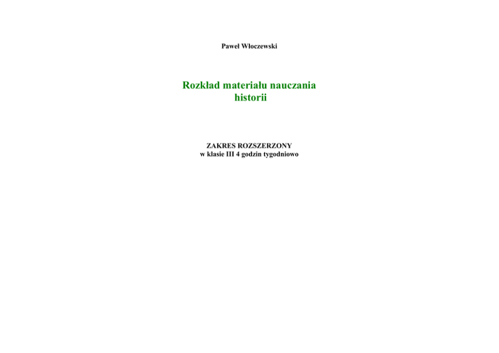 Paweł Włoczewski Rozkład materiału nauczania historii ZAKRES ROZSZERZONY w klasie III 4 godzin tygodniowo dział numer kolejny temat treści nauczania 1 I. Wiek XVI i początek wieku XVII Wielkie odkrycia geograficzne w XV i XVI wieku. 1. Uwarunkowania i cele wypraw. 2. Państwowości i osiągnięcia cywilizacyjne ludów pozaeuropejskich. 3. Powstanie i organizacja zamorskich imperiów Hiszpanii i Portugalii. 4. Konsekwencje wypraw. 2 I. Wiek XVI i początek wieku XVII Kierunki rozwoju gospodarczego i społecznego Europy w XV i XVI wieku. 3 I. Wiek XVI i początek wieku XVII Humanizm i początki nowożytnej ideologii politycznej. 1. Sytuacja demograficzna Europy. 2. XV- i XVI-wieczna wynalazczość. 3. Upowszechnienie się gospodarki towarowopieniężnej. 4. Nowe formy wytwórczości. 5. „Rewolucja cen” i dualizm w rozwoju ekonomicznym Starego Kontynentu. 1. Źródła przeobrażeń kulturowych w Europie w XV i XVI wieku. 2. Nowe koncepcje świata i człowieka. 3. Pojęcie i przejawy XVI-wiecznego humanizmu. 4. Nowożytne ideologie polityczne. 4 I. Wiek XVI i początek wieku XVII Odrodzenie w Europie. 1. Pojęcie i charakter sztuki renesansu. 2. Architektura, sztuki plastyczne i literatura piękna Odrodzenia we Włoszech. 3. Życie artystyczne w krajach „na północ od Alp”. 5 I. Wiek XVI i początek wieku XVII Geneza i rozwój reformacji w Niemczech w XVI wieku. 1. Sytuacja wewnętrzna Kościoła u progu XVI wieku. 2. Niemcy w początkach XVI stulecia. 3. Wystąpienie Marcina Lutra i jego doktryna. 4. Walki społeczno-religijne w Rzeszy: a) program i losy radykalnego oraz książęcego nurtu reformacji. 5. Pokój religijny w Augsburgu. ważniejsze pojęcia, daty i postaci konkwistador, bilans handlowy, karaka, karawela; 1492, 1494, 1498, 1519-1522, 1531-1534; Krzysztof Kolumb, Ferdynand Magellan, Hernan Cortez, Vasco da Gama; system nakładczy, manufaktura, „rewolucja cen”, dualizm ekonomiczny; 1455; Jan Gutenberg; Kalendarz antropocentryzm, humanizm, suwerenność, absolutyzm, utopia, ideologia, doktryna; Leonardo da Vinci, Niccolo Machiavelli, Erazm z Rotterdamu, Jean Bodin, Thomas More; Odrodzenie, mecenat; Leonardo da Vinci, Michał Anioł, Rafael Santi, Tycjan, Donato Bramante, Filip Brunelleschi, William Szekspir; reformacja, luteranizm (protestantyzm, ewangelicyzm), anabaptyzm; 1517, 1555; Marcin Luter, Leon X, Karol V, Filip Melanchton, Tomasz Münzer; 2 6 I. Wiek XVI i początek wieku XVII Reformacja w innych krajach Europy Zachodniej w XVI wieku. 1. Geneza, losy i skutki reformacji w: a) Szwajcarii b) Francji c) Anglii. 7 I. Wiek XVI i początek wieku XVII Kościół katolicki wobec reformacji. 8 I. Wiek XVI i początek wieku XVII Walka o hegemonię w Europie Zachodniej u schyłku XV i w XVI wieku. 1. Reforma wewnętrzna Kościoła – sobór w Trydencie. 2. Walka z reformacją: a) inkwizycja b) indeks ksiąg zakazanych c) jezuici. 3. Działalność misyjna Kościoła w XVI i XVII wieku: a) powstanie Kongregacji do Spraw Wiary. 1. Przeobrażenia w europejskiej wojskowości. 2. Imperium Habsburgów. 3. Francja w dobie rządów ostatnich Walezjuszy. 4. Sytuacja polityczna w Hiszpanii. 5. Wojny włoskie. 9 I. Wiek XVI i początek wieku XVII Europa Środkowo-Wschodnia i 1. Zjednoczenie ziem ruskich pod egidą Moskwy. kraje skandynawskie w XVI i 2. Ustrój polityczny, społeczny i gospodarczy XVII wieku. państwa moskiewskiego w XV stuleciu. 3. Rozwój terytorialny Rosji w XVI wieku. 4. Polityka wewnętrzna Iwana IV Groźnego. 5.. Rozrost terytorialny Porty Osmańskiej: a) sprawa Węgier. 6. Upadek znaczenia Danii. 7. Mocarstwowa pozycja Szwecji w Europie w XVII w. zwinglianizm, kalwinizm, hugenotyzm, anglikanizm; 1522, 1541, 1534, 1598,; Ulrich Zwingli, Jan Kalwin, Henryk VIII Tudor, Maria Tudor, Elżbieta I, Henryk IV Burbon, Filip II, Maria Stuart; kontrreformacja, jezuici, indeks ksiąg zakazanych; 1540, 1542, 1545-1563, 1622; Paweł III, Ignacy Loyola; wojsko zaciężne, czworobok; 1469, 14941559, 1525; Izabela Kastylijska, Ferdynand Aragoński, Karol I, Maksymilian I Habsburg, Franciszek I Walezjusz, Karol VIII, Filip II; bojarstwo, dworianie, oprycznina; 1380, 1480, 1565; 1541, 1571; Dymitr Doński, Iwan IV Groźny., Sulejman Wspaniały, Ludwik II Jagiellończyk, Jan Zapolya, Gustaw Waza, Gustaw Adolf; 3 10 I. Wiek XVI i początek wieku XVII Gospodarka folwarcznopańszczyźniana w Polsce. 1. Geneza i powstawanie folwarku pańszczyźnianego. 2. Polityka szlachty względem chłopstwa i mieszczaństwa. 3. Rozwarstwienie stanu szlacheckiego. 11 I. Wiek XVI i początek wieku XVII Kształtowanie się demokracji szlacheckiej w Polsce 1. Rozwój przywilejów szlacheckich od XIV do XVI stulecia. 2. Geneza i organizacja sejmu walnego. 3. Ruch egzekucyjny 12 I. Wiek XVI i początek wieku XVII Reformacja i kontrreformacja na ziemiach polskich w XVI wieku. 1. Podłoże ruchu reformacyjnego. 2. Główne kierunki reformacji. 3. Tolerancja religijna. 4. Polityka kontrreformacyjna w XVI-wiecznej Rzeczypospolitej. folwark pańszczyźniany, pańszczyzna, szlachtagołota, nobilitacja, indygenat, refeudalizacja; 1388, 1423, 1454, 1493, 1496, 1505, 1518, 1520; Władysław II Jagiełło, Kazimierz Jagiellończyk, Jan Olbracht, Zygmunt I Stary; sejm walny, konstytucja sejmowa, sejmik, przywilej; 1355, 1374, 1422, 1433, 1454, 1496, 1501, 1504, 1505; Ludwik Andegaweński, Władysław II Jagiełło, Kazimierz Jagiellończyk, Jan Olbracht, Aleksander Jagiellończyk, Zygmunt I Stary; egzekucja praw i dóbr; 1504, 1505, 1562; Zygmunt I Stary, Zygmunt II August; Bracia Polscy (arianie), konfederacja generalna, unici, dyzunici; 1562-1565, 1570, 1573, 1595; Faust Socyn, Piotr z Goniądza, Mikołaj Sienicki, Zygmunt III Waza, Piotr Skarga; 4 13 I. Wiek XVI i początek wieku XVII Polityka zagraniczna ostatnich Jagiellonów. 14 I. Wiek XVI i początek wieku XVII Początki Rzeczypospolitej Obojga Narodów. 15 I. Wiek XVI i początek wieku XVII Pierwsza wolna elekcja w Rzeczypospolitej. 1. Między
