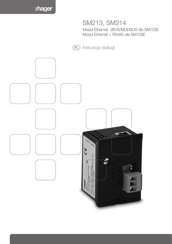 SM213, SM214 Moduł Ethernet JBUS/MODBUS dla SM103E Moduł Ethernet + RS485 dla SM103E Æ Instrukcja obsługi Æ Spis treści Przygotowanie................................................................ 1 Informacje ogólne .......................................................... 1 Montaż ............................................................................ 3 Diagnostyka wzrokowa ................................................ 4 Programowanie ............................................................. 5 Wejście w tryb programowania (COde= 100) ..................... 5 Konfiguracja parametrów sieci Ethernet w module SM103E .. 6 Adres IP ................................................................... 7 Maska ..................................................................... 8 Bramka ................................................................... 9 DHCP ...................................................................... 9 Parametry związane z protokołem MODBUS RTU i z ............... bramką RS485 ......................................................... 10 Adres komunikacji..................................................... 11 Prędkość transmisji danych ......................................... 11 Kontrola parzystości .................................................. 12 Bity stopu ............................................................... 12 Wyjście z trybu programowania .................................... 12 Serwer web ............................................................. 13 Warunki środowiskowe i rodzaj badania ......................... 13 Dane techniczne........................................................... 14 Warunki środowiskowe i rodzaj badania ......................... 14 Tabela komunikacji .................................................... 14 Przygotowanie W celu zapewnienia bezpieczeństwa personelu i sprzętu przed uruchomieniem urządzenia należy uważnie zaznajomić się z treścią niniejszej instrukcji. Przy odbiorze przesyłki należy sprawdzić : • • • • stan opakowania; czy produkt nie został uszkodzony w czasie transportu; czy urządzenie jest zgodne z zamówieniem; czy opakowanie zawiera produkt oraz instrukcję użytkowania. Informacje ogólne Moduł jest dostępny w dwóch wersjach : • moduł Ethernet (nr kat. SM213),) • moduł Ethernet z bramką MODBUS RTU (nr kat. SM214). Funkcje Funkcje i połączenia sieciowe Określenie adresu MODBUS urządzenia SM103E jest obowiązkowe, aby było możliwe stosowanie protokołu MODBUS RTU over TCP. Ponadto aby możliwe było korzystanie z bramki RS485, konieczne jest określenie następujących parametrów: prędkość transmisji, bity stopu, kontrola parzystości. • Serwer WWW ...................................................................... Liczba możliwych połączeń : ........................................... 4 • Protokoły MODBUS/TCP .................................................... Port komunikacyjny : ....................................................... 502 Liczba możliwych połączeń : .............................................. 4 • Protokół JBUS/MODBUS RTU over TCP........................... Port komunikacyjny : .................................................... 503 Liczba możliwych połączeń : ........................................... 4 Opcjonalny moduł Ethernet powinien być połączony z modułem SM103E. Moduł umożliwia połączenie z siecią Ethernet 10BaseT lub 100BaseT. W szczególności moduł umożliwia obsługiwanie i monitorowanie rejestratorów z komputera PC lub sterownika PLC. Uwaga Liczba dostępnych połączeń jest zależna od stosowanego wariantu. Moduł Ethernet (nr kat. SM213) • Połączenie ze złączem RJ45. • Protokół MODBUS/TCP i JBUS/MODBUS RTU over TCP. • Serwer WWW umożliwiający przeglądanie głównych wielkości i konfigurowanie produktu. SM103E Ethernet RJ45 PLC TCP/IP (RJ45), maksymalnie 4 klientów Moduł Ethernet z bramką MODBUS RTU (nr kat. SM214) • Oprócz komunikacji w standardzie Ethernet (patrz moduł opcjonalny Ethernet SM213) moduł opcjonalny SM214 umożliwia również połączenie szeregowe RS485 (2- lub 3-przewodowe) zgodne z protokołem JBUS/MODBUS®. Umożliwia on eksploatację modułu SM103E z komputera PC lub sterownika PLC. 1 Bramka tego modułu opcjonalnego umożliwia wykorzystanie go jako urządzenia nadrzędnego (master) w sieci Jbus/Modbus w standardzie RS485 z maksymalnie 246 urządzeniami podrzędnymi (slave). W tym celu należy skonfigurować adres Jbus/Modbus inny niż 255. W typowej konfiguracji złącze RS485 umożliwia podłączenie 31 modułów SM102E lub SM103E lub innych urządzeń produktów komunikujących się z komputerem PC lub automatem PLC na odległość do 1200 metrów z zastosowaniem protokołu JBUS/MODBUS. SM103E N1 Ethernet RS485 R=120 RJ45 N2 Nn R=120 PLC ~ – 1200 M lub 32 UL TCP/IP (RJ45) ), maksymalnie 4 klientów DBUS, maksymalnie 246 urządzeń podrzędnych (slave) Repeater SM103E N1 Ethernet RS485 R=120Ω RJ45 PLC TCP/IP (RJ45)), maksymalnie 4 klientów Nn R=120Ω + - ~ – 1200 M lub 32 UL + - R=120Ω R=120Ω ~ – 1200 M lub 32 UL MODBUS, maksymalnie 246 urządzeń podrzędnych (slave) Zalecenia Uwaga Jest konieczne stosowanie skrętki ekranowanej typu LIYCY. W środowisku, w którym występują zakłócenia, lub w sieci o znacznej długości i dużej liczbie urządzeń zaleca się stosowanie skrętki ekranowanej do transmisji danych typu LIYCY-CY. W przypadku przekroczenia długości 1200 m i/lub liczby 31 urządzeń jest niezbędne podłączenie repeatera (1 kanał) lub rozdzielacza (4 kanały) w celu umożliwienia instalacji dodatkowych modułów SM103E w odległości przewyższającej 1200 m. Prosimy o kontakt w celu uzyskania dalszych informacji dotyczących sposobu montażu. Na obu końcach przewodu należy zainstalować opornik 120 omów, który znajduje się w dodatkowym module. 2 Montaż Zasilanie modułu S