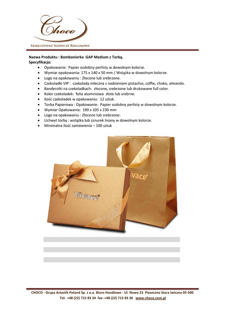 Nazwa Produktu : Bombonierka GAP Medium z Torbą. Specyfikacja: Opakowanie: Papier ozdobny perlisty w dowolnym kolorze. Wymiar opakowania: 175 x 140 x 50 mm / Wstążka w dowolnym kolorze. Logo na opakowaniu : Złocone lub srebrzone. Czekoladki VIP : czekolada mleczna z nadzieniem pistachio, coffie, choko, almando. Banderolki na czekoladkach: złocone, srebrzone lub drukowane full color. Kolor czekoladek: folia aluminiowa złote lub srebrne. Ilośd czekoladek w opakowaniu: 12 sztuk. Torba Papierowa : Opakowanie: Papier ozdobny perlisty w dowolnym kolorze. Wymiar Opakowania: 190 x 105 x 230 mm Logo na opakowaniu : Złocone lub srebrzone. Uchwyt torby : wstążka lub sznurek lniany w dowolnym kolorze. Minimalna ilośd zamówienia – 100 sztuk CHOCO - Grupa Artystik Poland Sp. z o.o. Biuro Handlowe - Ul. Nowa 23 Piaseczno Stara Iwiczna 05-500 Tel: +48 (22) 715 83 34 fax: +48 (22) 715 83 36 www.choco.com.pl