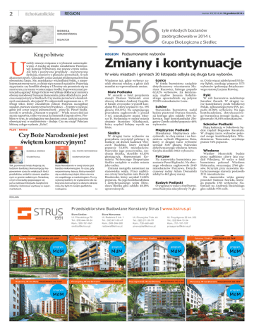 2 region EchoKatolickie MOnIKa grudZiŃska reDAKtor U Kraj po bitwie REGIoN cichły emocje związane z wyborami samorządowymi. A trochę się działo: nieudolność Państwowej Komisji Wyborczej, nie zawsze czysta walka. Ale były i pozytywne przykłady - merytoryczne dyskusje, rozmowy o planach i potrzebach. A tych akurat jest sporo. Chociażby coraz częściej podnoszona kwestia obronności kraju. My, mieszkańcy wschodniej Polski, z niepokojem patrzymy na to, co dzieje się u naszych sąsiadów. Pojawiają się pytania: czy konflikt zbrojny z Ukrainy nie przeniesie się na nasz teren; czy mamy wystarczające środki, by powstrzymać potencjalną agresję? Kinga Ochnio weryfikuje deklaracje ministra obrony narodowej Tomasza Siemoniaka, jakie składał m.in. podczas swojej wizyty w Siedlcach. Czy można już mówić o konkretnych zamiarach, decyzjach? Po odpowiedź zapraszam na s. 17. Drugi tekst, który chciałabym polecić Państwa szczególnej uwadze, porusza ważny temat wytrwałości. - Żyjemy w świecie, gdzie jest coraz więcej jednorazówek - pisze ks. Paweł Siedlanowski w artykule „Diament w popiele”. - Wielu rzeczy dziś już się nie naprawia, tylko wyrzuca na śmietnik i kupuje nowe. Problem w tym, że analogiczny mechanizm coraz częściej zaczyna obowiązywać w małżeństwie - dodaje. Czy ma rację? Polecam lekturę całego wydania „Echa”. PLus – minus Czy Boże Narodzenie jest świętem komercyjnym? IZaBELa MOROZ ks. Piotr witkowicZ stUDentKA KUL KoorDynAtor ŚDM tak, ponieważ święta kojarzą się ludziom bardziej z konsumpcją i kupowaniem coraz to większych ilości produktów, aniżeli z czasem spędzonym w gronie rodzinnym. Świadczą o tym chociażby pojawiające się już w połowie listopada świąteczne reklamy i kolorowe wystawy w supermarketach. Reklama 556 Boże narodzenie w swej istocie jest bardzo niekomercyjne. to czas, gdy wspominamy jezusa, który narodził się w obskurnej stajni, która nie ma nic wspólnego z marketingiem. to my wykorzystaliśmy te wydarzenie do nakręcania konsumpcji w danym okresie roku, by było to święto gadżetów As i zakupów. numer 49(1014) 4 -10 grudnia 2014 r. tyle młodych bocianów zaobrączkowała w 2014 r. grupa ekoLogiczna z siedlec Podsumowanie wyborów Zmiany i kontynuacje W wielu miastach i gminach 30 listopada odbyła się druga tura wyborów. Wiadomo już, gdzie wyborcy zaufali obecnej władzy, a gdzie dali mandat na wprowadzenie zmian. Biała Podlaska W szranki o fotel prezydenta stanęli Dariusz Stefaniuk oraz obecny włodarz Andrzej Czapski. Z batalii zwycięsko wyszedł kandydat PiS, który uzyskał 11 tys. 395 głosów (58,11%). Na ustępującego prezydenta zagłosowało o ponad 3 tys. mieszkańców mniej. Miejsce D. Stefaniuka w radzie miasta obejmie Stanisław Nikołajczuk, który uzyskał kolejny wynik na liście. Siedlce W drugiej turze wyborów na prezydenta zwyciężył pełniący tę funkcję od dwóch kadencji Wojciech Kudelski, który uzyskał poparcie 54,85% mieszkańców. Nazwisko jego przeciwnika, Andrzeja Sitnika, skreśliło 45,15% głosujących. Reprezentant Komitetu Wyborczego Bezpartyjne Siedlce zasiądzie w radzie miasta jako radny. Zmiana nastąpiła natomiast na stanowisku wójta. Przez najbliższe cztery lata będzie nim Henryk Brodowski, który uzyskał 51,82% poparcia. Na jego kontrkandydata i dotychczasowego wójta Mirosława Bieńka głos oddało 48,18% uprawnionych. łosice W fotelu burmistrza zasiądzie dotychczasowy wicestarosta Mariusz Kucewicz, którego poparło 62,02% wyborców. Za kontynuacją rządów Janusza Kobylińskiego opowiedziało się jedynie 37,98% mieszkańców Łosic. łuków Stanowisko burmistrza nadal będzie piastował Dariusz Szustek, na którego głos oddało 54% łukowian. Jego kontrkandydat Zbigniew Zemło zdobył poparcie 46% wyborców. Międzyrzec Podlaski Mieszkańcy Międzyrzeca zdecydowali, że chcą zmian i na burmistrza wybrali Zbigniewa Kota, który w drugiej turze wyborów uzyskał 3287 głosów. Nazwisko dotychczasowego włodarza Artura Grzyba skreśliło 3012 wyborców. Parczew Na stanowisku burmistrza pozostanie Paweł Kędracki. Na obecnego włodarza zagłosowało 2845 mieszkańców Parczewa. Dotychczasowy radny Adam Domański zdobył o 462 głosy mniej. Radzyń Podlaski O wygranej w walce o fotel burmistrza Radzynia zdecydowały 74 gło- sy. O tyle więcej zdobył poseł PiS Jerzy Rębek, uzyskując poparcie 3373 wyborców i pokonując dotychczasowego starostę Lucjana Kotwicę. Ryki W roli burmistrza zadebiutuje Jarosław Żaczek. W drugiej turze kandydaturę posła Solidarnej Polski, zgłoszonego przez PiS, poparło 61,96% wyborców. Na jego kontrkandydata, dotychczasowego burmistrza Jerzego Gąskę, zagłosowało 38,04% mieszkańców. Sokołów Podlaski Piątą kadencję w Sokołowie będzie rządził Bogusław Karakula. W drugiej turze wyborów pokonał swego kontrkandydata Włodzimierza Tomczuka, uzyskując prawie 54% poparcie. Włodawa Wiesław Muszyński będzie przez najbliższe cztery lata rządził Włodawą. W walce o fotel burmistrza pokonał Wiesława Holaczuka, otrzymując 2766 głosów. Krzyżyk przy nazwisku dotychczasowego starosty postawiło 2111 mieszkańców. Na stanowisku wójta gminy pozostał Tadeusz Sawicki, którego poparło 1191 wyborców. Natomiast na Andrzeja Rusińskiego KO głos oddało 978 osób. 23 www.echokatolickie.pl Region tyle lat liczy najmłodszy z radnych miejskich Łukowa - Mateusz Popławski redaktor prowadzący: monika lipińska i przeciw. Pomyślałem sobie: jeśli nie spróbuję, będę miał wyrzuty sumienia. W związku z tym pojawiliśmy się na spotkaniu z radą wierzycieli, złożyliśmy ofertę i została ona przyjęta. Umowę przedwstępną podpisaliśmy 5 listopada - opowiadał S. Zawieska. Nowy właściciel ZPP Auto Cel: rozwój zakładu Przedsiębiorstwo Produkcyjno-Handlowe Bozamet jest nowym właścicielem ZPP - Auto. - Ten przykład pokazuje, że kiedy władza samorządowa