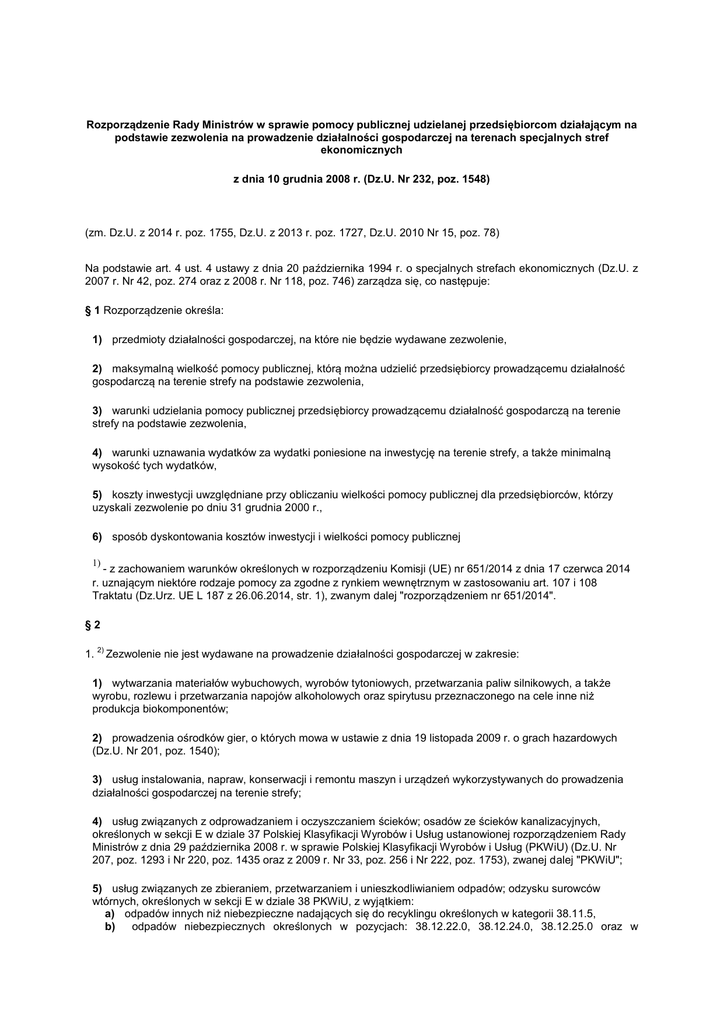 Rozporządzenie Rady Ministrów w sprawie pomocy publicznej udzielanej przedsiębiorcom działającym na podstawie zezwolenia na prowadzenie działalności gospodarczej na terenach specjalnych stref ekonomicznych z dnia 10 grudnia 2008 r. (Dz.U. Nr 232, poz. 1548) (zm. Dz.U. z 2014 r. poz. 1755, Dz.U. z 2013 r. poz. 1727, Dz.U. 2010 Nr 15, poz. 78) Na podstawie art. 4 ust. 4 ustawy z dnia 20 października 1994 r. o specjalnych strefach ekonomicznych (Dz.U. z 2007 r. Nr 42, poz. 274 oraz z 2008 r. Nr 118, poz. 746) zarządza się, co następuje: § 1 Rozporządzenie określa: 1) przedmioty działalności gospodarczej, na które nie będzie wydawane zezwolenie, 2) maksymalną wielkość pomocy publicznej, którą można udzielić przedsiębiorcy prowadzącemu działalność gospodarczą na terenie strefy na podstawie zezwolenia, 3) warunki udzielania pomocy publicznej przedsiębiorcy prowadzącemu działalność gospodarczą na terenie strefy na podstawie zezwolenia, 4) warunki uznawania wydatków za wydatki poniesione na inwestycję na terenie strefy, a także minimalną wysokość tych wydatków, 5) koszty inwestycji uwzględniane przy obliczaniu wielkości pomocy publicznej dla przedsiębiorców, którzy uzyskali zezwolenie po dniu 31 grudnia 2000 r., 6) sposób dyskontowania kosztów inwestycji i wielkości pomocy publicznej 1) - z zachowaniem warunków określonych w rozporządzeniu Komisji (UE) nr 651/2014 z dnia 17 czerwca 2014 r. uznającym niektóre rodzaje pomocy za zgodne z rynkiem wewnętrznym w zastosowaniu art. 107 i 108 Traktatu (Dz.Urz. UE L 187 z 26.06.2014, str. 1), zwanym dalej "rozporządzeniem nr 651/2014". §2 1. 2) Zezwolenie nie jest wydawane na prowadzenie działalności gospodarczej w zakresie: 1) wytwarzania materiałów wybuchowych, wyrobów tytoniowych, przetwarzania paliw silnikowych, a także wyrobu, rozlewu i przetwarzania napojów alkoholowych oraz spirytusu przeznaczonego na cele inne niż produkcja biokomponentów; 2) prowadzenia ośrodków gier, o których mowa w ustawie z dnia 19 listopada 2009 r. o grach hazardowych (Dz.U. Nr 201, poz. 1540); 3) usług instalowania, napraw, konserwacji i remontu maszyn i urządzeń wykorzystywanych do prowadzenia działalności gospodarczej na terenie strefy; 4) usług związanych z odprowadzaniem i oczyszczaniem ścieków; osadów ze ścieków kanalizacyjnych, określonych w sekcji E w dziale 37 Polskiej Klasyfikacji Wyrobów i Usług ustanowionej rozporządzeniem Rady Ministrów z dnia 29 października 2008 r. w sprawie Polskiej Klasyfikacji Wyrobów i Usług (PKWiU) (Dz.U. Nr 207, poz. 1293 i Nr 220, poz. 1435 oraz z 2009 r. Nr 33, poz. 256 i Nr 222, poz. 1753), zwanej dalej "PKWiU"; 5) usług związanych ze zbieraniem, przetwarzaniem i unieszkodliwianiem odpadów; odzysku surowców wtórnych, określonych w sekcji E w dziale 38 PKWiU, z wyjątkiem: a) odpadów innych niż niebezpieczne nadających się do recyklingu określonych w kategorii 38.11.5, b) odpadów niebezpiecznych określonych w pozycjach: 38.12.22.0, 38.12.24.0, 38.12.25.0 oraz w podkategorii 38.12.27, c) odpadów rozpuszczalników organicznych określonych w kategorii 38.21.3, d) usług w zakresie odzysku surowców; surowców wtórnych określonych w grupie 38.3; 6) usług związanych z rekultywacją i pozostałych usług związanych z gospodarką odpadami, określonych w sekcji E w dziale 39 PKWiU; 7) obiektów budowlanych i robót budowlanych, określonych w sekcji F PKWiU; 8) handlu hurtowego i detalicznego, naprawy pojazdów samochodowych, włączając motocykle, oraz usług związanych z zakwaterowaniem i usług gastronomicznych, określonych w sekcjach G i I PKWiU; 9) usług holowania w transporcie drogowym, określonych w sekcji H w podkategorii 52.21.25 PKWiU; 10) usług licencyjnych w zakresie informacji i komunikacji, określonych w sekcji J PKWiU, związanych z: a) nabywaniem praw do książek, broszur, ulotek, map określonych w kategorii 58.11.6, b) nabywaniem praw do korzystania z wykazów i list, w szczególności adresowych, telefonicznych określonych w kategorii 58.12.3, c) nabywaniem praw do czasopism i pozostałych periodyków określonych w kategorii 58.14.4, d) nabywaniem praw do pozostałych wyrobów drukowanych określonych w kategorii 58.19.3, e) nabywaniem praw do korzystania z gier komputerowych określonych w kategorii 58.21.4, f) nabywaniem praw do korzystania z programów komputerowych określonych w kategorii 58.29.5; 11) usług w zakresie informacji i komunikacji, określonych w sekcji J PKWiU, związanych z: a) produkcją filmów, nagrań wideo, programów telewizyjnych, nagrań dźwiękowych i muzycznych, określonych w dziale 59, z wyjątkiem usług związanych z wydawaniem nagrań dźwiękowych i muzycznych określonych w kategorii 59.20.3, b) nadawaniem programów ogólnodostępnych i abonamentowych określonych w dziale 60, c) pozostałych usług w zakresie informacji określonych w grupie 63.9; 12) usług finansowych i ubezpieczeniowych oraz usług związanych z obsługą rynku nieruchomości, określonych w sekcjach K i L PKWiU; 13) usług profesjonalnych, naukowych i technicznych, określonych w sekcji M PKWiU, z wyjątkiem: a) usług w zakresie audytu finansowego określonych w kategorii 69.20.1, b) usług rachunkowo-księgowych określonych w kategorii 69.20.2, c) usług w zakresie badań i analiz technicznych określonych w grupie 71.2, d) usług w zakresie badań naukowych i prac rozwojowych określonych w dziale 72; 14) usług administrowania i usług wspierających, określonych w sekcji N PKWiU, z wyjątkiem usług centrów telefonicznych (call center) określonych w grupie 82.2; 15) usług administracji publicznej i obrony narodowej; usług w zakresie obowiązkowych zabezpieczeń społecznych, oraz edukacji, usług w zakresie opieki zdrowotnej i pomocy społecznej, usług kulturalnych, rozrywkowych, sportowych i rekreacyjnych, określonych w sekcjach O-R PKWiU; 16) pozostałych usług określonych w se
