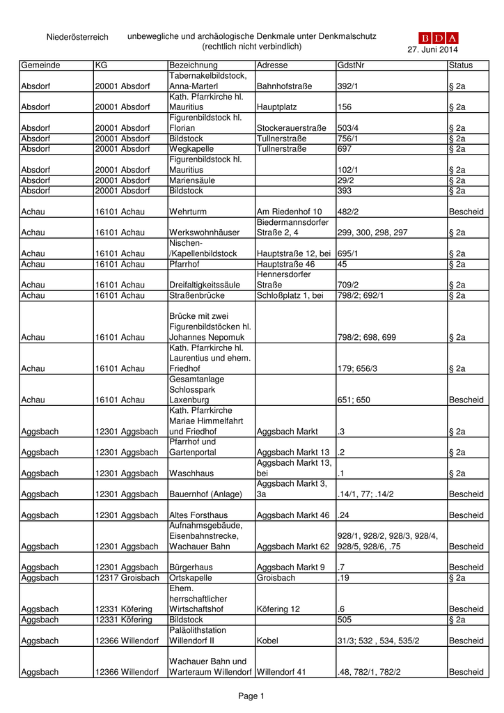 Niederösterreich unbewegliche und archäologische Denkmale unter Denkmalschutz (rechtlich nicht verbindlich) Gemeinde KG Absdorf 20001 Absdorf Absdorf 20001 Absdorf Absdorf Absdorf Absdorf 20001 Absdorf 20001 Absdorf 20001 Absdorf Absdorf Absdorf Absdorf 20001 Absdorf 20001 Absdorf 20001 Absdorf Bezeichnung Tabernakelbildstock, Anna-Marterl Kath. Pfarrkirche hl. Mauritius Figurenbildstock hl. Florian Bildstock Wegkapelle Figurenbildstock hl. Mauritius Mariensäule Bildstock Achau 16101 Achau Wehrturm Achau 16101 Achau Achau Achau 16101 Achau 16101 Achau Werkswohnhäuser Nischen/Kapellenbildstock Pfarrhof Achau Achau 16101 Achau 16101 Achau Dreifaltigkeitssäule Straßenbrücke Achau 16101 Achau Achau 16101 Achau Achau 16101 Achau Aggsbach 12301 Aggsbach Aggsbach 12301 Aggsbach Aggsbach 12301 Aggsbach Aggsbach 12301 Aggsbach Aggsbach 12301 Aggsbach Aggsbach 12301 Aggsbach Aggsbach Aggsbach 12301 Aggsbach 12317 Groisbach Aggsbach Aggsbach 12331 Köfering 12331 Köfering Aggsbach Aggsbach 27. Juni 2014 Adresse GdstNr Status Bahnhofstraße 392/1 § 2a Hauptplatz 156 § 2a Stockerauerstraße Tullnerstraße Tullnerstraße 503/4 756/1 697 § 2a § 2a § 2a 102/1 29/2 393 § 2a § 2a § 2a Am Riedenhof 10 Biedermannsdorfer Straße 2, 4 482/2 Bescheid 299, 300, 298, 297 § 2a Hauptstraße 12, bei Hauptstraße 46 Hennersdorfer Straße Schloßplatz 1, bei 695/1 45 § 2a § 2a 709/2 798/2; 692/1 § 2a § 2a 798/2; 698, 699 § 2a 179; 656/3 § 2a 651; 650 Bescheid .3 § 2a .2 § 2a .1 § 2a .14/1, 77; .14/2 Bescheid Brücke mit zwei Figurenbildstöcken hl. Johannes Nepomuk Kath. Pfarrkirche hl. Laurentius und ehem. Friedhof Gesamtanlage Schlosspark Laxenburg Kath. Pfarrkirche Mariae Himmelfahrt und Friedhof Aggsbach Markt Pfarrhof und Gartenportal Aggsbach Markt 13 Aggsbach Markt 13, Waschhaus bei Aggsbach Markt 3, 3a Bauernhof (Anlage) Altes Forsthaus Aufnahmsgebäude, Eisenbahnstrecke, Wachauer Bahn Aggsbach Markt 46 .24 Bescheid 928/1, 928/2, 928/3, 928/4, Aggsbach Markt 62 928/5, 928/6, .75 Bescheid Aggsbach Markt 9 Groisbach .7 .19 Bescheid § 2a Köfering 12 .6 505 Bescheid § 2a 12366 Willendorf Bürgerhaus Ortskapelle Ehem. herrschaftlicher Wirtschaftshof Bildstock Paläolithstation Willendorf II Kobel 31/3; 532 , 534, 535/2 Bescheid 12366 Willendorf Wachauer Bahn und Warteraum Willendorf Willendorf 41 .48, 782/1, 782/2 Bescheid Page 1 Niederösterreich unbewegliche und archäologische Denkmale unter Denkmalschutz (rechtlich nicht verbindlich) Gemeinde Aggsbach Alberndorf im Pulkautal Alberndorf im Pulkautal Alberndorf im Pulkautal Alberndorf im Pulkautal Alberndorf im Pulkautal Alberndorf im Pulkautal Alberndorf im Pulkautal Albrechtsberg an der Gr. Krems KG 12366 Willendorf 18001 Alberndorf im Pulkautal 18001 Alberndorf im Pulkautal 18001 Alberndorf im Pulkautal 18001 Alberndorf im Pulkautal 18001 Alberndorf im Pulkautal 18001 Alberndorf im Pulkautal 18001 Alberndorf im Pulkautal 12141 Albrechtsberg Albrechtsberg an der Gr. Krems Albrechtsberg an der Gr. Krems Albrechtsberg an der Gr. Krems Albrechtsberg an der Gr. Krems 12141 Albrechtsberg 12141 Albrechtsberg Albrechtsberg an der Gr. Krems Albrechtsberg an der Gr. Krems Alland GdstNr .43 Status § 2a Alberndorf im Pulkautal 22, bei 3575/3 § 2a Pfarrhof Kath. Pfarrkirche hl. Laurentius Pietà (Maria Dreieichen) Neustift 148 166 § 2a Schulgasse 129a 165 § 2a 4317 § 2a Tabernakelpfeiler 3629/30, 4176 § 2a Tabernakelpfeiler 4363 § 2a 4406 § 2a .1/2 § 2a Friedhofsportal Kath. Pfarrkirche Mariae Himmelfahrt Alland 04001 Alland Alland 04001 Alland Alland 04001 Alland Alland 04019 Mayerling Alland 04019 Mayerling 04026 Raisenmarkt 04026 Raisenmarkt 04039 Windhaag Albrechtsberg an der Großen Krems Albrechtsberg an der Großen Krems 1 .1/1 Bescheid 1658/9 § 2a .31 § 2a .33 Bescheid 553/2 Bescheid .14 61/2 § 2a § 2a 542/1 567 524/1 § 2a § 2a § 2a 563 § 2a Sogen. Jägerkapelle Kath. Pfarrkirche hll. Georg und Margarethe und ehem. Friedhof Kloster d. Unbeschuhten Karmeliterinnen,ehem . Jagdschloss d. Kronprinzen Rudolf Mayerling 3 Franziskanerinnenklos ter, ehem. Wirtschaftshof des Jagdschlosses Mayerling 5 489/1 § 2a 1 § 2a 2 § 2a 79 § 2a Burgruine Arnstein Kath. Pfarrkirche hll. Philipp und Jakobus Ortskapelle 253/1 § 2a 514 131 § 2a § 2a 12181 Purkersdorf Ortskapelle 04001 Alland Haidenkapelle 04001 Alland 04001 Alland 04001 Alland Alland Alland Adresse Burg Albrechtsberg an der Großen Krems Figurenbildstock hl. Florian Kath. Pfarrkirche hl. 12177 Els Pankratius Schüttkasten 12177 Els (herrschaftlich) Hochofenstumpf der 12180 Marbach an ehem. Hütte der Kleinen Krems Rudolfsthal Alland Alland Alland Alland Bezeichnung Ortskapelle Figurenbildstock hl. Johannes Nepomuk 27. Juni 2014 Hegenauerkreuz Bildstock Baderkapelle Johannes NepomukKapelle Els Marbach an der Kleinen Krems 30a Purkersdorf Hauptplatz Heiligenkreuzerstraß e Wagenhofstraße Groisbach Page 2 Niederösterreich unbewegliche und archäologische Denkmale unter Denkmalschutz (rechtlich nicht verbindlich) 27. Juni 2014 Gemeinde KG Bezeichnung Adresse GdstNr Status Allentsteig 24002 Allentsteig Am Stadtberg 6, bei 3992/20 § 2a Allentsteig 24002 Allentsteig 24002 Allentsteig Am Stadtberg 6, bei 3992/20 4004/4, 4004/5, 4004/6, Haidhof 2,3,4,5,6,7 4004/7, 4004/8, 4004/9 § 2a Allentsteig § 2a Allentsteig 24002 Allentsteig Hamerlingstraße .4 Bescheid Allentsteig 24002 Allentsteig Kornmetzen Figurenbildstock hl. Florian Forsthäuser beim Haidhof Schüttkasten, Aussiedlermuseum Heeresforstverwaltung Allentsteig Hamerlingstraße 5 .219 § 2a Allentsteig 24002 Allentsteig Wohnhaus Hauptstraße 13 .33 Bescheid Allentsteig 24002 Allentsteig Hauptstraße 15 .34 Bescheid Allentsteig Allentsteig 24002 Allentsteig 24002 Allentsteig Wohnhaus Wohnhaus, ehem. Hagerscher Freihof Wohnhaus .63 .58 Bescheid § 2a Allentsteig 24002 Allentsteig Schloss Allentsteig .1 § 2a Allentsteig 24002 Allentsteig .75 § 2a Allentsteig 24002 Allentsteig .74 § 2a Allentsteig 24002 Allentsteig Pfa
