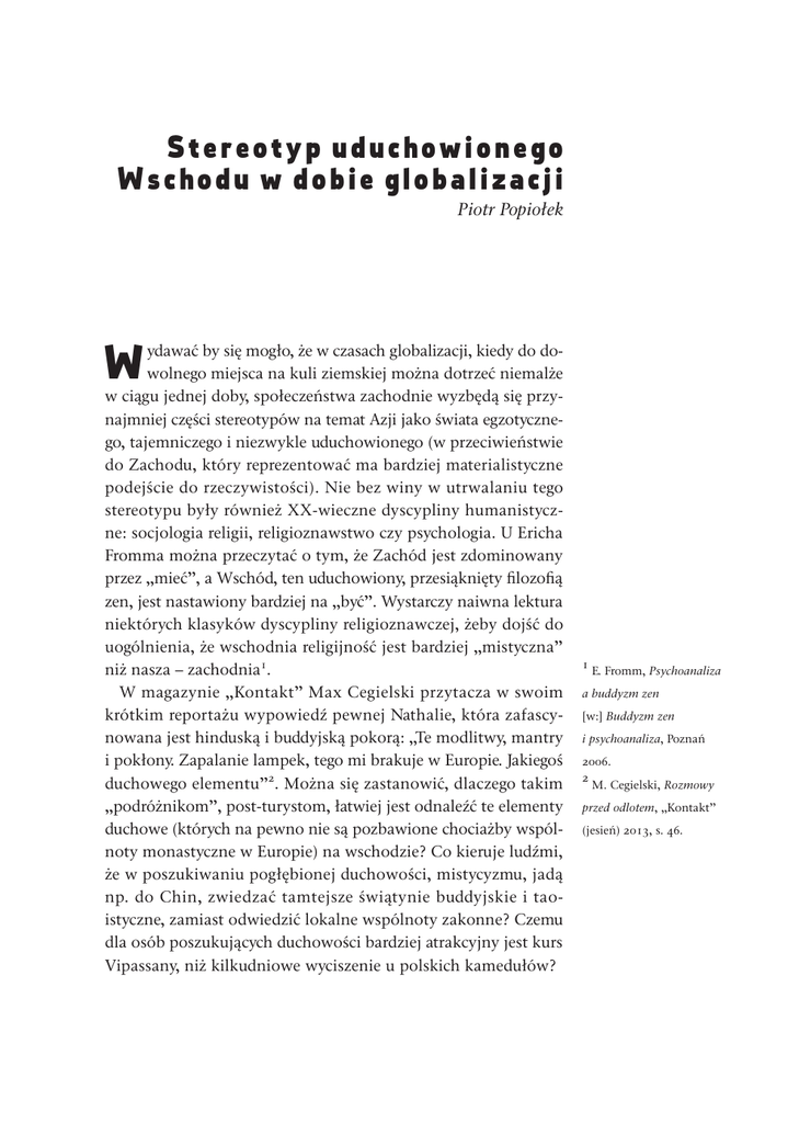 Stereotyp uduchowionego Wschodu w dobie globalizacji Piotr Popiołek W ydawać by się mogło, że w czasach globalizacji, kiedy do dowolnego miejsca na kuli ziemskiej można dotrzeć niemalże w ciągu jednej doby, społeczeństwa zachodnie wyzbędą się przynajmniej części stereotypów na temat Azji jako świata egzotycznego, tajemniczego i niezwykle uduchowionego (w przeciwieństwie do Zachodu, który reprezentować ma bardziej materialistyczne podejście do rzeczywistości). Nie bez winy w utrwalaniu tego stereotypu były również XX-wieczne dyscypliny humanistyczne: socjologia religii, religioznawstwo czy psychologia. U Ericha Fromma można przeczytać o tym, że Zachód jest zdominowany przez „mieć”, a Wschód, ten uduchowiony, przesiąknięty filozofią zen, jest nastawiony bardziej na „być”. Wystarczy naiwna lektura niektórych klasyków dyscypliny religioznawczej, żeby dojść do uogólnienia, że wschodnia religijność jest bardziej „mistyczna” niż nasza – zachodnia1. W magazynie „Kontakt” Max Cegielski przytacza w swoim krótkim reportażu wypowiedź pewnej Nathalie, która zafascynowana jest hinduską i buddyjską pokorą: „Te modlitwy, mantry i pokłony. Zapalanie lampek, tego mi brakuje w Europie. Jakiegoś duchowego elementu”2. Można się zastanowić, dlaczego takim „podróżnikom”, post-turystom, łatwiej jest odnaleźć te elementy duchowe (których na pewno nie są pozbawione chociażby wspólnoty monastyczne w Europie) na wschodzie? Co kieruje ludźmi, że w poszukiwaniu pogłębionej duchowości, mistycyzmu, jadą np. do Chin, zwiedzać tamtejsze świątynie buddyjskie i taoistyczne, zamiast odwiedzić lokalne wspólnoty zakonne? Czemu dla osób poszukujących duchowości bardziej atrakcyjny jest kurs Vipassany, niż kilkudniowe wyciszenie u polskich kamedułów? 1 E. Fromm, Psychoanaliza a buddyzm zen [w:] Buddyzm zen i psychoanaliza, Poznań 2006. 2 M. Cegielski, Rozmowy przed odlotem, „Kontakt” (jesień) 2013, s. 46. 324 3 4 Tamże, s. 48. Religious Tourism in Asia and the Pacific, United Nations World Tourism Organization, Madrid 2011. Christianitas 56-57/2014 SZKICE Zawężając temat do kwestii, w których jestem w stanie posłużyć się przebadanymi już materiałami, jak i własnymi doświadczeniami, odniosę się głównie do Chin, szczególnie miasta Xi’an, dawnej stolicy Państwa Środka. To na terenie Chin zrodził się konfucjanizm i taoizm, i to przez Chiny buddyzm przedostał się z Indii na tereny Korei i Japonii, wykształcając całą, specyficzną tradycję chan (później japoński zen, czy koreański seon). Dla wielu, w tym Marcela Graneta, jednego z ważniejszych sinologów i historyków, który przybliżył zachodowi świat Państwa Środka, Chiny to „inny świat”. Rząd Chin w ostatnich latach docenił zalety turystyki religijnej i związane z nią przychody wpływające do kasy państwa. Ze względu na to zainteresowanie pojawiły się również pieniądze na inwestycje, jak odbudowywanie zniszczonych obiektów. Popularne są także wycieczki do Tybetu – chociaż wśród niektórych turystów pojawiają się rozterki moralne, czy należy uczestniczyć w tak zorganizowanych wycieczkach, gdyż w ten sposób wspiera się finansowo rząd okupacyjny 3 (Podobne rozterki mogą się pojawiać np., przy zorganizowanych państwowych wycieczkach, np. do Korei Północnej). Większe zainteresowanie rządu przedkłada się również na proces retradycjonalizacji. Przez lata prowadzenia ostrej polityki maoistowskiej, niemalże izolacyjnej polityki zagranicznej (która jednakże od zawsze była charakterystyczna dla państw Wschodu), oraz przez rewolucję kulturalną, która w dużej mierze przyczyniła się do zniszczenia wielu skarbów dziedzictwa religijnego Chin, próbuje się teraz odrestaurować to, co zostało utracone, odtwarzając często przy tym, niemalże zupełnie od nowa, budowle, zwyczaje i rytuały. Tenże związek pomiędzy nową polityką państwa wobec miejsc kultu, turystyką religijną i ekonomią jest szczegółowo opisany w książce Religious Tourism in Asia and the Pacific4. Chiny są w tym momencie na czwartym miejscu na świecie, jeśli chodzi o rynek turystyczny, a w 2008 roku odnotowano przybycie 53,05 mln turystów. Chiny posiadają największą liczbę obiektów na liście UNESCO, z czego jedna trzecia to obiekty religijne. Znaczną część rynku zajmuje buddyjska turystyka religijne, jednakże jak zauważa raport UNWTO, są również wycieczki dedykowane dla muzułmanów (są im proponowane np. specjalne pomieszczenia do modlitwy 325 Piotr Popiołek Stereotyp uduchowionego Wschodu… z zaznaczonym kierunkiem w stronę Mekki, jak i wyżywienie halal). Utowarowienie tradycji poza pewnymi negatywnymi skutkami ma również pozytywny wpływ na przetrwanie pewnych lokalności – i tak John i Jean Comaroff (2011: 28) pokazują, że np. lud Li na wyspie Hajnan, czy pewne ludy z Junnanu przetrwały właśnie dzięki takiej komercjalizacji5. Można by wymienić wiele czynników, które mają wpływ na zjawisko turystyki religijnej. Z perspektywy przemian społeczno-kulturowych niewątpliwie ma to związek z prywatyzacją religii. Thomas Luckmann w „Niewidzialnej religii”6 opisuje ten proces prywatyzacji, związany z sekularyzacją i zanikiem widzialnych społecznych form religijnych. Prywatyzacja religii charakteryzuje się konsumpcjonizmem i pluralizmem. „Zachowanie indywidualne w sferze prywatnej określane jest w coraz większym stopniu poprzez subiektywne preferencje, które pozwalają wybrać z oferty, to co «pasuje»”7. Religie bez religii stają się coraz popularniejsze, poszukiwane są alternatywy dla dotychczasowych instytucji religijnych, postrzeganych jako „skostniałe”. Podróżnicy mogą więc próbować odnaleźć pewne „bardziej pasujące”, przemawiające do nich treści religijne. Nieskrępowani przez zewnętrzny rygor mogą pozwolić sobie na ich dowol
