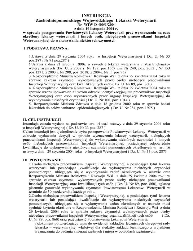 INSTRUKCJA Zachodniopomorskiego Wojewódzkiego Lekarza Weterynarii Nr WIW D 400/1/2004 z dnia 19 listopada 2004 r. w sprawie postępowania Powiatowych Lekarzy Weterynarii przy wyznaczaniu na czas określony lekarzy weterynarii i innych osób, niebędących pracownikami Inspekcji Weterynaryjnej do wykonywania niektórych czynności. I PODSTAWA PRAWNA: 1.Ustawa z dnia 29 stycznia 2004 roku o Inspekcji Weterynaryjnej ( Dz. U. Nr 33 poz.287 i Nr 91 poz.287 ) 2.Ustawa z dnia 21 grudnia 1990r. o zawodzie lekarza weterynarii i izbach lekarskoweterynaryjnych (Dz. U. z 2002 r. Nr 187, poz.1567 zm. Nr 240, poz. 2052 , Nr 153 poz.1271; z 2003 r. Nr 208, poz. 2018; z 2004r. Nr 11 poz.95) 3. Rozporządzenie Ministra Rolnictwa i Rozwoju Wsi z dnia 29 kwietnia 2004 roku w sprawie zakresu czynności wykonywanych przez osoby niebędące pracownikami Inspekcji Weterynaryjnej oraz kwalifikacji tych osób ( Dz. U. Nr 89, poz. 860) 4. Rozporządzenie Ministra Rolnictwa i Rozwoju Wsi z dnia 29 kwietnia 2004 roku w sprawie wzoru upoważnienia i wzoru odznaki identyfikacyjnej dla pracowników Inspekcji Weterynaryjnej oraz osób wyznaczonych przez organy Inspekcji Weterynaryjnej do wykonywania niektórych czynności ( Dz. U. Nr 100, poz. 1014 ) 5. Rozporządzenie Ministra Zdrowia z dnia 18 grudnia 2002 roku w sprawie badań lekarskich do celów sanitarno- epidemiologicznych ( Dz. U. Nr 234, poz. 1975 ) II. CEL INSTRUKCJI Instrukcja została wydana na podstawie art. 14 ust.1 ustawy z dnia 29 stycznia 2004 roku o Inspekcji Weterynaryjnej ( Dz. U. Nr 33 poz. 287 ) Celem instrukcji jest ujednolicenie trybu postępowania Powiatowych Lekarzy Weterynarii w zakresie wydawania decyzji w sprawie wyznaczenia lekarzy weterynarii, niebędących pracownikami Inspekcji Weterynaryjnej do wykonywania niektórych czynności i innych osób niebędących pracownikami Inspekcji Weterynaryjnej, posiadającej odpowiednie kwalifikacje do wykonywania niektórych czynności pomocniczych określonych w art. 16 ustawy z dnia 29 stycznia 2004 roku o Inspekcji Weterynaryjnej ( Dz. U. Nr 33 poz. 287) III. POSTĘPOWANIE : 1.Osoba niebędąca pracownikiem Inspekcji Weterynaryjnej, a posiadająca tytuł lekarza weterynarii lub posiadająca kwalifikacje do wykonywania niektórych czynności pomocniczych, ubiegająca się o wykonywanie zadań określonych w ustawie oraz Rozporządzeniu Ministra Rolnictwa i Rozwoju Wsi z dnia 29 kwietnia 2004 roku w sprawie zakresu czynności wykonywanych przez osoby niebędące pracownikami Inspekcji Weterynaryjnej oraz kwalifikacji tych osób ( Dz. U. Nr 89, poz. 860), zgłasza pisemnie gotowość wykonywania czynności Powiatowemu Lekarzowi Weterynarii w terminie do 30 października każdego roku. 2.Osoba niebędąca pracownikiem Inspekcji Weterynaryjnej, a posiadająca tytuł lekarza weterynarii lub posiadająca kwalifikacje do wykonywania niektórych czynności pomocniczych, ubiegająca się o wykonywanie zadań określonych w ustawie musi spełniać kryteria określone w Rozporządzeniu Ministra Rolnictwa i Rozwoju Wsi z dnia 29 kwietnia 2004 roku w sprawie zakresu czynności wykonywanych przez osoby niebędące pracownikami Inspekcji Weterynaryjnej oraz kwalifikacji tych osób ( Dz. U. Nr 89, poz. 860) oraz przedstawić Powiatowemu Lekarzowi Weterynarii: a)dokument potwierdzający wpis do ewidencji zakładów leczniczych okręgowej rady lekarsko – weterynaryjnej właściwej dla siedziby zakładu leczniczego z wyjątkiem wyznaczania do badania zwierząt rzeźnych i mięsa w obwodach rzeźnianych, b)w przypadku ubiegania się o wykonywanie czynności z zakresu badania zwierząt rzeźnych i ich mięsa przedkłada każdorazowo aktualne stosowne badanie lekarskie, w tym okulistyczne, poświadczające zdolność do wykonywania ww. prac, c)w przypadku zgłoszenia po raz pierwszy gotowości wykonywania niektórych czynności, osoba niebędąca pracownikiem Inspekcji Weterynaryjnej, przedkłada dodatkowo Powiatowemu Lekarzowi Weterynarii, dokument potwierdzający prawo wykonywania zawodu zgodnie z art. 2 ustawy z dnia 21 grudnia 1990r. o zawodzie lekarza weterynarii i izbach lekarsko-weterynaryjnych (Dz. U. z 2002 r. Nr 187, poz.1567 zm. Nr 240, poz. 2052 , Nr 153 poz.1271; z 2003 r. Nr 208, poz. 2018; z 2004r. Nr 11 poz.95), d) numer rachunku bankowego. 3.Przy wyznaczaniu przez Powiatowego Lekarza Weterynarii lekarzy weterynarii lub osoby personelu pomocniczego, niebędących pracownikami Inspekcji Weterynaryjnej do badania zwierząt rzeźnych i mięsa należy uwzględnić kryteria zawarte w Instrukcji Głównego Lekarza Weterynarii Nr GIW hig.500/3/2004 w sprawie wyznaczania lekarzy weterynarii do badania zwierząt rzeźnych i mięsa oraz szczegółowych zasad tego badania. 4.Powiatowy Lekarz Weterynarii po otrzymaniu zgłoszenia, rejestruje zgłaszającego na liście osób ubiegających się o wyznaczenie. 5.W terminie 14 dni od daty otrzymania zgłoszenia, Powiatowy Lekarz Weterynarii powiadamia osobę zainteresowaną o sposobie załatwienia sprawy 6.Wyznacza w drodze decyzji administracyjnej zainteresowaną osobę określając termin, zakres i miejsce wykonywania określonych czynności, i skutecznie doręcza ją do dnia 15 grudnia danego roku ( wzór decyzji – załącznik nr 1).Decyzja staje się prawomocną po podpisaniu umowy pomiędzy stronami. 7.Powiatowy Lekarz Weterynarii zawiera z osobą wyznaczoną umowę cywilno – prawną, w której określa zakres i miejsce wykonywania tych czynności, wysokość wynagrodzenia za ich wykonanie oraz termin płatności. Umowa ta musi zawierać zapis, że po jej wygaśnięciu odznaka identyfikacyjna i pieczęć „ lekarza urzędowego” zostaje bezzwłocznie zwrócona Powiatowemu Lekarzowi Weterynarii. 8.Umowa jest zawierana na okres od 01 stycznia do 31 grudnia danego roku, a wykonywanie czynności w niej określonych nie stanowi zatrudnienia na podstawie stosunku pracy. 9.W uzasadnionych przypadkach Powiatowy Lekarz Weterynarii może również w każdym innym cz