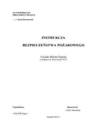 ZATWIERDZAM: PREZYDENT MIASTA / - / Jacek Karnowski INSTRUKCJA BEZPIECZEŃSTWA POŻAROWEGO Urzędu Miasta Sopotu w Sopocie ul. Kościuszki 25/27 Uzgodniono: Opracował: Józef Słomiński / KM PSP Sopot / listopad 2012 r. INST RUK CJA BE ZP IE CZEŃ STW A P OŻA RO WE GO WYKAZ TELEFONÓW ALARMOWYCH Państwowa Straż Pożarna tel. 998 Pogotowie Ratunkowe tel. 999 Policja tel. 997 Pogotowie Energetyczne tel. 991 Pogotowie Gazowe tel. 992 Pogotowie Wodno-Kanalizacyjne tel. 994 Straż Miejska tel. 986 Pogotowie Ratunkowe, Policja, Państwowa Straż Pożarna, tel. 112 ........................................................................................... ........................................................................................... ........................................................................................... ........................................................................................... ........................................................................................... ........................................................................................... ........................................................................................... ........................................................................................... ........................................................................................... INNE 1 ZINTEGROWANY SYSTEM RATOWNICZY MIASTA SOPOT STRAŻ POŻARNA TEL. 998 lub 58 555-81-70, 58 555 – 81- 81 POGOTOWIE RATUNKOWE TEL. 999 lub 58 555 – 24-55, 58 551-11-56 POLICJA TEL. 997 lub 58 521-62-22, 58 521-62-88 STRAŻ MIEJSKA TEL. 986 lub 58 521-38-50, POGOTOWIE ENERGETYCZNE TEL. 991 lub 58 620-45-50, 58 620-31-51 POGOTOWIE WODNO-KANALIZACYJNE TEL. 994 lub 58 301-20-67,58 551-40-55 / dni powszednie 7.00 – 15.00 58 551-35-07 / POGOTOWIE GAZOWE TEL. 992 lub 58 551-10-68, POGOTOWIE CIEPŁOWNICZE TEL. 993 lub 58 627-38-01, REJON OŚWIETLENIA ULIC TEL. 58 521-32-71 CENTRUM KOORDYNACJI RATOWNICTWA WODNEGO WOPR 1 TEL. 601 -100-100 - do uzupełnienia (np. wpisać numery telefonów do osób, które należy powiadomić na wypadek powstania zagrożenia) 2 INST RUK CJA BE ZP IE CZEŃ STW A P OŻA RO WE GO Spis treści 1. Cel i zakres opracowania ..................................................................................................... 6 2. Podstawa opracowania......................................................................................................... 7 2.1. Podstawy merytoryczne ................................................................................................ 7 3. Postanowienia ogólne .......................................................................................................... 8 3.1. Zakres obowiązywania instrukcji bezpieczeństwa pożarowego ................................... 8 3.2. Aktualizacja instrukcji bezpieczeństwa pożarowego .................................................... 8 4. Charakterystyka ogólna obiektu .......................................................................................... 9 4.1. Nazwa i adres obiektu ................................................................................................... 9 4.2. Właściciel obiektu ......................................................................................................... 9 4.3. Zarządca obiektu ........................................................................................................... 9 4.4. Użytkownik obiektu ...................................................................................................... 9 4.5. Usytuowanie obiektu..................................................................................................... 9 4.6. Opis ogólny obiektu ...................................................................................................... 9 4.7. Funkcja i przeznaczenie obiektu ................................................................................. 10 4.8. Instalacje i urządzenia techniczne w budynku ............................................................ 10 4.9. Lokalizacja głównego wyłącznika prądu .................................................................... 11 4.10. Lokalizacja kurka głównego instalacji gazowej ................................................... 11 5. Warunki ochrony przeciwpożarowej wynikające z przeznaczenia i sposobu użytkowania obiektu oraz warunków technicznych .......................................................... 11 5.1. Grupa wysokości ......................................................................................................... 11 5.2. Liczba kondygnacji- budynek posiada:....................................................................... 11 5.3. Parametry pożarowe występujących substancji palnych Materiały niebezpieczne pożarowo ............................................................................................. 11 5.4. Kategoria zagrożenia ludzi ......................................................................................... 12 5.5. Liczba osób w obiekcie ............................................................................................... 12 5.6. Klasa odporności pożarowej budynku ........................................................................ 12 5.7. Klasa odporności ogniowej elementów budowlanych ............................................... 12 5.8. Stopień rozprzestrzeniania ognia elementów budowlanych ...................................... 12 5.9. Warunki ewakuacji ..................................................................................................... 13 5.10. Podstawowe zabezpieczenie przeciwpożarowe instalacji technicznych .............. 13 5.11. Urządzenia przeciwpożarowe w obiekcie ............................................................ 13 3 INST RUK CJA BE ZP IE CZEŃ STW A P OŻA RO WE GO 5.12. Wyposażenie w gaśnice .................................