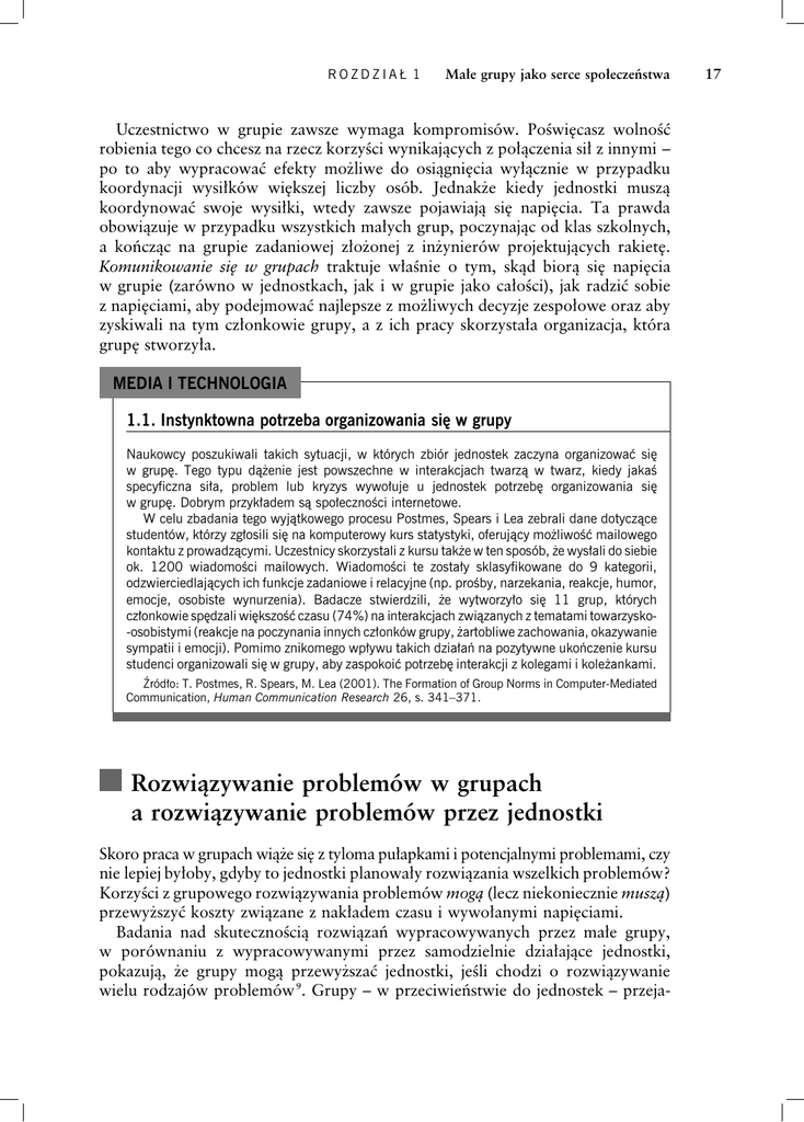 ROZDZIAŁ 1 Małe grupy jako serce społeczeństwa Uczestnictwo w grupie zawsze wymaga kompromisów. Poświęcasz wolność robienia tego co chcesz na rzecz korzyści wynikających z połączenia sił z innymi – po to aby wypracować efekty możliwe do osiągnięcia wyłącznie w przypadku koordynacji wysiłków większej liczby osób. Jednakże kiedy jednostki muszą koordynować swoje wysiłki, wtedy zawsze pojawiają się napięcia. Ta prawda obowiązuje w przypadku wszystkich małych grup, poczynając od klas szkolnych, a kończąc na grupie zadaniowej złożonej z inżynierów projektujących rakietę. Komunikowanie się w grupach traktuje właśnie o tym, skąd biorą się napięcia w grupie (zarówno w jednostkach, jak i w grupie jako całości), jak radzić sobie z napięciami, aby podejmować najlepsze z możliwych decyzje zespołowe oraz aby zyskiwali na tym członkowie grupy, a z ich pracy skorzystała organizacja, która grupę stworzyła. MEDIA I TECHNOLOGIA 1.1. Instynktowna potrzeba organizowania się w grupy Naukowcy poszukiwali takich sytuacji, w których zbiór jednostek zaczyna organizować się w grupę. Tego typu dążenie jest powszechne w interakcjach twarzą w twarz, kiedy jakaś specyficzna siła, problem lub kryzys wywołuje u jednostek potrzebę organizowania się w grupę. Dobrym przykładem są społeczności internetowe. W celu zbadania tego wyjątkowego procesu Postmes, Spears i Lea zebrali dane dotyczące studentów, którzy zgłosili się na komputerowy kurs statystyki, oferujący możliwość mailowego kontaktu z prowadzącymi. Uczestnicy skorzystali z kursu także w ten sposób, że wysłali do siebie ok. 1200 wiadomości mailowych. Wiadomości te zostały sklasyfikowane do 9 kategorii, odzwierciedlających ich funkcje zadaniowe i relacyjne (np. prośby, narzekania, reakcje, humor, emocje, osobiste wynurzenia). Badacze stwierdzili, że wytworzyło się 11 grup, których członkowie spędzali większość czasu (74%) na interakcjach związanych z tematami towarzysko-osobistymi (reakcje na poczynania innych członków grupy, żartobliwe zachowania, okazywanie sympatii i emocji). Pomimo znikomego wpływu takich działań na pozytywne ukończenie kursu studenci organizowali się w grupy, aby zaspokoić potrzebę interakcji z kolegami i koleżankami. Źródło: T. Postmes, R. Spears, M. Lea (2001). The Formation of Group Norms in Computer-Mediated Communication, Human Communication Research 26, s. 341–371. Rozwiązywanie problemów w grupach a rozwiązywanie problemów przez jednostki Skoro praca w grupach wiąże się z tyloma pułapkami i potencjalnymi problemami, czy nie lepiej byłoby, gdyby to jednostki planowały rozwiązania wszelkich problemów? Korzyści z grupowego rozwiązywania problemów mogą (lecz niekoniecznie muszą) przewyższyć koszty związane z nakładem czasu i wywołanymi napięciami. Badania nad skutecznością rozwiązań wypracowywanych przez małe grupy, w porównaniu z wypracowywanymi przez samodzielnie działające jednostki, pokazują, że grupy mogą przewyższać jednostki, jeśli chodzi o rozwiązywanie wielu rodzajów problemów 9. Grupy – w przeciwieństwie do jednostek – przeja- 17