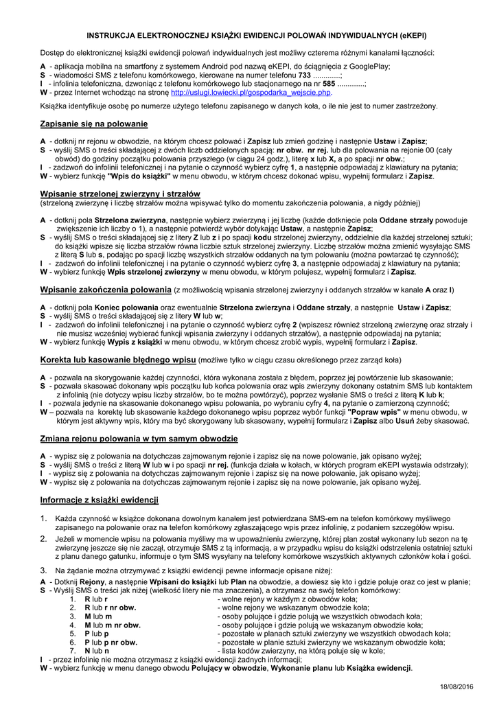 INSTRUKCJA ELEKTRONOCZNEJ KSIĄŻKI EWIDENCJI POLOWAŃ INDYWIDUALNYCH (eKEPI) Dostęp do elektronicznej książki ewidencji polowań indywidualnych jest możliwy czterema różnymi kanałami łączności: A - aplikacja mobilna na smartfony z systemem Android pod nazwą eKEPI, do ściągnięcia z GooglePlay; S - wiadomości SMS z telefonu komórkowego, kierowane na numer telefonu 733 .............; I - infolinia telefoniczna, dzwoniąc z telefonu komórkowego lub stacjonarnego na nr 585 .............; W - przez Internet wchodząc na stronę http://uslugi.lowiecki.pl/gospodarka_wejscie.php. Książka identyfikuje osobę po numerze użytego telefonu zapisanego w danych koła, o ile nie jest to numer zastrzeżony. Zapisanie się na polowanie A - dotknij nr rejonu w obwodzie, na którym chcesz polować i Zapisz lub zmień godzinę i następnie Ustaw i Zapisz; S - wyślij SMS o treści składającej z dwóch liczb oddzielonych spacją: nr obw. nr rej. lub dla polowania na rejonie 00 (cały obwód) do godziny początku polowania przyszłego (w ciągu 24 godz.), literę x lub X, a po spacji nr obw.; I - zadzwoń do infolinii telefonicznej i na pytanie o czynność wybierz cyfrę 1, a następnie odpowiadaj z klawiatury na pytania; W - wybierz funkcję "Wpis do książki" w menu obwodu, w którym chcesz dokonać wpisu, wypełnij formularz i Zapisz. Wpisanie strzelonej zwierzyny i strzałów (strzeloną zwierzynę i liczbę strzałów można wpisywać tylko do momentu zakończenia polowania, a nigdy później) A - dotknij pola Strzelona zwierzyna, następnie wybierz zwierzyną i jej liczbę (każde dotknięcie pola Oddane strzały powoduje zwiększenie ich liczby o 1), a następnie potwierdź wybór dotykając Ustaw, a następnie Zapisz; S - wyślij SMS o treści składającej się z litery Z lub z i po spacji kodu strzelonej zwierzyny, oddzielnie dla każdej strzelonej sztuki; do książki wpisze się liczba strzałów równa liczbie sztuk strzelonej zwierzyny. Liczbę strzałów można zmienić wysyłając SMS z literą S lub s, podając po spacji liczbę wszystkich strzałów oddanych na tym polowaniu (można powtarzać tę czynność); I - zadzwoń do infolinii telefonicznej i na pytanie o czynność wybierz cyfrę 3, a następnie odpowiadaj z klawiatury na pytania; W - wybierz funkcję Wpis strzelonej zwierzyny w menu obwodu, w którym polujesz, wypełnij formularz i Zapisz. Wpisanie zakończenia polowania (z możliwością wpisania strzelonej zwierzyny i oddanych strzałów w kanale A oraz I) A - dotknij pola Koniec polowania oraz ewentualnie Strzelona zwierzyna i Oddane strzały, a następnie Ustaw i Zapisz; S - wyślij SMS o treści składającej się z litery W lub w; I - zadzwoń do infolinii telefonicznej i na pytanie o czynność wybierz cyfrę 2 (wpiszesz również strzeloną zwierzynę oraz strzały i nie musisz wcześniej wybierać funkcji wpisania zwierzyny i oddanych strzałów), a następnie odpowiadaj na pytania; W - wybierz funkcję Wypis z książki w menu obwodu, w którym chcesz zrobić wypis, wypełnij formularz i Zapisz. Korekta lub kasowanie błędnego wpisu (możliwe tylko w ciągu czasu określonego przez zarząd koła) A - pozwala na skorygowanie każdej czynności, która wykonana została z błędem, poprzez jej powtórzenie lub skasowanie; S - pozwala skasować dokonany wpis początku lub końca polowania oraz wpis zwierzyny dokonany ostatnim SMS lub kontaktem z infolinią (nie dotyczy wpisu liczby strzałów, bo te można powtórzyć), poprzez wysłanie SMS o treści z literą K lub k; I - pozwala jedynie na skasowanie dokonanego wpisu polowania, po wybraniu cyfry 4, na pytanie o zamierzoną czynność; W – pozwala na korektę lub skasowanie każdego dokonanego wpisu poprzez wybór funkcji "Popraw wpis" w menu obwodu, w którym jest aktywny wpis, który ma być skorygowany lub skasowany, wypełnij formularz i Zapisz albo Usuń żeby skasować. Zmiana rejonu polowania w tym samym obwodzie A - wypisz się z polowania na dotychczas zajmowanym rejonie i zapisz się na nowe polowanie, jak opisano wyżej; S - wyślij SMS o treści z literą W lub w i po spacji nr rej. (funkcja działa w kołach, w których program eKEPI wystawia odstrzały); I - wypisz się z polowania na dotychczas zajmowanym rejonie i zapisz się na nowe polowanie, jak opisano wyżej; W - wypisz się z polowania na dotychczas zajmowanym rejonie i zapisz się na nowe polowanie, jak opisano wyżej. Informacje z książki ewidencji 1. Każda czynność w książce dokonana dowolnym kanałem jest potwierdzana SMS-em na telefon komórkowy myśliwego zapisanego na polowanie oraz na telefon komórkowy zgłaszającego wpis przez infolinię, z podaniem szczegółów wpisu. 2. Jeżeli w momencie wpisu na polowania myśliwy ma w upoważnieniu zwierzynę, której plan został wykonany lub sezon na tę zwierzynę jeszcze się nie zaczął, otrzymuje SMS z tą informacją, a w przypadku wpisu do książki odstrzelenia ostatniej sztuki z planu danego gatunku, informuje o tym SMS wysyłany na telefony komórkowe wszystkich aktywnych członków koła i gości. 3. Na żądanie można otrzymywać z książki ewidencji pewne informacje opisane niżej: A - Dotknij Rejony, a następnie Wpisani do książki lub Plan na obwodzie, a dowiesz się kto i gdzie poluje oraz co jest w planie; S - Wyślij SMS o treści jak niżej (wielkość litery nie ma znaczenia), a otrzymasz na swój telefon komórkowy: 1. R lub r - wolne rejony w każdym z obwodów koła; 2. R lub r nr obw. - wolne rejony we wskazanym obwodzie koła; 3. M lub m - osoby polujące i gdzie polują we wszystkich obwodach koła; 4. M lub m nr obw. - osoby polujące i gdzie polują we wskazanym obwodzie koła; 5. P lub p - pozostałe w planach sztuki zwierzyny we wszystkich obwodach koła; 6. P lub p nr obw. - pozostałe w planie sztuki zwierzyny we wskazanym obwodzie koła; 7. N lub n - lista kodów zwierzyny, na którą poluje się w kole; I - przez infolinię nie 