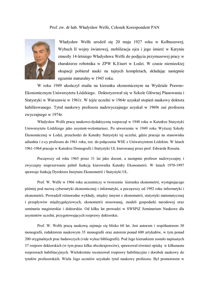 Prof. zw. dr hab. Władysław Welfe, Członek Korespondent PAN Władysław Welfe urodził się 20 maja 1927 roku w Kolbuszowej. Wybuch II wojny światowej, mobilizacja ojca i jego śmierć w Katyniu zmusiły 14-letniego Władysława Welfe do podjęcia przymusowej pracy w charakterze robotnika w ZPW K.Eisert w Łodzi. W czasie niemieckiej okupacji pobierał nauki na tajnych kompletach, składając następnie egzamin maturalny w 1945 roku. W roku 1949 ukończył studia na kierunku ekonomicznym na Wydziale PrawnoEkonomicznym Uniwersytetu Łódzkiego. Doktoryzował się w Szkole Głównej Planowania i Statystyki w Warszawie w 1961r. W tejże uczelni w 1964r uzyskał stopień naukowy doktora habilitowanego. Tytuł naukowy profesora nadzwyczajnego uzyskał w 1969r zaś profesora zwyczajnego w 1974r. Władysław Welfe pracę naukowo-dydaktyczną rozpoczął w 1948 roku w Katedrze Statystyki Uniwersytetu Łódzkiego jako asystent-wolontariusz. Po utworzeniu w 1949 roku Wyższej Szkoły Ekonomicznej w Łodzi, przechodzi do Katedry Statystyki tej uczelni, gdzie pracuje na stanowisku adiunkta i z-cy profesora do 1961 roku, tzn. do połączenia WSE z Uniwersytetem Łódzkim. W latach 1961-1964 pracuje w Katedrze Demografii i Statystyki UŁ kierowanej przez prof. Edwarda Rosseta. Począwszy od roku 1965 przez 31 lat jako docent, a następnie profesor nadzwyczajny i zwyczajny nieprzerwanie pełnił funkcję kierownika Katedry Ekonometrii. W latach 1970-1997 sprawuje funkcję Dyrektora Instytutu Ekonometrii i Statystyki UŁ. Prof. W. Welfe w 1966 roku uczestniczy w tworzeniu kierunku ekonometrii, występującego później pod nazwą cybernetyki ekonomicznej i informatyki, a począwszy od 1992 roku informatyki i ekonometrii. Prowadził różnorodne wykłady, między innymi z ekonometrii, statystyki matematycznej i przepływów międzygałęziowych, ekonometrii stosowanej, modeli gospodarki narodowej oraz seminaria magisterskie i doktorskie. Od kilku lat prowadzi w SWSPiZ Seminarium Naukowe dla asystentów uczelni, przygotowujących rozprawy doktorskie. Prof. W. Welfe pracą naukową zajmuje się blisko 60 lat. Jest autorem i współautorem 30 monografii, redaktorem naukowym 35 monografii oraz autorem ponad 600 artykułów, w tym ponad 200 oryginalnych prac badawczych (vide wykaz bibliografii). Pod Jego kierunkiem zostało napisanych 37 rozpraw doktorskich (w tym prace kilku obcokrajowców), sprawował również opiekę w kilkunastu rozprawach habilitacyjnych. Wielokrotnie recenzował rozprawy habilitacyjne i dorobek naukowy do tytułów profesorskich. Wielu Jego uczniów uzyskało tytuł naukowy profesora. Był promotorem w przewodach prowadzących do uzyskania tytułu doktora h.c. UŁ przez znakomitych uczonych jak akad. A. G. Aganbegjan, prof. L. R. Klein (laureat Nagrody Nobla) oraz R. Barre. Do najważniejszych wczesnych prac prof. Welfe należą rozprawy dotyczące przepływów międzygałęziowych i bilansów gospodarki oraz układów indeksów produkcji i cen oraz technik wytwarzania. Niemal równolegle zajmował się zagadnieniami ilościowego opisu działalności handlu oraz rynku dóbr konsumpcyjnych, formułując koncepcję bilansu popytu i podaży dóbr konsumpcyjnych. W następnych latach prowadził zespołowe badania nad ekonometrycznymi modelami konsumpcji w W. Brytanii i Polsce, a następnie modelami rynków, zwłaszcza rynków niezrównoważonych. Prowadził równolegle badania dotyczące metod estymacji, które znalazły wyraz w odpowiednich monografiach. Nowy obszar działalności naukowej prof. dr hab. W. Welfe stanowiły badania nad ekonometrycznymi makromodelami, zwłaszcza gospodarki Polski. Podczas pobytu w 1971 roku w Uniwersytecie Pensylwańskim skonstruował pierwszy model W1 gospodarki polskiej, postulujący stany nierównowagi. Wprowadził koncepcję modelu pełnego, łączącego elementy generujące przepływy informacyjne dotyczące popytu i podaży, a następnie modelu zintegrowanego (z modelami typu input-output). Opierając się na teorii gospodarki niedoborów J. Kornai’a oraz teorii barier wzrostu M. Kaleckiego, sformułował podstawowe hipotezy dotyczące własności mechanizmów funkcjonowania i barier wzrostu, które znalazły zastosowanie w kolejnych modelach opisujących gospodarkę niezrównoważoną. Pod Jego kierunkiem powstała w Instytucie Ekonometrii i Statystyki Uniwersytetu Łódzkiego w ramach problemów resortowych oraz centralnych seria „W” ekonometrycznych makromodeli gospodarki polskiej, obejmujące roczne modele wielosektorowe i małe - minimodele. Modele te były systematycznie aktualizowane oraz rozbudowywane przez dołączenie submodeli cen, płac oraz sektora finansowego. Modele te a zwłaszcza model W5 stanowił przez kilka lat podstawę systematycznych analiz i prognoz rozwoju kraju o horyzoncie 5-letnim. Prace te sprawiły, że ośrodek łódzki stał się wiodących centrum makromodelowania w Europie Centralnej. Uznaniem wysokiej pozycji łódzkiego ośrodka było zaproszenie już w 1967 roku prof. W. Welfe do uczestnictwa w międzynarodowym projekcie gospodarki światowej PROJECT LINK, kierowanym przez prof. L. R. Kleina, afiliowanym przy ONZ. Syntezę otrzymanych wyników do końca lat osiemdziesiątych przedstawia monografia pt. „Ekonometryczne modele gospodarki narodowej”, (PWE 1992). W świetle prezentowanych osiągnięć twórczości naukowej profesora W. Welfe, ośrodek łódzki utwierdził swoją wysoką pozycję w gronie najbardziej liczących się w Europie centrów badań ekonometrycznych i statystycznych, zaś prof. Welfe jest powszechnie uznawany za twórcę łódzkiej szkoły ekonometrycznej. W latach ’90 prof. Welfe, z dostatecznie dużym wyprzedzeniem przemian gospodarczych Polski zapoczątkował prace dotyczące makro-modelowania dla okresu transformacji do gospodarki rynkowej. W ich wyniku powstał nowy kwartalny model WK gospodarki narodowej Polski, dając początek systematycznym prognozom i analizom kwartalny
