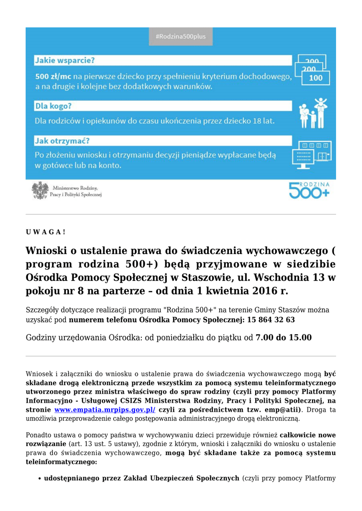 UWAGA! Wnioski o ustalenie prawa do świadczenia wychowawczego ( program rodzina 500+) będą przyjmowane w siedzibie Ośrodka Pomocy Społecznej w Staszowie, ul. Wschodnia 13 w pokoju nr 8 na parterze – od dnia 1 kwietnia 2016 r. Szczegóły dotyczące realizacji programu "Rodzina 500+" na terenie Gminy Staszów można uzyskać pod numerem telefonu Ośrodka Pomocy Społecznej: 15 864 32 63 Godziny urzędowania Ośrodka: od poniedziałku do piątku od 7.00 do 15.00 Wniosek i załączniki do wniosku o ustalenie prawa do świadczenia wychowawczego mogą być składane drogą elektroniczną przede wszystkim za pomocą systemu teleinformatycznego utworzonego przez ministra właściwego do spraw rodziny (czyli przy pomocy Platformy Informacyjno - Usługowej CSIZS Ministerstwa Rodziny, Pracy i Polityki Społecznej, na stronie www.empatia.mrpips.gov.pl/ czyli za pośrednictwem tzw. emp@atii). Droga ta umożliwia przeprowadzenie całego postępowania administracyjnego drogą elektroniczną. Ponadto ustawa o pomocy państwa w wychowywaniu dzieci przewiduje również całkowicie nowe rozwiązanie (art. 13 ust. 5 ustawy), zgodnie z którym, wnioski i załączniki do wniosku o ustalenie prawa do świadczenia wychowawczego, mogą być składane także za pomocą systemu teleinformatycznego: udostępnianego przez Zakład Ubezpieczeń Społecznych (czyli przy pomocy Platformy Usług Elektronicznych – PUE) – jeśli tą drogą dana osoba złoży wniosek o świadczenie wychowawcze z ewentualnymi załącznikami, wniosek ten zostanie przekierowany do systemu dziedzinowego danej gminy, która zobowiązana będzie wniosek dalej rozpatrywać w tradycyjnej formie pisemnej (art. 13 ust. 15 ustawy) banków krajowych świadczących usługi drogą elektroniczną spełniających wymogi określone w informacji zamieszczonej na stronie podmiotowej Biuletynu Informacji Publicznej ministra właściwego do spraw rodziny po uzgodnieniu z ministrem właściwym do spraw informatyzacji – jeśli tą drogą dana osoba złoży wniosek o świadczenie wychowawcze z ewentualnymi załącznikami, wniosek ten zostanie przekierowany do systemu dziedzinowego danej gminy, która zobowiązana będzie wniosek dalej rozpatrywać w tradycyjnej formie pisemnej (art. 13 ust. 15 ustawy). UWAGA: Załączniki do wniosku dołączają jedynie osoby, które ubiegają się o ustalenie prawa do świadczenia wychowawczego na pierwsze i kolejne dzieci. Osoby wnioskujące o przyznanie świadczenia wychowawczego na drugie i kolejne dzieci – składają sam wniosek bez załączników, ponieważ nie dokumentują dochodów. Osoby, które w okresie zasiłkowym 2015/2016 są uprawnione do zasiłku rodzinnego również składają sam wniosek bez załączników. Ważne: W przypadku złożenia wniosku o ustalenie prawa do świadczenia wychowawczego w terminie trzech miesięcy od dnia wejścia w życie ustawy, tj. w terminie od dnia 1 kwietnia do 1 lipca 2016 r. (włącznie), prawo do świadczenia wychowawczego na podstawie tego wniosku ustala się począwszy od dnia wejścia w życie ustawy, tj. od dnia 1 kwietnia 2016 r. i w konsekwencji wypłata świadczenia po jego przyznaniu dokonywana jest w takim przypadku z odpowiednim wyrównaniem. Natomiast rozpatrzenie przez organ właściwy wniosku złożonego w w/w. terminie ( tj. ustalenie i wypłata przyznanego świadczenia wychowawczego) następuje w terminie do trzech miesięcy licząc od dnia złożenia wniosku z prawidłowo wypełnionymi dokumentami. Wzór wniosku o ustalenie prawa do świadczenia rodzicielskiego (kliknij w obrazek aby przejść do strony pobierania) Najważniejsze informacje o programie "Rodzina 500+" w pytaniach i odpowiedziach 17 lutego 2016r. Prezydent podpisał ustawę o pomocy państwa w wychowywaniu dzieci „Rodzina 500 plus”. Program „Rodzina 500 plus” ruszy w całej Polsce już w kwietniu tego roku. Program Rodzina 500plus to 500 zł miesięcznie na drugie i kolejne dziecko, bez dodatkowych warunków. Rodziny o niskich dochodach otrzymają wsparcie także dla pierwszego lub jedynego dziecka przy spełnieniu kryterium 800 zł netto lub 1200 zł, w przypadku wychowywania w rodzinie dziecka niepełnosprawnego. To nawet 6.000 zł netto rocznego wsparcia dla dziecka. Świadczenie 500 zł to wsparcie długofalowe. Kto otrzyma świadczenie? Program Rodzina 500 plus to systemowe wsparcie polskich rodzin. Zgodnie z projektem, z pomocy skorzystają rodzice oraz opiekunowie dzieci do 18. roku życia. Rodzina z dwojgiem niepełnoletnich dzieci będzie mogła otrzymać 500 zł na drugie i kolejne dziecko niezależenie od dochodu. W przypadku rodzin z dochodem poniżej 800 zł netto na osobę wsparcie otrzyma rodzina także na pierwsze lub jedyne dziecko. Dla rodzin z dzieckiem niepełnosprawnym kryterium dochodowe jest wyższe i wynosi 1200 zł netto. Dodatkowe wsparcie w wysokości 500 zł otrzymają także rodziny zastępcze oraz rodzinne domy dziecka na każde dziecko, na podstawie ustawy o wspieraniu rodziny i systemie pieczy zastępczej. Czy każda rodzina otrzyma wsparcie? Świadczenie otrzyma rodzina bez względu na stan cywilny rodziców. Otrzymają je zatem zarówno rodziny, w których rodzice są w związku małżeńskim jak i rodziny niepełne oraz rodzice pozostający w nieformalnych związkach. W przypadku rodziców rozwiedzionych wsparcie otrzyma ten rodzic, który faktycznie sprawuje opiekę nad dzieckiem. Co w przypadku rodzin patchworkowych? Jeżeli partnerzy żyją w związku nieformalnym i mają dzieci z poprzednich związków oraz wychowują co najmniej jedno wspólne dziecko, to wówczas świadczenie wychowawcze na pierwsze dziecko będzie uzależnione od kryterium dochodowego, a na pozostałe dzieci bez względu na dochód. Dziecko do 25. r.ż., które pozostaje na utrzymaniu rodziców, jest uwzględniane przy obliczaniu dochodu na osobę w rodzinie. Dzięki temu jego młodszy brat lub siostra może nadal otrzymywać wsparcie, jeśli dochód na osobę nie przek