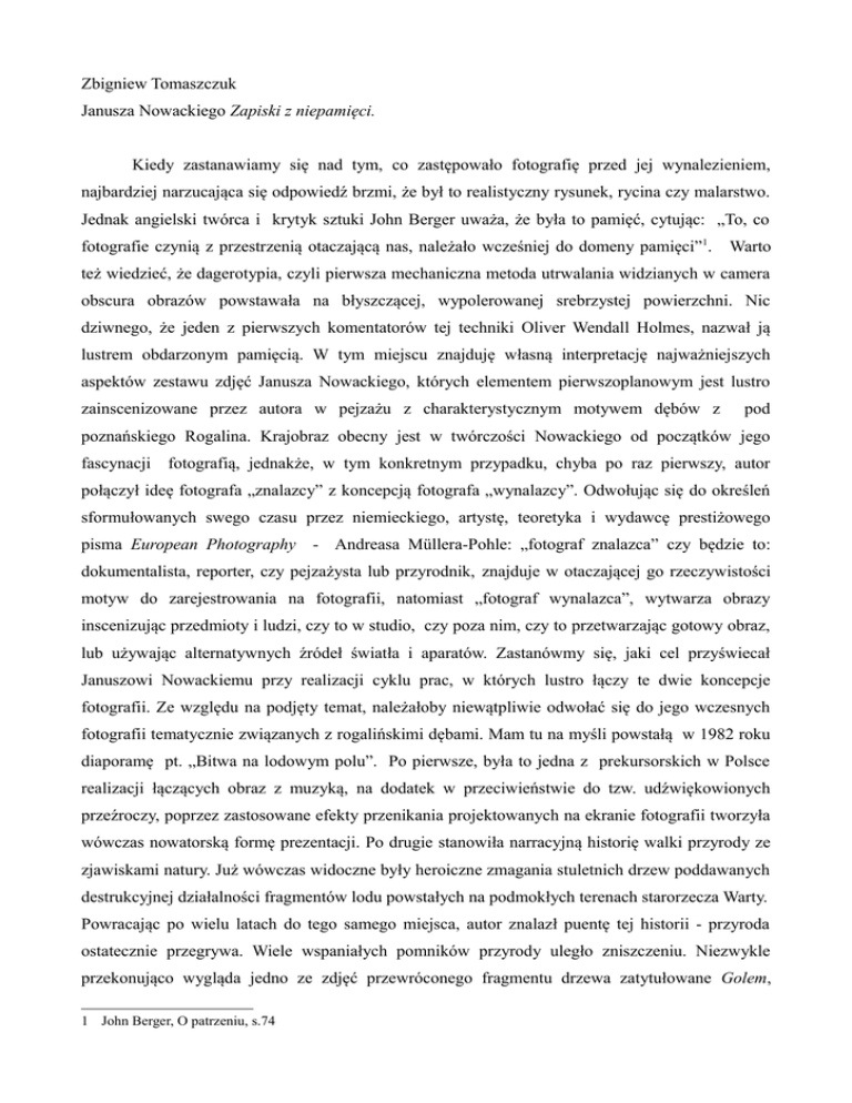 Zbigniew Tomaszczuk Janusza Nowackiego Zapiski z niepamięci. Kiedy zastanawiamy się nad tym, co zastępowało fotografię przed jej wynalezieniem, najbardziej narzucająca się odpowiedź brzmi, że był to realistyczny rysunek, rycina czy malarstwo. Jednak angielski twórca i krytyk sztuki John Berger uważa, że była to pamięć, cytując: „To, co fotografie czynią z przestrzenią otaczającą nas, należało wcześniej do domeny pamięci” 1. Warto też wiedzieć, że dagerotypia, czyli pierwsza mechaniczna metoda utrwalania widzianych w camera obscura obrazów powstawała na błyszczącej, wypolerowanej srebrzystej powierzchni. Nic dziwnego, że jeden z pierwszych komentatorów tej techniki Oliver Wendall Holmes, nazwał ją lustrem obdarzonym pamięcią. W tym miejscu znajduję własną interpretację najważniejszych aspektów zestawu zdjęć Janusza Nowackiego, których elementem pierwszoplanowym jest lustro zainscenizowane przez autora w pejzażu z charakterystycznym motywem dębów z pod poznańskiego Rogalina. Krajobraz obecny jest w twórczości Nowackiego od początków jego fascynacji fotografią, jednakże, w tym konkretnym przypadku, chyba po raz pierwszy, autor połączył ideę fotografa „znalazcy” z koncepcją fotografa „wynalazcy”. Odwołując się do określeń sformułowanych swego czasu przez niemieckiego, artystę, teoretyka i wydawcę prestiżowego pisma European Photography - Andreasa Müllera-Pohle: „fotograf znalazca” czy będzie to: dokumentalista, reporter, czy pejzażysta lub przyrodnik, znajduje w otaczającej go rzeczywistości motyw do zarejestrowania na fotografii, natomiast „fotograf wynalazca”, wytwarza obrazy inscenizując przedmioty i ludzi, czy to w studio, czy poza nim, czy to przetwarzając gotowy obraz, lub używając alternatywnych źródeł światła i aparatów. Zastanówmy się, jaki cel przyświecał Januszowi Nowackiemu przy realizacji cyklu prac, w których lustro łączy te dwie koncepcje fotografii. Ze względu na podjęty temat, należałoby niewątpliwie odwołać się do jego wczesnych fotografii tematycznie związanych z rogalińskimi dębami. Mam tu na myśli powstałą w 1982 roku diaporamę pt. „Bitwa na lodowym polu”. Po pierwsze, była to jedna z prekursorskich w Polsce realizacji łączących obraz z muzyką, na dodatek w przeciwieństwie do tzw. udźwiękowionych przeźroczy, poprzez zastosowane efekty przenikania projektowanych na ekranie fotografii tworzyła wówczas nowatorską formę prezentacji. Po drugie stanowiła narracyjną historię walki przyrody ze zjawiskami natury. Już wówczas widoczne były heroiczne zmagania stuletnich drzew poddawanych destrukcyjnej działalności fragmentów lodu powstałych na podmokłych terenach starorzecza Warty. Powracając po wielu latach do tego samego miejsca, autor znalazł puentę tej historii - przyroda ostatecznie przegrywa. Wiele wspaniałych pomników przyrody uległo zniszczeniu. Niezwykle przekonująco wygląda jedno ze zdjęć przewróconego fragmentu drzewa zatytułowane Golem, 1 John Berger, O patrzeniu, s.74 (które kształtem przypomina ludzką postać) i to zarówno ze względu na zawartą w fotografii symbolikę, jak również ze względu na nasze przekonanie o tym, że jego biologiczne części powoli wnikną w życiodajną glebę, w przeciwieństwie do wielu wcześniejszych fragmentów drzew, którym nie było to dane, ponieważ zostały zabrane przez lokalną ludność na rozpałkę. Golem powróci do natury – nie stanie się łupem „kultury”. Ponieważ autor zderza fragmenty pejzażu z zainstalowanymi przez siebie lustrami spróbujmy opisać istniejące tu relacje pomiędzy fotografią a lustrem. Pomocne będą tu refleksje Steve Edwardsa zamieszczone w książce Fotografia, bardzo krótkie wprowadzenie (wyd. w Polsce w 2014r). Autor opisując fenomen fotografii odwołuje się, między innymi do przywołanej powyżej koncepcji „lustra z pamięcią” wskazując na zasadnicze różnice pomiędzy obrazem fotograficznym a obrazem widzianym w odbiciu lustrzanym. Kluczem staje się tu pojęcie odbicia, fotografia jako odbicie rzeczywistości i obraz odbity a czasami zwielokrotniony przez lustro. Metafora fotografii jako odbicia dotyczy możliwości zatrzymania obrazu w czasie, w przeciwieństwie do znikających obrazów z powierzchni lustra. W tym miejscu przypomina mi się refleksja polskiego artysty Jana Berdyszaka związana z jego koncepcją „prefotografii jako fotografii efemerycznej”. Pisał między innymi: „W naturze świata nie brakuje wody, błota, lodu, a także wilgotnych gałek oczu ludzi i zwierząt, które działają jak zwierciadła. Materie odbijające i ruchomo widziane kąty odbijania obrazu tworzą prefotografię – nie utrwalone obrazy efemeryczne.” 2 Sam artysta często budował obiekty tworzone z szyb odbijających otoczenie, wywołujące zjawisko fotografii efemerycznej, której istotną cechą było istnienie w czasie aktualnym. Trzymając się pojęcia odbicia należy zwrócić uwagę na to, że na zdjęciach Janusza Nowackiego zaistniało podwójne odbicie rzeczywistości. Samo lustro stało się też obrazem. Jednym z czynników, które pozwalają na traktowanie lustra jako obrazu a nie jako przedstawienia rzeczywistości, jest oczywiście ograniczająca je rama. Nowacki wykorzystuje fragmenty luster o różnym kształcie, które tworzą również swoistą estetykę tych fotografii. Tym samym chciałbym zwrócić uwagę, na istotną cechę nie tylko tych zdjęć, a właściwie całej twórczości autora. Jest nią niezwykle precyzyjna dbałość o kompozycję. Stając przed tymi fotografiami widz, ma świadomość zaistnienia konstrukcji zdyscyplinowanej, opartej na harmonii kształtów i form i właśnie forma wpisana w kadr fotografii, nadaje tu zdecydowany indywidualny wymiar, potwierdzając że jednym z elementów pozwalających traktować fotografię jako autonomiczną dyscyplinę sztuki, jest s