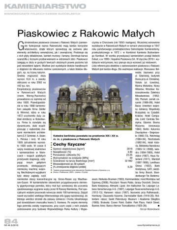 Kamieniarstwo Minimonografie Polskich kamieni budowlanych Piaskowiec z Rakowic Małych G fot. archiuwm órnokredowe piaskowce ciosowe z Rakowic Małych (zamienczynku w Chorzowie (rok 1950 i następne). Wcześniej wznowiono nie funkcjonuje nazwa Rakowiczki) mają bardzo korzystne wydobycie w Rakowicach Małych w ramach utworzonego w 1947 właściwości, dzięki którym sprawdzają się zarówno jako roku państwowego przedsiębiorstwa Dolnośląskie Kamieniołomy, elementy architektury wewnętrznej, jak i zewnętrznej. Produkuje się przekształconego w 1972 r. w Kombinat Kamienia Budowlanez nich płyty okładzinowe, kamień murowy i łamany. Dominuje barwa go Kambud. W wyniku prywatyzacji kamieniołom przejął kielecki szarożółta z licznymi przebarwieniami w odcieniach żółci. Piaskowce Exbud, a w 1999 r. Kopalnie Piaskowca SA. W styczniu 2010 r. wyzalegają w złożu w grubych ławicach ułożonych prawie poziomo lub dobycie wstrzymano, lecz planuje się je wznowić już niebawem. pod niewielkimi kątami. Możliwe jest wydobycie bloków handlowych Lista referencyjna obiektów z zastosowaniem piaskowca z Rakowic o objętości do kilkunastu metrów sześciennych, a także bloków dłuMałych jest bardzo długa. Oto ważniejsze realizacje. Warszawa: Belgich, np. na trzony kolumn. weder, biurowiec przy Średnia miąższość złoża ul. Gdańskiej, budynek wynosi 10,6 m, a zasoby Diana przy ul. Chmielnej, obliczono w roku 2002 na Vistula (ul. Łowicka), 442 tys. ton. Marina Mokotów, Nowy Eksploatację piaskowców Wilanów; Wrocław: Kow Rakowicach Małych ściuszkowska Dzielnica (niem. Wenig-Rackwitz) Mieszkaniowa (1952prowadzono co najmniej od 56); Poznań: zamek ceroku 1830. Prawdopodobsarski (1906-09), Hotel nie w roku 1888 kamienioBazar, cmentarz wojenłom zakupiła firma Zeidler ny żołnierzy Wspólnoty & Wimmel, która w roku Brytyjskiej na Cytadeli; 1872 uruchomiła duży zaKraków: Hotel Campakład obróbczy w Bolesławnile, Łódź: Centrala Tekcu. Firma ta rozwijała się stylna; Gdańsk: Brama dynamicznie, stale współWyżynna (renowacja pracując z najbardziej zna1884); Berlin: Kolumna nymi niemieckimi architekZwycięstwa – Siegesautami (C.F. Schinkel, A. Stuler, Katedra berlińska powstała na przełomie XIX i XX w. le (1865-73), Reichstag L. Persius i inni). W roku m. in. z piaskowca z Rakowic Małych (1884-94), Reichsbank 1939 zatrudnienie wynosi(1892-94), Hotel AstoCechy fizyczne* ło 1600 osób. W czasie II ria, Biblioteka Narodowa Gęstość objętościowa [kg/m3] 2019 (1903-14 i 2008), katewojny światowej skalnictwo Nasiąkliwość [%] 4,80 dra (1894-1905), Hotel i kamieniarstwo w NiemPorowatość całkowita [%] 22,05 czech i krajach podbitych Adlon (1907), Haus VaWytrzymałość na ściskanie [MPa] 49 terland (1911), Marstall przeżywało stagnację, ustę3 Ścieralność na tarczy Boehmego [mm ] 32 992 pując innym gałęziom (1897-1900), Landhaus Mrozoodporność po 48 cyklach przemysłu, obsługującym [% zmniejszenia objętości próbki] 0,29 Griess (1922), Bank niemiecką machinę wojenKredytowy, SATI, siedzi*badanie przeprowadzone przez laboratorium Zkušebna Kamene a Kameniva s.r.o. (Horice v Podkrkonosi, 2005 r., średnia z 10 prób) ną. Niechlubnymi wyjątkami ba firmy Bosch, Branbyły obozy zagłady, czyli denburger Tor, Bodemuniemieckie obozy koncentracyjne np. Gross-Rosen czy Mauthauseum, Herkules-Brunnen (1903), Kommandatur, most Monbijou nad sen-Gusen. W kamieniołomie rakowickim przygotowywano elemenSzprewą (2008); Poczdam: Neues Palais, tarasy Oranżerii; Drezno: ty gigantycznego pomnika, który miał być wzniesiony dla uczczenia Bank Kredytowy, Altmarkt; Lipsk: Am Hallischen Tor, Leipziger Lespodziewanego wygrania wojny przez III Rzeszę Niemiecką. Pod spebens Versicherungs A.G. (1907), Leipziger Feuerversicherungs A.G. cjalnymi wiatami pracowało wówczas około 100 kamieniarzy. Zdążyli (1912-13); Hanower: ratusz (1907), biurowiec przy Rathenaustr.; nawet wyrzeźbić wielkiego hitlerowskiego orła (gapę nazistowską), do Hamburg: Clausewitz Kaserne, Darmstadter Bank (1918-20); Rotktórego wkrótce strzelali dla zabawy żołnierze I Frontu Ukraińskiego terdam: ratusz; Sankt Petersburg: Muzeum i Akademia Stieglitza pod dowództwem marszałka Iwana S. Koniewa. Po wojnie elementy (1900); Bruksela: Crown Point; Dublin: Park Place, Hatch Street; Buenos Aires: Banco Aleman Transatlantico (1925-26). tego pomnika zostały rozproszone, przy czym część z nich znalazła zastosowanie przy budowie Wojewódzkiego Parku Kultury i WypoHenryk Walendowski 84 NK 48 (5/2010) www.RynekKamienia.pl