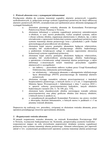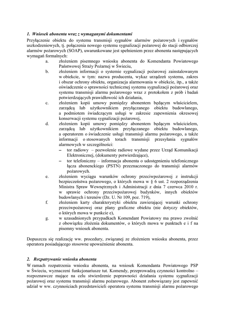 1. Wniosek abonenta wraz z wymaganymi dokumentami Przyłączenie obiektu do systemu transmisji sygnałów alarmów pożarowych i sygnałów uszkodzeniowych, tj. połączenia nowego systemu sygnalizacji pożarowej do stacji odbiorczej alarmów pożarowych (SOAP), uwarunkowane jest spełnieniem przez abonenta następujących wymagań formalnych: a. złożeniem pisemnego wniosku abonenta do Komendanta Powiatowego Państwowej Straży Pożarnej w Świeciu, b. złożeniem informacji o systemie sygnalizacji pożarowej zainstalowanym w obiekcie, w tym: nazwa producenta, wykaz urządzeń systemu, zakres i obszar ochrony obiektu, organizacja alarmowania w obiekcie, itp., a także oświadczenie o sprawności technicznej systemu sygnalizacji pożarowej oraz systemu transmisji alarmu pożarowego wraz z protokołem z prób i badań potwierdzających prawidłowość ich działania, c. złożeniem kopii umowy pomiędzy abonentem będącym właścicielem, zarządcą lub użytkownikiem przyłączanego obiektu budowlanego, a podmiotem świadczącym usługi w zakresie zapewnienia okresowej konserwacji systemu sygnalizacji pożarowej, d. złożeniem kopii umowy pomiędzy abonentem będącym właścicielem, zarządcą lub użytkownikiem przyłączanego obiektu budowlanego, a operatorem o świadczenie usługi transmisji alarmu pożarowego, a także informacji o stosowanych torach transmisji przesyłania sygnałów alarmowych w szczególności: tor radiowy – pozwolenie radiowe wydane przez Urząd Komunikacji Elektronicznej, (dokumenty potwierdzające), tor telefoniczny – informacja abonenta o udostępnieniu telefonicznego łącza abonenckiego (PSTN) przeznaczonego do transmisji alarmów pożarowych. e. złożeniem wyciągu warunków ochrony przeciwpożarowej z instrukcji bezpieczeństwa pożarowego, o których mowa w § 6 ust. 2 rozporządzenia Ministra Spraw Wewnętrznych i Administracji z dnia 7 czerwca 2010 r. w sprawie ochrony przeciwpożarowej budynków, innych obiektów budowlanych i terenów (Dz. U. Nr 109, poz. 719), f. złożeniem karty charakterystyki obiektu zawierającej warunki ochrony przeciwpożarowej oraz plany graficzne obiektu (nie dotyczy obiektów, o których mowa w punkcie e), g. w uzasadnionych przypadkach Komendant Powiatowy ma prawo zwolnić z obowiązku złożenia dokumentów, o których mowa w punktach e i f na pisemny wniosek abonenta. Dopuszcza się realizację ww. procedury, związanej ze złożeniem wniosku abonenta, przez operatora posiadającego stosowne upoważnienie abonenta. 2. Rozpatrywanie wniosku abonenta W ramach rozpatrzenia wniosku abonenta, na wniosek Komendanta Powiatowego PSP w Świeciu, wyznaczeni funkcjonariusze tut. Komendy, przeprowadzą czynności kontrolno – rozpoznawcze mające na celu stwierdzenie poprawności działania systemu sygnalizacji pożarowej oraz systemu transmisji alarmu pożarowego. Abonent zobowiązany jest zapewnić udział w ww. czynnościach przedstawicieli operatora systemu transmisji alarmu pożarowego oraz podmiotu świadczącego usługi w zakresie konserwacji systemu sygnalizacji pożarowej w chronionym obiekcie (czynności, o których mowa wyżej mogą być częścią postępowania związanego z odbiorem obiektu w trybie art. 56 ustawy „Prawo Budowlane”). Komendant Powiatowy Państwowej Straży Pożarnej w Świeciu, w ramach rozpatrywania wniosku abonenta może żądać od abonenta i/lub operatora dodatkowych dokumentów i informacji ważnych z punktu widzenia oceny prowadzonego postępowania. W ramach rozpatrywania wniosku abonenta, sporządza się protokół obejmujący ocenę kompletności oraz zgodności z wymaganiami niniejszych warunków organizacyjno – technicznych, dokumentacji złożonej przez abonenta. Po rozpatrzeniu wniosku należy pisemnie zawiadomić abonenta o uzgodnieniu sposobu połączenia lub odmowie uzgodnienia sposobu połączenia urządzeń sygnalizacyjno – alarmowych systemu sygnalizacji pożarowej z obiektem Komendy Powiatowej Państwowej Straży Pożarnej w Świeciu przy ul. Laskowickiej 2. Odmowa uzgodnienia sposobu połączenia może nastąpić w szczególności w następujących przypadkach: a. stwierdzenia niespełnienia przez abonenta wymagań formalnych i technicznych określonych w załączniku nr 1 do Zarzadzenia nr 1/2013, b. stwierdzenia wykonania systemu sygnalizacji pożarowej niezgodnie z projektem, c. stwierdzenia niewłaściwego działania systemu sygnalizacji pożarowej i/lub systemu transmisji alarmu pożarowego, d. braku identyfikacji obiektu; w przypadku występowania kilku obiektów podłączonych do centrali sygnalizacji pożarowej, jako centrali zbiorczej, z której przesyłany jest alarm pożarowy do centrum odbiorczego alarmów pożarowych, e. stwierdzenia braku przeszkolenia personelu chronionego obiektu w zakresie obsługi systemu sygnalizacji pożarowej. Występowanie warunków, o których mowa w pkt. od a do e nie zwalnia z obowiązku połączenia urządzeń sygnalizacyjno-alarmowych systemu sygnalizacji pożarowej w odniesieniu do obiektów, o których mowa w § 28 ust. 1 rozporządzenia Ministra Spraw Wewnętrznych i Administracji z dnia 7 czerwca 2010 r. w sprawie ochrony przeciwpożarowej budynków, innych obiektów budowlanych i terenów (Dz. U. Nr 109, poz. 719), z obiektem wskazanym przez Komendanta Powiatowego PSP w Świeciu. Właściciele, zarządcy lub użytkownicy obiektów istniejących, użytkowanych i podpiętych do systemu monitoringu pożarowego, (dot. obiektów, o których mowa w §28 ust. 1 rozporządzenia Ministra Spraw Wewnętrznych i Administracji z dnia 7 czerwca 2010r. w sprawie ochrony przeciwpożarowej budynków, innych obiektów budowlanych i terenów (Dz. U. Nr 109, poz. 719)), którzy chcą zmienić operatora systemu monitoringu pożarowego na nowego, który nie ma podpisanej umowy z tut. Komendą, do czasu uruchomienia systemu monitoringu pożarowego przez nowego operatora ze stacją odbiorczą alarmów pożarowych zainstalowaną i funkcjonują