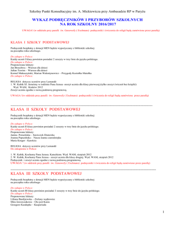 Szkolny Punkt Konsultacyjny im. A. Mickiewicza przy Ambasadzie RP w Paryżu WYKAZ PODRĘCZNIKÓW I PRZYBORÓW SZKOLNYCH NA ROK SZKOLNY 2016/2017 UWAGA! (w oddziale przy parafii św. Genowefy ( Exelmans) podręczniki i ćwiczenia do religii będą zamówione przez parafię) KLASA I SZKOŁY PODSTAWOWEJ Podręcznik bezpłatny z dotacji MEN będzie wypożyczany z biblioteki szkolnej na początku roku szkolnego. Do zakupu w Polsce: Każdy uczeń I klasy powinien posiadać 2 zeszyty w trzy linie do języka polskiego. Do zakupu w Polsce: Proponowane lektury: Jan Brzechwa – Wiersze dla dzieci Julian Tuwim – Wiersze dla dzieci Kornel Makuszyński, Marian Walentynowicz – Przygody Koziołka Matołka Do zakupu w Polsce: RELIGIA dotyczy uczniów przy Lamandé 1. W. Kubik SJ. Jesteśmy w rodzinie Pana Jezusa -zeszyt ucznia dla klasy pierwszej.(tylko zeszyt ćwiczeń bez książki) Wyd. WAM, Kraków 2012 Zeszyt ucznia zgodne z nową podstawą programową. UWAGA !(w oddziale przy parafii św. Genowefy ( Exelmans) podręczniki i ćwiczenia do religii będą zamówione przez parafię) ------------------------------------------------------------------------------------------------------------------------- KLASA II SZKOŁY PODSTAWOWEJ Podręcznik bezpłatny z dotacji MEN będzie wypożyczany z biblioteki szkolnej na początku roku szkolnego. Do zakupu w Polsce: Każdy uczeń II klasy powinien posiadać 2 zeszyty w trzy linie do języka polskiego. Do zakupu w Polsce: Proponowane lektury: Janina Porazińska – Szewczyk Dratewka Joanna Papuzińska - Nasza mama czarodziejka Maria Kruger - Karolcia RELIGIA dotyczy uczniów przy Lamandé Do zakupienia w Polsce: 1. W. Kubik, Kochamy Pana Jezusa. Katechizm. Wyd. WAM, sierpień 2012 2. W. Kubik, Kochamy Pana Jezusa - zeszyt ucznia dla klasy drugiej. Wyd. WAM, sierpień 2012 Podręcznik i zeszyt ucznia zgodne z nową podstawą programową. UWAGA ! (w oddziale przy parafii św. Genowefy ( Exelmans) podręczniki i ćwiczenia do religii będą zamówione przez parafię) ---------------------------------------------------------------------------------------------------------------------------- KLASA III SZKOŁY PODSTAWOWEJ Podręcznik bezpłatny z dotacji MEN będzie wypożyczany z biblioteki szkolnej na początku roku szkolnego Do zakupu w Polsce: Każdy uczeń III klasy powinien posiadać 2 zeszyty w trzy linie do języka polskiego. Do zakupu w Polsce: Proponowane lektury: Liliana Bardijewska – Zielony wędrowiec Mira Jaworczakowa – Oto jest Kasia Grzegorz Kasdepke – Kacperiada 1 Szkolny Punkt Konsultacyjny im. A. Mickiewicza przy Ambasadzie RP w Paryżu RELIGIA dotyczy uczniów przy Lamandé Do zakupu w Polsce: 1. Mały Katechizm. Wyd. Świętego Krzyża, 2011 UWAGA! (w oddziale przy parafii św. Genowefy ( Exelmans) podręczniki i ćwiczenia do religii będą zakupione przez parafię -------------------------------------------------------------------------------------------------------------------------------------------------------------- KLASA IV SZKOŁY PODSTAWOWEJ Podręczniki bezpłatne z dotacji MEN będą wypożyczane z biblioteki szkolnej na początku roku szkolnego. Do zakupienia w Polsce: 1. Atlas historyczny Od starożytności do współczesności. Szkoła podstawowa. Wyd. NOWA ERA 2. Nowy Atlas. Przyroda Świat wokół nas. Wyd. NOWA ERA. Do zakupienia w Polsce: RELIGIA dotyczy uczniów przy Lamandé 1. Z. Marek SJ, Zaproszeni przez Boga – katechizm. Wyd. WAM, Kraków, sierpień 2012 2. Z. Marek SJ, Zaproszeni przez Boga - zeszyt ucznia dla klasy czwartej. Wyd. WAM, sierpień 2012 UWAGA! (w oddziale przy parafii św. Genowefy ( Exelmans) podręczniki i ćwiczenia do religii będą zamówione przez parafię) Do zakupienia w Polsce: Lektury: J. Brzechwa, Akademia Pana Kleksa P. Beręsewicz – Co tam u Ciumków? A. Bahdaj, Wakacje z duchami ---------------------------------------------------------------------------------------------------------------------------------------------------------------------------------------- KLASA V SZKOŁY PODSTAWOWEJ Podręczniki bezpłatne z dotacji MEN będą wypożyczane z biblioteki szkolnej na początku roku szkolnego Do zakupienia w Polsce: 1. Atlas historyczny Od starożytności do współczesności. Szkoła podstawowa. Wyd. NOWA ERA. 2. Nowy Atlas. Przyroda. Świat wokół nas. Wyd. NOWA ERA. UWAGA: Atlasy - poz. 1 i 2 - obowiązywały już w klasie czwartej, zakup dotyczy wyłącznie nowych uczniów. Do zakupienia w Polsce: Lektury: H. Sienkiewicz, W pustyni i w puszczy A. Oppman, Wybór legend M. Wojtyszko – Bromba i inni Z. Nienacki, Pan Samochodzik i Templariusze Do zakupienia w Polsce: RELIGIA dotyczy uczniów przy Lamandé 1. Z.Marek SJ, A. Walulik, Obdarowani przez Boga. Podręcznik dla klasy piątej. Wyd. WAM 2013 2. Z.Marek SJ, A. Walulik, Obdarowani przez Boga, Zeszyt ucznia dla klasy piątej. Wyd. WAM Kraków, 2013 UWAGA! (w oddziale przy parafii św. Genowefy ( Exelmans) podręczniki i ćwiczenia do religii będą zamówione przez parafię) -------------------------------------------------------------------------------------------------------------------------------------------------------------------- KLASA VI SZKOŁY PODSTAWOWEJ Do zakupienia w Polsce: JĘZYK POLSKI 1. H. Dobrowolska Jutro pójdę w świat. Podręcznik do kształcenia literackiego, kulturowego i językowego dla klasy szóstej szkoły podstawowej. Wyd. WSiP (wyd. najnowsze z 2014 r.). 2. H. Dobrowolska, Jutro pójdę w świat, Język polski 6. Zeszyt ćwiczeń. Wyd. WSiP (wyd. najnowsze z 2014 r.). WIEDZA O POLSCE 1. R. Antosik, podręcznik Historia i społeczeństwo 6 – seria Odkrywamy na nowo. Wyd. OPERON. 2 Szkolny Punkt Konsultacyjny im. A. Mickiewicza przy Ambasadzie RP w Paryżu 2. R. Antosik, zeszyt ćwiczeń Historia i społeczeństwo 6 – seria Odkrywamy na nowo. Wyd. OPERON. 3. Atlas historyczny Od starożytności do współczesności. Szkoła podstawowa. Wyd. NOWA ERA. 4. U. Depczyk, B. Sienkiewicz, Przyrod