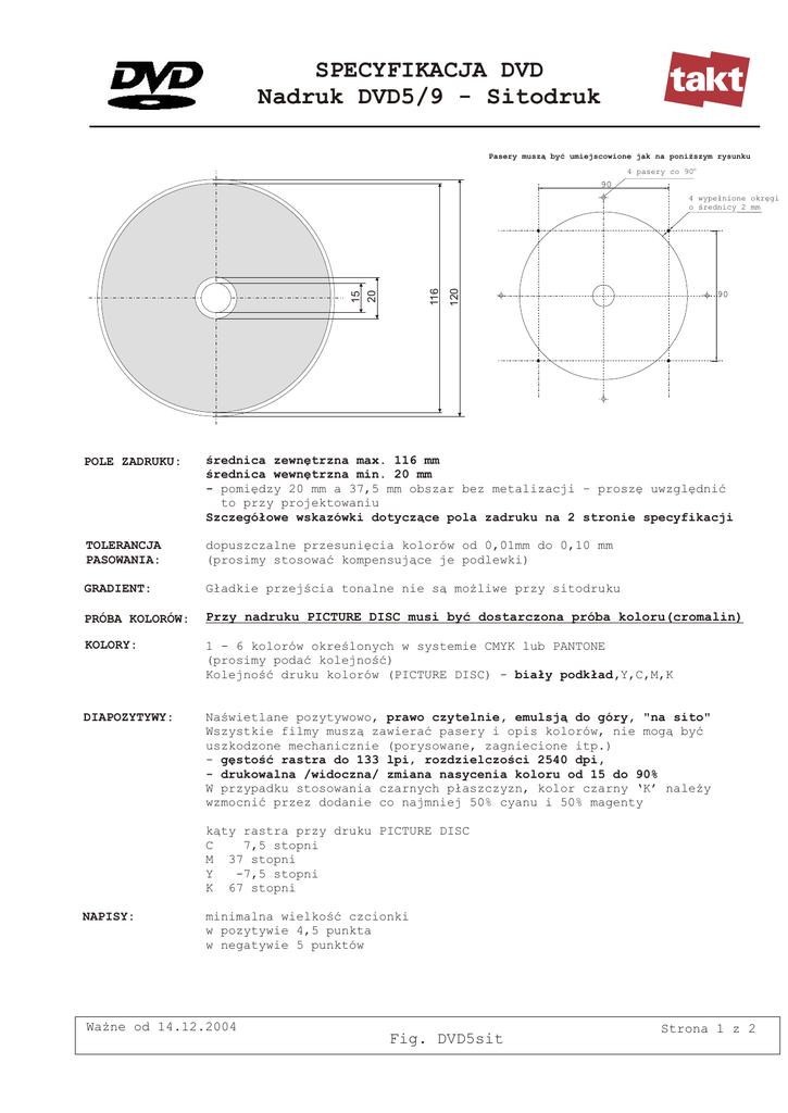 SPECYFIKACJA DVD Nadruk DVD5/9 - Sitodruk Pasery muszą być umiejscowione jak na poniższym rysunku 4 pasery co 90o 90 120 15 20 116 4 wypełnione okręgi o średnicy 2 mm 90 POLE ZADRUKU: średnica zewnętrzna max. 116 mm średnica wewnętrzna min. 20 mm - pomiędzy 20 mm a 37,5 mm obszar bez metalizacji – proszę uwzględnić to przy projektowaniu Szczegółowe wskazówki dotyczące pola zadruku na 2 stronie specyfikacji TOLERANCJA PASOWANIA: dopuszczalne przesunięcia kolorów od 0,01mm do 0,10 mm (prosimy stosować kompensujące je podlewki) GRADIENT: Gładkie przejścia tonalne nie są możliwe przy sitodruku PRÓBA KOLORÓW: Przy nadruku PICTURE DISC musi być dostarczona próba koloru(cromalin) KOLORY: 1 - 6 kolorów określonych w systemie CMYK lub PANTONE (prosimy podać kolejność) Kolejność druku kolorów (PICTURE DISC) - biały podkład,Y,C,M,K DIAPOZYTYWY: Naświetlane pozytywowo, prawo czytelnie, emulsją do góry, "na sito" Wszystkie filmy muszą zawierać pasery i opis kolorów, nie mogą być uszkodzone mechanicznie (porysowane, zagniecione itp.) - gęstość rastra do 133 lpi, rozdzielczości 2540 dpi, - drukowalna /widoczna/ zmiana nasycenia koloru od 15 do 90% W przypadku stosowania czarnych płaszczyzn, kolor czarny ‘K’ należy wzmocnić przez dodanie co najmniej 50% cyanu i 50% magenty kąty rastra przy druku PICTURE DISC C 7,5 stopni M 37 stopni Y -7,5 stopni K 67 stopni NAPISY: minimalna wielkość czcionki w pozytywie 4,5 punkta w negatywie 5 punktów Ważne od 14.12.2004 Fig. DVD5sit Strona 1 z 2 SPECYFIKACJA DVD Nadruk DVD5/9 - Sitodruk Zalecenia dla nadruku bez podkładu lub podkładu z wybraniem Metalizacja Obszar bez metalizacji - przezroczysty plastik 45 116 37 IIII I II II I IIII III II Obszar o jednolitej metalizacji 20 IIIIIIII kt.com.pl w.ta ww 4545454545 545 Obszar o innym odcieniu i niejednorodnym charakterze (umieszcza się tutaj nr technologiczny, kod kreskowy itp.) METALIZACJA a nadruk Struktura metalizacji płyty w obszarze nadruku: od 116 do 45 mm - jednolita metalizacja od 45 do 37 mm - metalizacja o innym odcieniu z dodatkowymi elementami tj. kod kreskowy, nr. technologiczne itp. od 37 do 20 mm - brak metalizacji, przezroczysty plastik Przy projektowaniu nadruku bez podkładu lub podkładu z wybraniem należy wziąć pod uwagę różnice w wyglądzie metalizacji płyty. Niejednorodność tła pomiędzy 45 a 37 mm spowoduje że elementy mogą stać się mało estetyczne a czasem nawet nieczytelne. Nadruk na obszarze bez metalizacji może różnić się kolorystycznie w stosunku do nadruku na pozostałym obszarze. Zalecamy projektowanie nadruku w obszarze 116 do 45 mm. Ważne od 14.12.2004 Fig. DVD5sit Strona 2 z 2