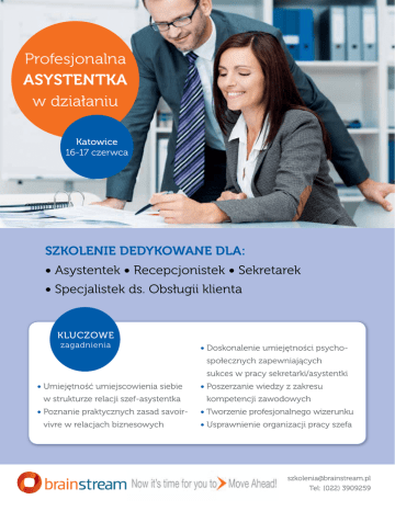 Profesjonalna ASYSTENTKA w działaniu Katowice 16-17 czerwca SZKOLENIE DEDYKOWANE DLA: • Asystentek • Recepcjonistek • S ekretarek • Specjalistek ds. Obsługii klienta KLUCZOWE zagadnienia • Doskonalenie umiejętności psychospołecznych zapewniających sukces w pracy sekretarki/asystentki • Umiejętność umiejscowienia siebie w strukturze relacji szef-asystentka • Poznanie praktycznych zasad savoirvivre w relacjach biznesowych • Poszerzanie wiedzy z zakresu kompetencji zawodowych • Tworzenie profesjonalnego wizerunku • Usprawnienie organizacji pracy szefa [email protected] Tel: (022) 3909259 Profesjonalna ASYSTENTKA w działaniu O trenerze Łukasz Janiec Psycholog, trener biznesu, coach, prowadzi szkolenia od kliku lat. Specjalizuje się w doskonaleniu kompetencji menadżerskich i kierowniczych zarówno w obszarze zarządzania jak i rozwoju osobistego. W swoim doświadczeniu zawodowym zajmował się opracowywaniem strategii i programów szkoleniowych dla firm z różnych branż, specjalizuje się w szkoleniach trenerskich, rozwojowych oraz coachingiem indywidualnym jak i grupowym. Szkolił menedżerów rożnego szczebla, urzędników państwowych, finansistów, handlowców pracujących dla firm o międzynarodowym zasięgu. Na swoim koncie ma ponad 4000 godzin przeprowadzonych treningów, jego szkolenia wyróżniają się dzięki zastosowaniu innowacyjnych gier, jak i metod szkoleniowych. Pracował dla takich firm jak PwC, Pracuj.pl, Coca-Cola, Orlen, Dell, MasterCard, Polpharma, ING Bank Śląski i inne. Organizator Brainstream to firma szkoleniowa specjalizująca się w szkoleniach z zakresu umiejetności menedżerskich, interpersonalnych, handlowych oraz budowania efektywnych zespołów biznesowych. Współpracujemy z trenerami, posiadającymi kilkuletnie doświadczenie w komponowaniu i przeprowadzaniu szkoleń dla wielu branż i sekto- rów. Nasi trenerzy to osoby z długoletnim stażem pracy w biznesie na stanowiskach kierowniczych. Prowadzone przez nas szkolenia opierają się na naszej dobrze ustrukturyzowanej wiedzy oraz dogłębnej analizie i rozumieniu środowiska biznesowego naszych klientów, co pozwala na dobranie odpowiednich metod i środków przekazu gwarantujących osiągnięcie oczekiwanych celów. [email protected] Tel: (022) 3909259 Cele szkolenia Profesjonalna ASYSTENTKA w działaniu Cele szkolenia: •D oskonalenie umiejętności psychospołecznych zapewniających sukces w pracy sekretarki/asystentki. •P oszerzanie wiedzy z zakresu kompe- Metody: Prezentacje, ćwiczenia indywidualne, zespołowe i grupowe, projekcja filmów video, odgrywanie ról, dyskusja moderowana. tencji zawodowych. •T worzenie profesjonalnego wizerunku •U sprawnienie organizacji pracy szefa 1 dzień Program szkolenia Pigułka savoir vivre’u w pracy asystentki •O bycie umila życie, czyli po co savoir-vivre? •D yskrecja i dyplomacja jako główne cnoty sekretarskie, •P rowadzenie rozmów telefonicznych, •P rzyjmowanie klientów wewnętrznych i zewnętrznych; formy grzecznościowe w pracy, reguły pierwszeństwa, powitania, przedstawianie się, ukłony, •G oście w firmie: organizacja przyjęć, zachowanie przy stole, rozsadzanie gości na przyjęciu, w aucie, przyjęcia na stojąco i siedząco, •P rzy stole konferencyjnych czyli o zebraniach, naradach i konferencjach, Asertywny styl komunikacji czyli stanowczość, która nie rani •K iedy asertywność a kiedy dyplomacja? •W ybrane techniki asertywne jako główne narzędzie w sytuacjach trudnych, •T rudna sztuka odmawiania, •A sertywne wyrażanie uczuć, •U dzielanie informacji zwrotnych, • F ormułowanie próśb [email protected] Tel: (022) 3909259 Profesjonalna ASYSTENTKA w działaniu 1 dzień Program szkolenia Ochrona czasu pracy szefa •P rowadzenie kalendarza szefa, •U stalenie zasad współpracy, wzajemnych wymagań i oczekiwań, •U przedzanie potrzeb szefa, elastyczność i empatia - atuty nowoczesnej sekretarki/ asystentki, •U stalanie priorytetów - granice własnej odpowiedzialności w podejmowaniu decyzji. Przygotowanie prezentacji dla szefa •Z asady tworzenia profesjonalnej prezentacji, • Ś wiadomość celów wystąpienia i środków przekazu, •P rzygotowanie materiałów, posługiwanie się środkami dydaktycznymi. 2 dzień Tworzenie własnego wizerunku i autoprezentacja firmy: •T roska o wizerunek własny, wizerunek szefa oraz wizerunek firmy, •E lementy własnego wizerunku, •Z łodzieje wizerunku, •K ultura wyglądu zewnętrznego: zasady ubierania się do pracy, standardy ubrań, fryzura, obuwie, dodatki, •T ypy urody a kolory w garderobie, sztuka makijażu, •O perowanie ciałem i przestrzenią – zadbanie o wdzięk i estetykę. Komunikacja interpersonalna – doskonalenie sprawności w porozumiewaniu się: •M echanizmy obronne jako naturalny objaw zablokowanej komunikacji. •C ztery płaszczyzny analizy wypowiedzi: płaszczyzna rzeczowa, ujawnianie siebie, ujawnianie relacji wzajemnej, apel czyli słuchanie czworgiem uszu. •M odelowanie postawy: ”Ja jestem w porządku – Ty jesteś w porządku”. [email protected] Tel: (022) 3909259 Profesjonalna ASYSTENTKA w działaniu 2 dzień Program szkolenia Jak oswoić stres? •N a czym polega mechanizm stresu? •Ź ródła stresu w pracy, •R adzenie sobie z napięciami poprzez stosowanie technik relaksacyjnych, •R ozwijanie konstruktywnych wzorców myślowych Sztuka zdrowego pozytywnego myślenia • J ak zadbać o własny poziom motywacji? • 1 2 błędów w myśleniu inteligentnego człowieka, •Z asady zdrowego pozytywnego myślenia, •P ostawy wobec życia i ich przełożenie na sukces zawodowy: optymizm i pesymizm. Zdrowa samoocena kluczem do sukcesu zawodowego • S kładniki poczucia własnej wartości, •G łówne strategie budowania samooceny, •C o to znaczy kochać siebie? •W ięcej masz – więcej dasz, czyli wpływ samooceny na relacje z innymi. [email protected] Tel: (022) 3