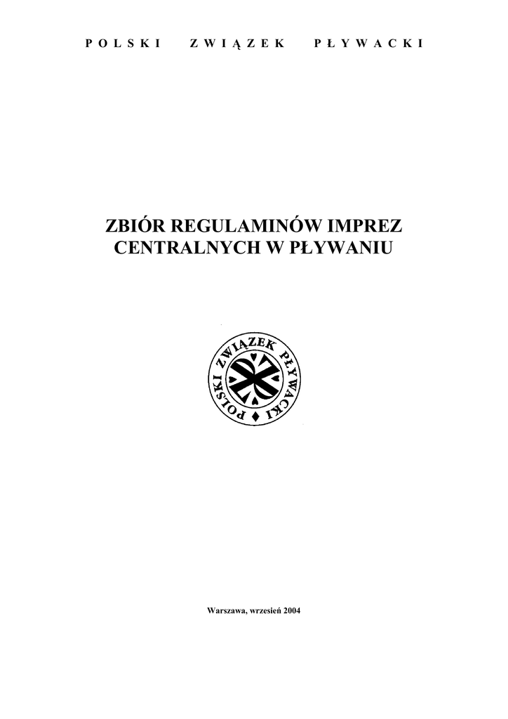 P O L S K I Z W I Ą Z E K P Ł Y W A C K I ZBIÓR REGULAMINÓW IMPREZ CENTRALNYCH W PŁYWANIU Warszawa, wrzesień 2004 ZBIÓR REGULAMINÓW IMPREZ CENTRALNYCH Spis treści: 1 ZASADY GENERALNE DO WSZYSTKICH REGULAMINÓW ZAWODÓW PŁYWACKICH 2 str. 3 WYTYCZNE I WYMOGI DOTYCZĄCE WYPOSAŻENIA OBIEKTU ORAZ OBOWIĄZKI ORGANIZATORA NA ZAWODACH PŁYWACKICH CEREMONIAŁ OTWARCIA MISTRZOSTW POLSKI W PŁYWANIU str. 6 4 CEREMONIAŁ ZAMKNIĘCIA MISTRZOSTW POLSKI W PŁYWANIU str. 8 5 TRYB POWOŁYWANIA, SKŁAD I ZAKRES DZIAŁANIA KOMISJI ODWOŁAWCZYCH str. 9 6 REGULAMIN ZIMOWYCH I GŁÓWNYCH-LETNICH MISTRZOSTW POLSKI W PŁYWANIU SENIORÓW I MŁODZIEŻOWCÓW 19 - 20 LAT str.12 7 REGULAMIN ZIMOWYCH MISTRZOSTW POLSKI W PŁYWANIU JUNIORÓW 17-18 LAT I LETNICH MISTRZOSTW OGÓLNOPOLSKIEJ OLIMPIADY MŁODZIEŻY JUNIORÓW 17-18 LAT str.14 8 REGULAMIN ZIMOWYCH I LETNICH MISTRZOSTW POLSKI W PŁYWANIU JUNIORÓW MŁODSZYCH 16 LAT str.16 9 REGULAMIN ZIMOWYCH I LETNICH MISTRZOSTW POLSKI W PŁYWANIU JUNIORÓW MŁODSZYCH 15 LAT str.18 10 REGULAMIN ZIMOWYCH I LETNICH MISTRZOSTW POLSKI W PŁYWANIU JUNIORÓW MŁODSZYCH 14 LAT str.20 11 REGULAMIN ZIMOWYCH I LETNICH MISTRZOSTW POLSKI W PŁYWANIU MŁODZIKÓW 13 LAT str.22 12 REGULAMIN MIĘDZWOJEWÓDZKICH MISTRZOSTW POLSKI W PŁYWANIU MŁODZIKÓW - 12 LAT str.24 13 REGULAMIN DRUŻYNOWYCH MISTRZOSTW WOJEWÓDZTW W PŁYWANIU MŁODZIKÓW - 12 LAT str.26 14 REGULAMIN KORESPONDENCYJNYCH MISTRZOSTW POLSKI W PŁYWANIU DZIECI 10 - 11 LAT str.28 15 REGULAMIN DRUŻYNOWYCH MISTRZOSTW POLSKI W PŁYWANIU str.30 16 REGULAMIN ZAWODÓW GRAND PRIX POLSKI W PŁYWANIU str.32 17 REGULAMIN LIGI SZKÓŁ MISTRZOSTWA SPORTOWEGO W PŁYWANIU str.34 18 REGULAMIN OGÓLNOPOLSKIEGO SPRAWDZIANU WYTRZYMAŁOŚCI W PŁYWANIU str. 36 19 REGULAMIN OGÓLNOPOLSKIEGO SPRAWDZIANU WSZECHSTRONNOŚCI W PŁYWANIU str. 37 3 2 str. 7 ZASADY GENERALNE DO WSZYSTKICH REGULAMINÓW ZAWODÓW PŁYWACKICH 1. Termin i miejsce zawodów. Zgodnie z kalendarzem sportowym PZP na dany rok. 2. Kierownictwo zawodów - Komisja Sędziowska i Odwoławcza. 2.1. Kierownictwo sportowe zawodów sprawuje Komisja Pływania: − PZP na wszystkich mistrzostwach Polski we wszystkich kategoriach wiekowych oraz zawodach Grand Prix i Drużynowych Mistrzostwach Polski, − OZP na pozostałych zawodach. 2.2. Organizatora zawodów wyznacza PZP. 2.3. Pełnomocnikiem Związku w zakresie przeprowadzenia zawodów jest Delegat Zarządu PZP/OZP wyznaczony przez: − PZP na wszystkie mistrzostwa Polski we wszystkich kategoriach wiekowych, zawody Grand Prix oraz Drużynowe Mistrzostwa Polski, − OZP na pozostałe zawody. 2.4. Ostateczną weryfikację wyników zawodów centralnych przeprowadza Komisja Pływania PZP, a zawodów pozostałych obowiązkowo Komisja Pływania OZP. 2.5. Komisja Sędziowska. 2.5.1. Komisje sędziowskie na wszystkie zawody powołują władze sędziowskie OZP, na którego terenie odbywa się impreza. 2.5.2. Prezydium Kolegium Sędziów PZP powołuje na imprezy centralne sędziów na główne funkcje. Liczba dodatkowo powołanych zależy od rangi imprezy oraz liczby i klasy sędziów miejscowych.. 2.5.3. Maksymalny skład komisji sędziowskiej wynosi: − 26 osób na pływalni 8-torowej, − 22 osoby na pływalni 6-torowej. 2.6. Komisja Odwoławcza. 2.6.1. Komisja Odwoławcza powoływana jest obowiązkowo na zimowe i główne letnie mistrzostwa Polski seniorów oraz może być powołana na pozostałe imprezy centralne. 2.6.2. Tryb powoływania, skład i zakres działania Komisji określa odrębny regulamin. 3. Uczestnictwo. 3.1. W zawodach mają prawo startu zawodnicy odpowiadający następującym wymogom : − zgłoszeni przez klub/szkołę lub PZP − posiadają „sztywną” kartę zgłoszeń (licencję) − posiadają aktualne badania lekarskie, − spełniają wymogi regulaminów określonych zawodów. 3 W przypadku stwierdzenia zgłoszenia do zawodów niezgodnego z regulaminem zawodnik może być dopuszczony pod warunkiem uiszczenia opłaty porządkowej w wysokości 200 złotych. Opłatę należy uiścić na odprawie technicznej na rzecz głównego organizatora . 3.2. W zawodach mogą uczestniczyć w poszczególnych konkurencjach jedynie zawodnicy zgłoszeni w terminie. Nie dopuszcza się dodatkowych zgłoszeń na konferencji technicznej. 3.3. Sędzia główny może, w porozumieniu z Delegatem PZP, wykluczyć z zawodów zawodnika za niesportowe zachowanie, w tym celowe przedłużanie ukończenia wyścigu. 4. Program zawodów. Zgodnie z regulaminem danych zawodów. 5. Przepisy techniczne. 5.1. Jeżeli w eliminacjach danej konkurencji startuje mniej niż 12 zawodników na pływalniach 25 m lub mniej niż 16 zawodników na pływalni 50 m - finału "B" nie rozgrywa się. Zawodnicy z czasami 7 i 8 (25 m) oraz 9 i 10 (50 m) stanowią rezerwę dla finału "A". Zawodnicy z czasami 13 i 14 (25 m) oraz 17 i 18 (50 m) stanowią rezerwę dla finału "B. Wycofanie z finału A lub B może być dokonane najpóźniej do 30 min. po zakończeniu danej konkurencji – wycofanie zawodnika po tym czasie powoduje nałożenie opłaty regulaminowej w wysokości 50 złotych. Wycofanie zgłoszonego zawodnika z eliminacji powoduje nałożenie opłaty regulaminowej w wysokości 50 zł. 5.2. Mistrzostwa Polski 12,13,14,15,16,17,18, młodzieżowców i seniorów przeprowadzane są systemem eliminacji i finałów. 5.3. Najsilniejsze serie 800 i 1500 m oraz wszystkie sztafety rozgrywane będą w bloku finałowym. Rozstawienia serii wszystkich konkurencji dokona Komisja Pływania. 5.4. Wszystkie zawody zawarte w zbiorze odbywają się z zastosowaniem przepisu o jednym starcie. 6. Zgłoszenia do zawodów. 6.1. Zgłoszenie do zawodów powinno składać się z : − alfabetycznej listy zawodników z podaniem roku urodzenia, numeru kodu zawodnika, nazwy i numeru szkoły sportowej, numeru zgłoszenia/licencji oraz wykazu konkurencji, do których zawodnik zostaje zgłoszony − kompletu, dokładnie wypełnionych pismem drukowanym, kart startowych − potwierdzenia posiadani