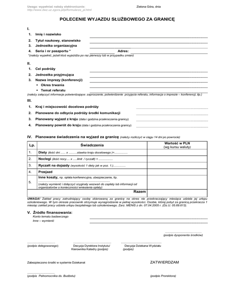 Uwaga: wypełniać należy elektronicznie: http://www.dwz.uz.zgora.pl/pl/formularze_pl.html Zielona Góra, dnia POLECENIE WYJAZDU SŁUŻBOWEGO ZA GRANICĘ I. 1. Imię i nazwisko 2. Tytuł naukowy, stanowisko 3. Jednostka organizacyjna 4. Seria i nr paszportu * Adres: *(należy wypełnić, jeżeli ktoś wyjeżdża po raz pierwszy lub w przypadku zmian) II. 1. Cel podróży 2. Jednostka przyjmująca 3. Nazwa imprezy (konferencji) Okres trwania Temat referatu (należy załączyć informacje potwierdzające: zaproszenie, potwierdzenie przyjęcia referatu, informacja o imprezie – konferencji, itp.) III. 1. Kraj i miejscowość docelowa podróży 2. Planowane do odbycia podróży środki komunikacji 3. Planowany wyjazd z kraju (data i godzina przekroczenia granicy) 4. Planowany powrót do kraju (data i godzina przekroczenia granicy) IV. Planowane świadczenia na wyjazd za granicę (należy rozliczyć w ciągu 14 dni po powrocie) Lp. Wartość w PLN (wg kursu waluty) Świadczenia 1. Diety (ilość dni ...... x ..........stawka kraju docelowego )=................ 2. Noclegi (ilość nocy.... x .....limit / ryczałt) = ................. 3. Ryczałt na dojazdy (wysokość 1 diety jak w poz. 1.)............... 4. Przejazd 5. Inne koszty, np. opłata konferencyjna, ubezpieczenie, itp. ...................................................................................... (należy wymienić i dołączyć oryginały wezwań do zapłaty lub informacji od organizatorów o konieczności wniesienia opłaty) Razem UWAGA! Zakład pracy zatrudniający osobę skierowaną za granicę na okres nie przekraczający miesiąca udziela jej urlopu szkoleniowego. W tym okresie pracownik otrzymuje wynagrodzenie w pełnej wysokości. Osobie, której pobyt za granicą przekracza 1 miesiąc zakład pracy udziela urlopu bezpłatnego lub szkoleniowego. Zarz. MENiS z dn. 07.04.2005 r. (Dz.U. 05.69.613). V. Źródło finansowania: Konto tematu badawczego Inne – wymienić .................................……… (podpis dysponenta środków) ..………......………… (podpis delegowanego) .........…………………........... Decyzja Dyrektora Instytutu/ Kierownika Katedry (podpis) ……………….....……… Decyzja Dziekana Wydziału (podpis) Zabezpieczono środki w systemie Dziekanat ZATWIERDZAM ................................. (podpis Pełnomocnika ds. Budżetu) (podpis Prorektora)