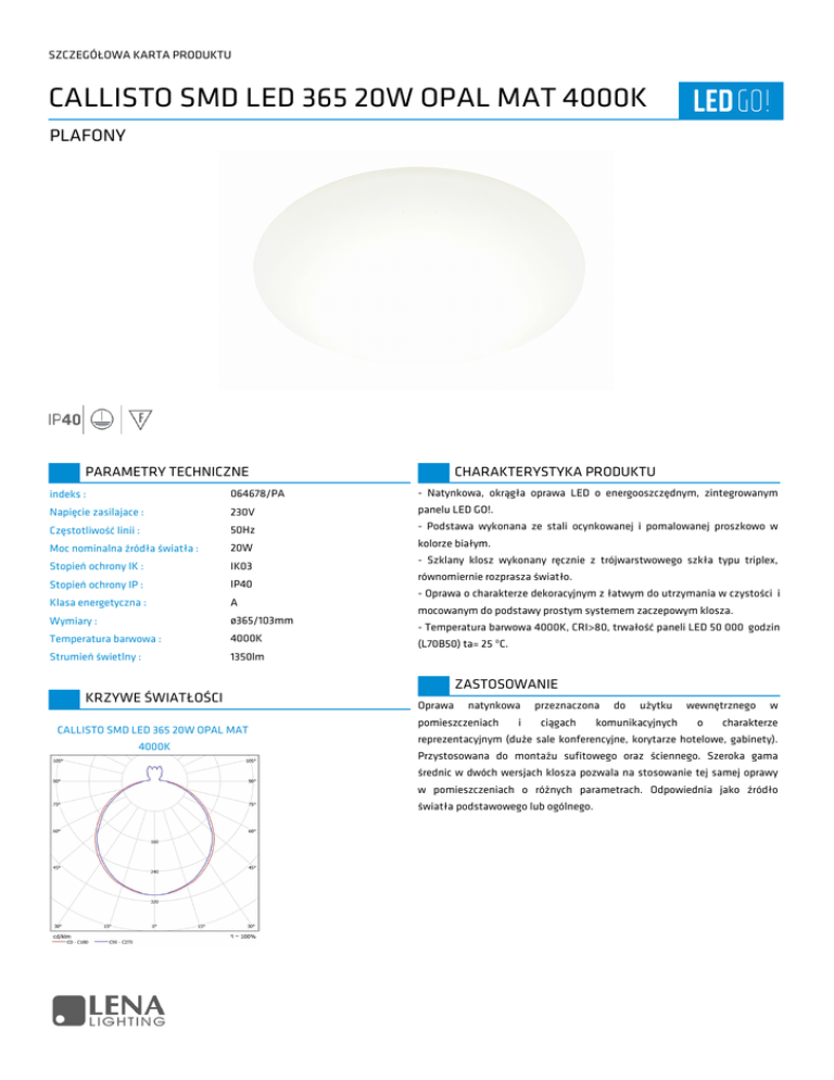 SZCZEGÓŁOWA KARTA PRODUKTU CALLISTO SMD LED 365 20W OPAL MAT 4000K PLAFONY PARAMETRY TECHNICZNE indeks : 064678/PA - Natynkowa, okrągła oprawa LED o energooszczędnym, zintegrowanym Napięcie zasilajace : 230V panelu LED GO!. Częstotliwość linii : 50Hz - Podstawa wykonana ze stali ocynkowanej i pomalowanej proszkowo w Moc nominalna źródła światła : 20W kolorze białym. Stopień ochrony IK : IK03 Stopień ochrony IP : IP40 Klasa energetyczna : A Wymiary : ø365/103mm Temperatura barwowa : 4000K Strumień świetlny : 1350lm - Szklany klosz wykonany ręcznie z trójwarstwowego szkła typu triplex, równomiernie rozprasza światło. - Oprawa o charakterze dekoracyjnym z łatwym do utrzymania w czystości i mocowanym do podstawy prostym systemem zaczepowym klosza. - Temperatura barwowa 4000K, CRI>80, trwałość paneli LED 50 000 godzin (L70B50) ta= 25 ºC. CHARAKTERYSTYKA PRODUKTU KRZYWE ŚWIATŁOŚCI CALLISTO SMD LED 365 20W OPAL MAT 4000K Oprawa ZASTOSOWANIE natynkowa pomieszczeniach i przeznaczona ciągach do użytku komunikacyjnych wewnętrznego o w charakterze reprezentacyjnym (duże sale konferencyjne, korytarze hotelowe, gabinety). Przystosowana do montażu sufitowego oraz ściennego. Szeroka gama średnic w dwóch wersjach klosza pozwala na stosowanie tej samej oprawy w pomieszczeniach o różnych parametrach. Odpowiednia jako źródło światła podstawowego lub ogólnego. SZCZEGÓŁOWA KARTA PRODUKTU CALLISTO SMD LED 365 20W OPAL MAT 4000K PLAFONY TABELA PARAMETRÓW TECHNICZNYCH indeks: 064678/PA Napięcie zasilajace: 230V Częstotliwość linii: 50Hz Moc nominalna źródła światła: 20W Stopień ochrony IK: IK03 Stopień ochrony IP: IP40 Skuteczność świetlna: 68lm/W Klasa energetyczna: A Klasa ochrony: I Wymiary: ø365/103mm Waga: 2,3kg Materiał korpusu: Blacha ocynkowana Temperatura barwowa: 4000K Strumień świetlny: 1350lm Moc znamionowa oprawy: 25,3W Kod EAN: 5905963064678 Materiał klosza: Szkło Rodzaj klosza: OPAL MAT Źródło światła: LED GO! www.lenalighting.pl | Strona 2 SZCZEGÓŁOWA KARTA PRODUKTU CALLISTO SMD LED 365 20W OPAL MAT 4000K PLAFONY RYSUNKI TECHNICZNE A=365 B=103 R=97 SZCZEGÓŁY TECHNICZNE Data aktualizacji karty: 2016-01-27 42/2013 www.lenalighting.pl | Strona 3