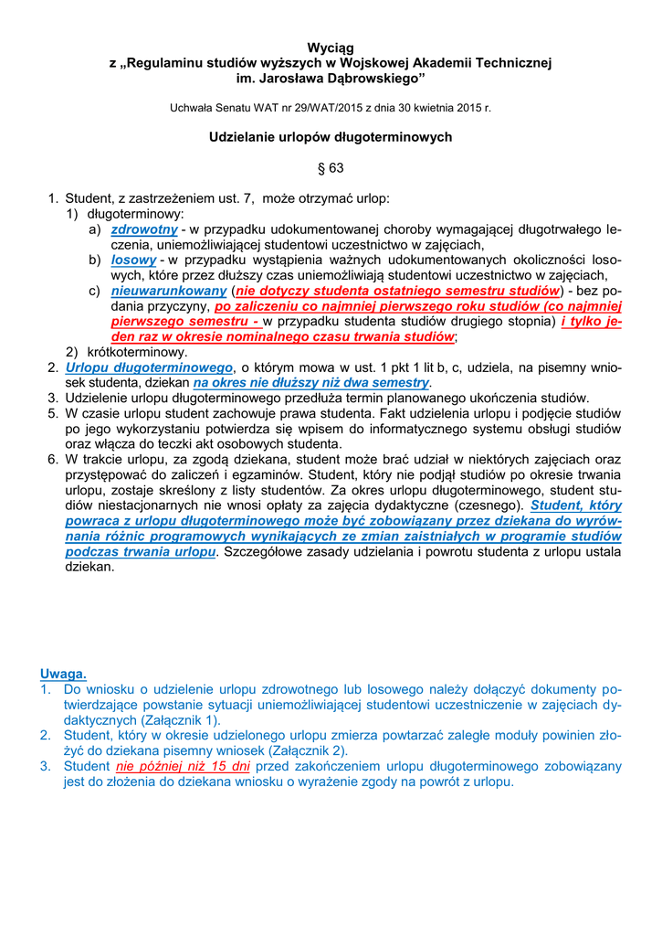 Wyciąg z „Regulaminu studiów wyższych w Wojskowej Akademii Technicznej im. Jarosława Dąbrowskiego” Uchwała Senatu WAT nr 29/WAT/2015 z dnia 30 kwietnia 2015 r. Udzielanie urlopów długoterminowych § 63 1. Student, z zastrzeżeniem ust. 7, może otrzymać urlop: 1) długoterminowy: a) zdrowotny - w przypadku udokumentowanej choroby wymagającej długotrwałego leczenia, uniemożliwiającej studentowi uczestnictwo w zajęciach, b) losowy - w przypadku wystąpienia ważnych udokumentowanych okoliczności losowych, które przez dłuższy czas uniemożliwiają studentowi uczestnictwo w zajęciach, c) nieuwarunkowany (nie dotyczy studenta ostatniego semestru studiów) - bez podania przyczyny, po zaliczeniu co najmniej pierwszego roku studiów (co najmniej pierwszego semestru - w przypadku studenta studiów drugiego stopnia) i tylko jeden raz w okresie nominalnego czasu trwania studiów; 2) krótkoterminowy. 2. Urlopu długoterminowego, o którym mowa w ust. 1 pkt 1 lit b, c, udziela, na pisemny wniosek studenta, dziekan na okres nie dłuższy niż dwa semestry. 3. Udzielenie urlopu długoterminowego przedłuża termin planowanego ukończenia studiów. 5. W czasie urlopu student zachowuje prawa studenta. Fakt udzielenia urlopu i podjęcie studiów po jego wykorzystaniu potwierdza się wpisem do informatycznego systemu obsługi studiów oraz włącza do teczki akt osobowych studenta. 6. W trakcie urlopu, za zgodą dziekana, student może brać udział w niektórych zajęciach oraz przystępować do zaliczeń i egzaminów. Student, który nie podjął studiów po okresie trwania urlopu, zostaje skreślony z listy studentów. Za okres urlopu długoterminowego, student studiów niestacjonarnych nie wnosi opłaty za zajęcia dydaktyczne (czesnego). Student, który powraca z urlopu długoterminowego może być zobowiązany przez dziekana do wyrównania różnic programowych wynikających ze zmian zaistniałych w programie studiów podczas trwania urlopu. Szczegółowe zasady udzielania i powrotu studenta z urlopu ustala dziekan. Uwaga. 1. Do wniosku o udzielenie urlopu zdrowotnego lub losowego należy dołączyć dokumenty potwierdzające powstanie sytuacji uniemożliwiającej studentowi uczestniczenie w zajęciach dydaktycznych (Załącznik 1). 2. Student, który w okresie udzielonego urlopu zmierza powtarzać zaległe moduły powinien złożyć do dziekana pisemny wniosek (Załącznik 2). 3. Student nie później niż 15 dni przed zakończeniem urlopu długoterminowego zobowiązany jest do złożenia do dziekana wniosku o wyrażenie zgody na powrót z urlopu. Załącznik 1 Załącznik 2