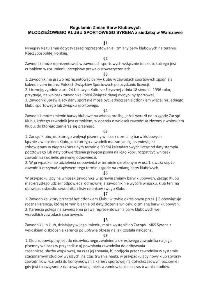 Regulamin Zmian Barw Klubowych MŁODZIEŻOWEGO KLUBU SPORTOWEGO SYRENA z siedzibą w Warszawie §1 Niniejszy Regulamin dotyczy zasad reprezentowania i zmiany barw klubowych na terenie Rzeczypospolitej Polskiej. §2 Zawodnik może reprezentować w zawodach sportowych wyłącznie ten klub, którego jest członkiem w rozumieniu przepisów prawa o stowarzyszeniach. §3 1. Zawodnik ma prawo reprezentować barwy klubu w zawodach sportowych zgodnie z kalendarzem imprez Polskich Związków Sportowych po uzyskaniu licencji. 2. Licencję, zgodnie z art. 24 Ustawy o Kulturze Fizycznej z dnia 18 stycznia 1996 roku, przyznaje, na wniosek zawodnika Polski Związek danej dyscypliny sportowej. 3. Zawodnik uprawiający dany sport nie może być jednocześnie członkiem więcej niż jednego klubu sportowego lub Związku sportowego. §4 Zawodnik może zmienić barwy klubowe na własną prośbę, jeżeli wyraził na to zgodę Zarząd Klubu, którego zawodnik jest członkiem, w oparciu o wniosek zawodnika złożony z wnioskiem Klubu, do którego zamierza się przenieść. §5 1. Zarząd Klubu, do którego wpłynął pisemny wniosek o zmianę barw klubowych łącznie z wnioskiem Klubu, do którego zawodnik ma zamiar się przenieść jest zobowiązany w nieprzekraczalnym terminie 30 dni kalendarzowych licząc od daty stempla pocztowego lub daty potwierdzenia przyjęcia pisma na jego kopii, rozpatrzyć wniosek zawodnika i udzielić pisemnej odpowiedzi. 2. W przypadku nie udzielenia odpowiedzi w terminie określonym w ust.1. uważa się, że zawodnik otrzymał z upływem tego terminu zgodę na zmianę barw klubowych. §6 W przypadku, gdy na wniosek zawodnika w sprawie zmiany barw klubowych, Zarząd Klubu macierzystego udzielił odpowiedzi odmownej a zawodnik nie wycofa wniosku, klub ten ma obowiązek skreślić zawodnika z listy członków swego Klubu. §7 1. Zawodnika, który przestał być członkiem Klubu w trybie określonym przez § 6 obowiązuje roczna karencja, której termin biegnie od daty złożenia wniosku o zmianę barw klubowych. 2. Karencja polega na zawieszeniu prawa reprezentowania barw klubowych we wszystkich zawodach sportowych. §8 Zawodnik lub klub, działający w jego imieniu, może wystąpić do Zarządu MKS Syrena z wnioskiem o skrócenie karencji po upływie okresu na jaki została nałożona. §9 1. Klub zobowiązany jest do niezwłocznego zwolnienia okresowego zawodnika na jego pisemny wniosek w przypadku: a) powołania zawodnika do odbywania zasadniczej służby wojskowej, na czas jej trwania, b) podjęcia przez zawodnika w systemie stacjonarnym studiów wyższych, na czas trwania nauki, w przypadku gdy nowy klub stworzy zawodnikowi warunki do kontynuowania kariery sportowej na dotychczasowym poziomie i gdy jest to związane z czasową zmianą miejsca zamieszkania na czas trwania studiów. 2. Za termin rozpoczęcia studiów przyjmuje się pierwszy dzień nauki na danej uczelni, a służby wojskowej z dniem wcielenia do jednostki. 3. Po ustaniu przyczyn zwolnienia okresowego, zawodnik zobowiązany jest do reprezentowania barw klubu macierzystego tracąc jednocześnie te uprawnienia w stosunku do klubu, który reprezentował w czasie zwolnienia okresowego. 4. Zawodnik, który zamierza na stałe zostać członkiem klubu, którego barwy reprezentuje w czasie zwolnienia okresowego, zobowiązany jest do zmiany barw klubowych na zasadach ogólnych. § 10 Klub MKS Syrena zawiadamia Polski Związek o każdym przypadku złożenia wniosku o zmianę barw klubowych przez zawodnika będącego członkiem kadry narodowej seniorów i juniorów, w ciągu 30 dni od daty złożenia wniosku przez zawodnika. § 11 Wniosek o zmianę barw klubowych przez zawodnika, który nie ukończył 18 lat, wymaga pisemnej zgody rodziców lub prawnych opiekunów zawodnika. § 12 W przypadku stałej zmiany miejsca zamieszkania przez rodziców lub opiekunów prawnych zawodnika wraz z samym zawodnikiem do miejscowości położonej poza miejscem siedziby klubu, który zawodnik dotychczas reprezentował, klub ten zobowiązany jest udzielić definitywnego zwolnienia do klubu położonego w nowym miejscu zamieszkania zawodnika, na jego pisemny wniosek. § 13 1. Zawodnik nie może reprezentować barw więcej niż jednego klubu w rocznym sezonie startowym. 2. Ograniczenie wymienione w ust. 1 nie dotyczy zawodnika, który: a) uzyskał zwolnienie z klubu na skutek likwidacji sekcji, b) zmienił okresowo barwy klubowe w trybie § 9 ust. 1 i wraca do klubu macierzystego w trybie § 9 ust.3, c) pozostaje na stałe w klubie, który reprezentował w czasie zwolnienia okresowego. § 14 Zmiana barw klubowych przez zawodnika kadry narodowej seniorów i juniorów oraz posiadającego klasę mistrzowską międzynarodową i mistrzowską wymaga zatwierdzenia przez Zarząd Polskiego Związku. § 15 1. Klub, do którego przechodzi zawodnik w wyniku zmiany barw klubowych, na żądanie klubu, którego barw zawodnik reprezentował dotychczas, zrekompensuje ze środków własnych jednorazowy ekwiwalent za wyszkolenie zawodnika. 2. Ekwiwalent za wyszkolenie zawodnika może być ustalony w formie rzeczowej lub finansowej. 3. Wysokość ekwiwalentu za wyszkolenie zawodnika wynosi odpowiednio przy przejściu zawodnika posiadającego: a) klasę mistrzowską międzynarodowa i b) klasę mistrzowską, - od równowartości 15 000 zł do 25 000 zł - 90% wysokości obustronnie uzgodnionego ekwiwalentu, zaś pozostałe 10% wpłaca na konto Polskiego Związku c) klasę pierwszą - od równowartości 10 000 zł do 15 000 zł - 90% wysokości obustronnie uzgodnionego ekwiwalentu, zaś pozostałe 10% wpłaca na konto Polskiego Związku d) klasę drugą - równowartość 5 000 zł e) klasę trzecią – równowartość 3 000 zł f) klasę młodzika – równowartość 1 000 zł § 16 Przejście zawodnika, o którym mowa w § 15 powinno być potwierdzone pisemną umową między zainteresowanymi klubami oraz dokumentem bankowym stwierdzającym zapłacenie ustalonej kwo
