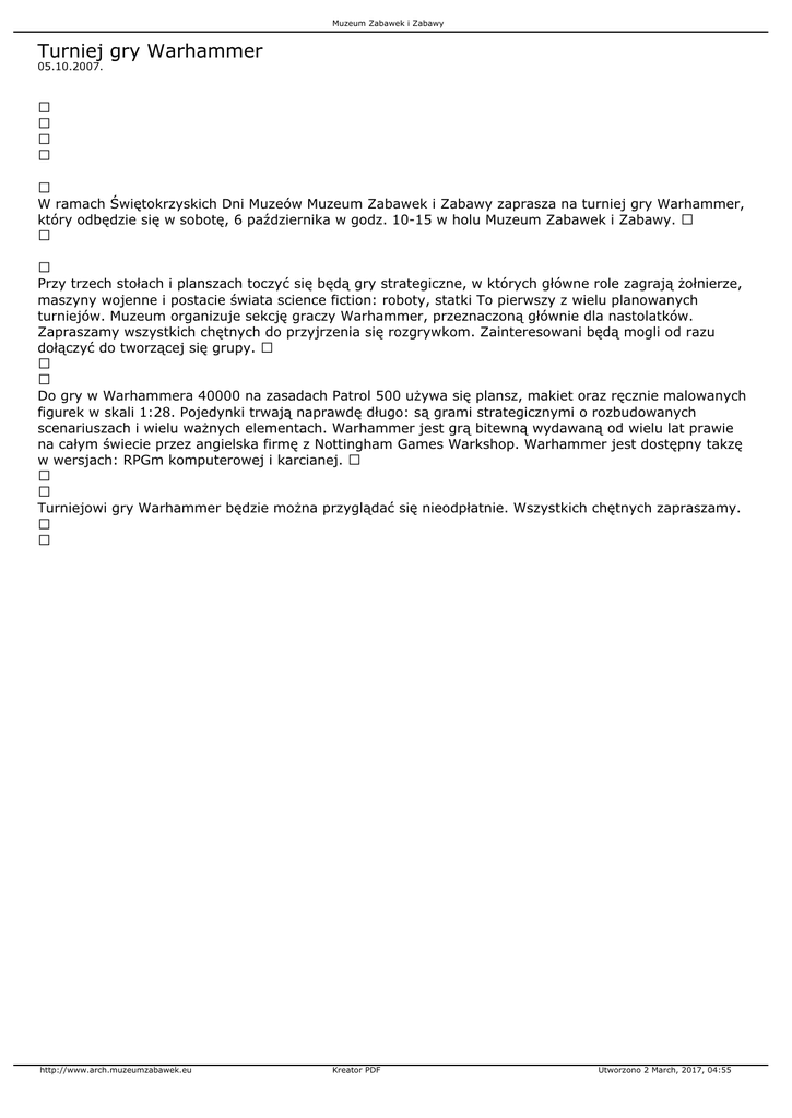 Muzeum Zabawek i Zabawy Turniej gry Warhammer 05.10.2007. W ramach Świętokrzyskich Dni Muzeów Muzeum Zabawek i Zabawy zaprasza na turniej gry Warhammer, który odbędzie się w sobotę, 6 października w godz. 10-15 w holu Muzeum Zabawek i Zabawy. Przy trzech stołach i planszach toczyć się będą gry strategiczne, w których główne role zagrają żołnierze, maszyny wojenne i postacie świata science fiction: roboty, statki To pierwszy z wielu planowanych turniejów. Muzeum organizuje sekcję graczy Warhammer, przeznaczoną głównie dla nastolatków. Zapraszamy wszystkich chętnych do przyjrzenia się rozgrywkom. Zainteresowani będą mogli od razu dołączyć do tworzącej się grupy. Do gry w Warhammera 40000 na zasadach Patrol 500 używa się plansz, makiet oraz ręcznie malowanych figurek w skali 1:28. Pojedynki trwają naprawdę długo: są grami strategicznymi o rozbudowanych scenariuszach i wielu ważnych elementach. Warhammer jest grą bitewną wydawaną od wielu lat prawie na całym świecie przez angielska firmę z Nottingham Games Warkshop. Warhammer jest dostępny takzę w wersjach: RPGm komputerowej i karcianej. Turniejowi gry Warhammer będzie można przyglądać się nieodpłatnie. Wszystkich chętnych zapraszamy. http://www.arch.muzeumzabawek.eu Kreator PDF Utworzono 2 March, 2017, 04:55