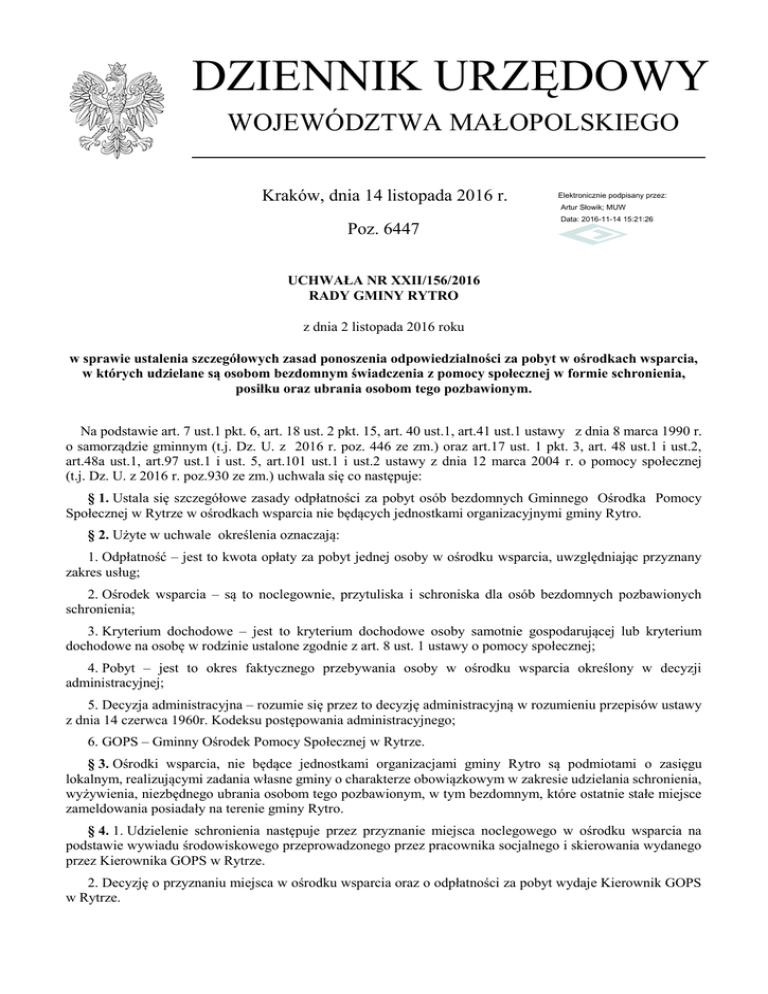 DZIENNIK URZĘDOWY WOJEWÓDZTWA MAŁOPOLSKIEGO Kraków, dnia 14 listopada 2016 r. Elektronicznie podpisany przez: Artur Słowik; MUW Poz. 6447 Data: 2016-11-14 15:21:26 UCHWAŁA NR XXII/156/2016 RADY GMINY RYTRO z dnia 2 listopada 2016 roku w sprawie ustalenia szczegółowych zasad ponoszenia odpowiedzialności za pobyt w ośrodkach wsparcia, w których udzielane są osobom bezdomnym świadczenia z pomocy społecznej w formie schronienia, posiłku oraz ubrania osobom tego pozbawionym. Na podstawie art. 7 ust.1 pkt. 6, art. 18 ust. 2 pkt. 15, art. 40 ust.1, art.41 ust.1 ustawy z dnia 8 marca 1990 r. o samorządzie gminnym (t.j. Dz. U. z 2016 r. poz. 446 ze zm.) oraz art.17 ust. 1 pkt. 3, art. 48 ust.1 i ust.2, art.48a ust.1, art.97 ust.1 i ust. 5, art.101 ust.1 i ust.2 ustawy z dnia 12 marca 2004 r. o pomocy społecznej (t.j. Dz. U. z 2016 r. poz.930 ze zm.) uchwala się co następuje: § 1. Ustala się szczegółowe zasady odpłatności za pobyt osób bezdomnych Gminnego Ośrodka Pomocy Społecznej w Rytrze w ośrodkach wsparcia nie będących jednostkami organizacyjnymi gminy Rytro. § 2. Użyte w uchwale określenia oznaczają: 1. Odpłatność – jest to kwota opłaty za pobyt jednej osoby w ośrodku wsparcia, uwzględniając przyznany zakres usług; 2. Ośrodek wsparcia – są to noclegownie, przytuliska i schroniska dla osób bezdomnych pozbawionych schronienia; 3. Kryterium dochodowe – jest to kryterium dochodowe osoby samotnie gospodarującej lub kryterium dochodowe na osobę w rodzinie ustalone zgodnie z art. 8 ust. 1 ustawy o pomocy społecznej; 4. Pobyt – jest to okres faktycznego przebywania osoby w ośrodku wsparcia określony w decyzji administracyjnej; 5. Decyzja administracyjna – rozumie się przez to decyzję administracyjną w rozumieniu przepisów ustawy z dnia 14 czerwca 1960r. Kodeksu postępowania administracyjnego; 6. GOPS – Gminny Ośrodek Pomocy Społecznej w Rytrze. § 3. Ośrodki wsparcia, nie będące jednostkami organizacjami gminy Rytro są podmiotami o zasięgu lokalnym, realizującymi zadania własne gminy o charakterze obowiązkowym w zakresie udzielania schronienia, wyżywienia, niezbędnego ubrania osobom tego pozbawionym, w tym bezdomnym, które ostatnie stałe miejsce zameldowania posiadały na terenie gminy Rytro. § 4. 1. Udzielenie schronienia następuje przez przyznanie miejsca noclegowego w ośrodku wsparcia na podstawie wywiadu środowiskowego przeprowadzonego przez pracownika socjalnego i skierowania wydanego przez Kierownika GOPS w Rytrze. 2. Decyzję o przyznaniu miejsca w ośrodku wsparcia oraz o odpłatności za pobyt wydaje Kierownik GOPS w Rytrze. Dziennik Urzędowy Województwa Małopolskiego –2– Poz. 6447 3. W nagłych przypadkach zgodę na udzielenie schronienia podejmuje pracownik nadzorujący ośrodek wsparcia po czym niezwłocznie zgłasza ten fakt pracownikowi socjalnemu GOPS w Rytrze. § 5. 1. Pomoc w formie nieodpłatnego schronienia przysługuje osobom tego pozbawionym, w tym bezdomnym, które ostatnie stałe miejsce zameldowania miały na terenie gminy Rytro, nie posiadające własnego źródła utrzymania. 2. Pobyt w ośrodku przysługuje nieodpłatnie osobie, której dochód nie przekracza kryterium dochodowego określonego w ustawie z dnia 12 marca 2004r.o pomocy społecznej (t.j. Dz. U. z 2016r. poz.930 ze zm.). 3. Dla osób, których dochód przekracza kryterium dochodowe ustala się odpłatność za pobyt w ośrodku wsparcia zgodnie z tabelą w § 7 ust.1 niniejszej uchwały. § 6. Pobyt w ośrodkach wsparcia jest odpłatny z zastrzeżeniem § 8 ust. 1 § 7. 1. Opłaty za pobyt w ośrodkach wsparcia ustala się według poniższej tabeli: Wysokość odpłatności za pobyt i posiłek w % liczona od dochodu osoby przebywającej w ośrodku wsparcia Procentowy stosunek dochodu osiąganego przez osobę do kryterium dochodowego nieodpłatnie do 100% 30% powyżej 100% do 150% 50% powyżej 150% do 200% 70% 100% powyżej 200% do 250% powyżej 250% 2. Dobowy koszt utrzymania świadczeniobiorcy, zasady regulowania odpłatności oraz szczegółowe zasady funkcjonowania ośrodka wsparcia ustalone będą na podstawie porozumienia zawartego pomiędzy Kierownikiem GOPS w Rytrze, a Kierownikiem ośrodka wsparcia na terenie którego przebywa osoba skierowana przez GOPS. § 8. 1. Ze względu na trudną sytuację zdrowotną lub osobistą osoby przebywającej w ośrodku wsparcia, opłata może być ustalona w wysokości niższej niż określona w niniejszej uchwale, albo osoba może być całkowicie zwolniona z opłaty na okres wynikający z okoliczności sprawy. 2. Obniżenie lub całkowite zwolnienie z opłat następuje na wniosek osoby przebywającej w ośrodku wsparcia. 3. Obniżenie bądź też całkowite zwolnienie z opłat nie może przekracza 3 miesięcy w ciągu roku kalendarzowego. § 9. Wykonanie uchwały powierza się Wójtowi Gminy Rytro § 10. Uchwała wchodzi w życie po upływie 14 dni od daty ogłoszenia w Dzienniku Urzędowym Województwa Małopolskiego. Przewodniczący Rady Gminy Rytro Tomasz Kulig