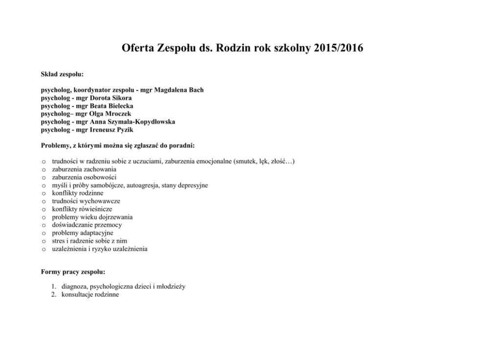 Oferta Zespołu ds. Rodzin rok szkolny 2015/2016