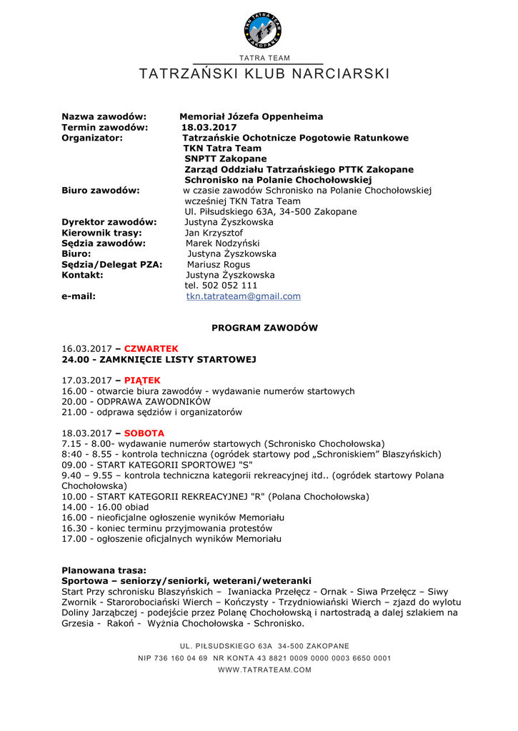 T AT RA T EA M TA TR Z AŃS KI KLU B NA RC I ARSK I Nazwa zawodów: Termin zawodów: Organizator: Biuro zawodów: Dyrektor zawodów: Kierownik trasy: Sędzia zawodów: Biuro: Sędzia/Delegat PZA: Kontakt: e-mail: Memoriał Józefa Oppenheima 18.03.2017 Tatrzańskie Ochotnicze Pogotowie Ratunkowe TKN Tatra Team SNPTT Zakopane Zarząd Oddziału Tatrzańskiego PTTK Zakopane Schronisko na Polanie Chochołowskiej w czasie zawodów Schronisko na Polanie Chochołowskiej wcześniej TKN Tatra Team Ul. Piłsudskiego 63A, 34-500 Zakopane Justyna Żyszkowska Jan Krzysztof Marek Nodzyński Justyna Żyszkowska Mariusz Rogus Justyna Żyszkowska tel. 502 052 111 [email protected] PROGRAM ZAWODÓW 16.03.2017 – CZWARTEK 24.00 - ZAMKNIĘCIE LISTY STARTOWEJ 17.03.2017 – PIĄTEK 16.00 - otwarcie biura zawodów - wydawanie numerów startowych 20.00 - ODPRAWA ZAWODNIKÓW 21.00 - odprawa sędziów i organizatorów 18.03.2017 – SOBOTA 7.15 - 8.00- wydawanie numerów startowych (Schronisko Chochołowska) 8:40 - 8.55 - kontrola techniczna (ogródek startowy pod „Schroniskiem” Blaszyńskich) 09.00 - START KATEGORII SPORTOWEJ "S" 9.40 – 9.55 – kontrola techniczna kategorii rekreacyjnej itd.. (ogródek startowy Polana Chochołowska) 10.00 - START KATEGORII REKREACYJNEJ "R" (Polana Chochołowska) 14.00 - 16.00 obiad 16.00 - nieoficjalne ogłoszenie wyników Memoriału 16.30 - koniec terminu przyjmowania protestów 17.00 - ogłoszenie oficjalnych wyników Memoriału Planowana trasa: Sportowa – seniorzy/seniorki, weterani/weteranki Start Przy schronisku Blaszyńskich – Iwaniacka Przełęcz - Ornak - Siwa Przełęcz – Siwy Zwornik - Starorobociański Wierch – Kończysty - Trzydniowiański Wierch – zjazd do wylotu Doliny Jarząbczej - podejście przez Polanę Chochołowską i nartostradą a dalej szlakiem na Grzesia - Rakoń - Wyżnia Chochołowska - Schronisko. UL . PI ŁS UDSKIE GO 63A 34 -500 Z AKOP ANE NIP 7 3 6 16 0 0 4 69 NR KO NT A 43 8821 0009 0000 00 03 6650 0001 WWW .TAT RATE A M. CO M T AT RA T EA M TA TR Z AŃS KI KLU B NA RC I ARSK I Powyższa opcja jest trasą maksymalną przy sprzyjających warunkach śnieżnych, atmosferycznych i lawinowych. Na trasie będzie obowiązywał limit czasowy przy wyjściu od schroniska na Grzesia. Limity zostaną podane na odprawie technicznej. W razie niekorzystnych warunków trasa może zostać zmieniona do krótszego wariantu planowanej trasy. Rekreacyjna i Sportowa - juniorzy/juniorki, kadeci/kadetki, nestorzy/nestorki Start na Polanie Chochołowskiej – Grześ – Rakoń – Wyżnia Chochołowska – Polana Chochołowska Regulamin Memoriału Józefa Oppenheima WARUNKI KLASYFIKACJI §1 W Memoriale klasyfikowani są wszyscy zawodnicy posiadający ważne badania lekarskie (weryfikacja na podstawie oświadczenia zawodnika), którzy ukończą zawody. FORMUŁA ZAWODÓW §2 Konkurencja indywidualna, pomiar czasu start-meta, start wspólny. KATEGORIE ZAWODNIKÓW §3 1. Zawody rozgrywane są w dwóch głównych kategoriach - rekreacyjnej i sportowej. W kategorii rekreacyjnej są dwie podkategorie - podział ze względu na płeć - kobiety i mężczyźni. 2. W kategorii sportowej Zawodnicy klasyfikowani są w sześciu kategoriach w zależności od płci i wieku (decyduje rok urodzenia) kategoria podkategoria wiek w latach rok urodzenia kadetka / kadet 15 - 16 - 17 2002 – 2001 – 2000 juniorka / junior 18 - 19 - 20 1999 – 1998 – 1997 21 do 40 1993 – 1977 41 do 50 1976 – 1967 51 do 60 1966 – 1957 seniorka / senior weteranka / weteran nestorka / nestor UL . PI ŁS UDSKIE GO 63A 34 -500 Z AKOP ANE NIP 7 3 6 16 0 0 4 69 NR KO NT A 43 8821 0009 0000 00 03 6650 0001 WWW .TAT RATE A M. CO M T AT RA T EA M TA TR Z AŃS KI KLU B NA RC I ARSK I SPRZĘT I WYPOSAŻENIE ZAWODNIKÓW §4 Artykuły wyliczone poniżej muszą spełniać wymogi europejskie (EU) lub wymogi UIAA oraz CE lub wymogi ISMF. §5 Podstawowe obowiązkowe wyposażenie zawodnika: 1. 2. 3. 4. 5. 6. 7. Narty wyposażone w metalowe krawędzie na co najmniej 90% ich długości, o szerokości co najmniej 60 mm pod butem, 80 mm z przodu i 70 mm z tyłu. Narty muszą mieć co najmniej 160 cm długości dla mężczyzn z wyjątkiem kadetów i 150 cm dla kobiet i kadetów. Wiązania muszą umożliwiać ruch pięty podczas podchodzenia lub zjazdu i mogą, lecz nie muszą, być wyposażone w paski zabezpieczające, na ryzyko zawodnika. Zarówno przednia, jak i tylna część wiązań muszą być jednego producenta i nie mogą być modyfikowane. Tylna część wiązania musi zapewniać bezpieczne wypinanie w płaszczyźnie przód-tył, jak i na boki (w płaszczyźnie prostopadłej), przednia część wiązania nie musi mieć bezpiecznika pod warunkiem informacji producenta o braku bezpiecznika. Ciężar minimalny jednej narty z wiązaniem to 700g dla kobiet i kadetów, 750g dla mężczyzn. Buty muszą zakrywać kostkę i posiadać podeszwy typu Vibram lub podobne, przy czym podeszwa taka musi zajmować przynajmniej 75% powierzchni podeszwy, a nacięcia w niej muszą być głębokie na minimum 4 mm. Minimalna liczba nacięć podeszwy: 8 na obcasie i 15 w części przedniej. (Minimalna powierzchnia nacięcia: 1cm2). Buty muszą być przystosowane do zamocowania na nich metalowych raków i muszą być zapinane na minimum dwie klamry. Ciężar jednego buta z suchym botkiem to 450g dla kobiet i kadetów, 500g dla mężczyzn. Skorupy butów nie mogą być modyfikowane. Jedyny dopuszczony przypadek modyfikacji, to modyfikacja przez innego producenta, który ma na to zgodę producenta butów. Skorupa nie może być oklejana taśmą. Para kijków narciarskich alpejskich lub biegowych maksymalnej średnicy 25 mm z kółkami z tworzywa innego niż metal. Para fok. Muszą pokrywać przynajmniej 50% powierzchni ślizgu oraz min. 50% długości narty. Ze względu na zasady ochrony środowiska nie wolno stosować taśm samoprzylepnych i innych środków zwiększających przyczepność lub poślizg fok. Ubranie dolnej po